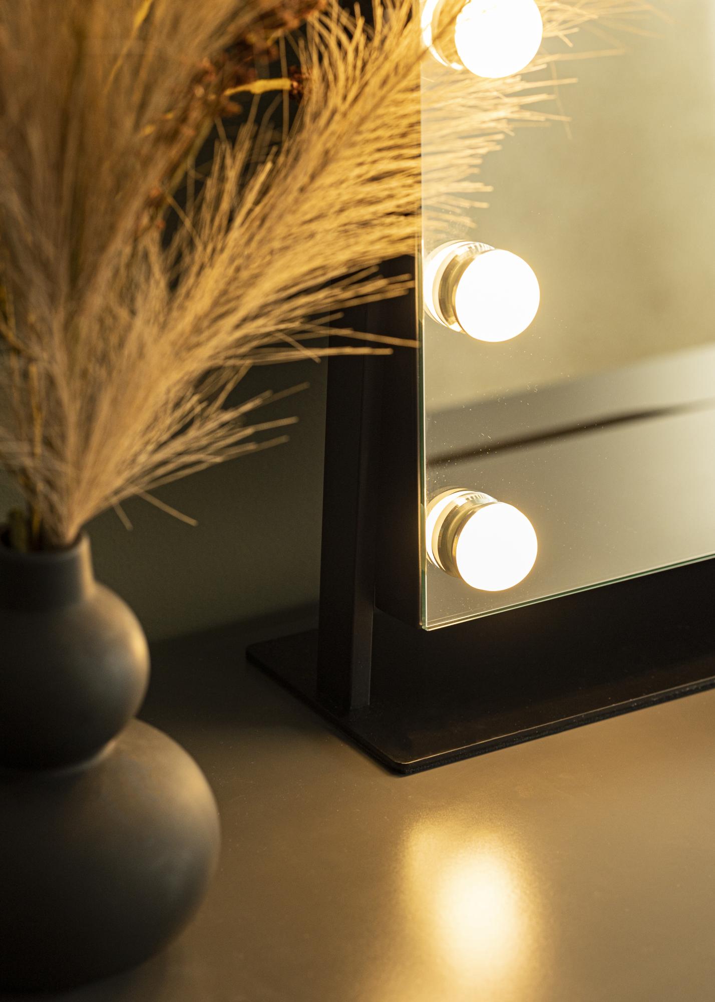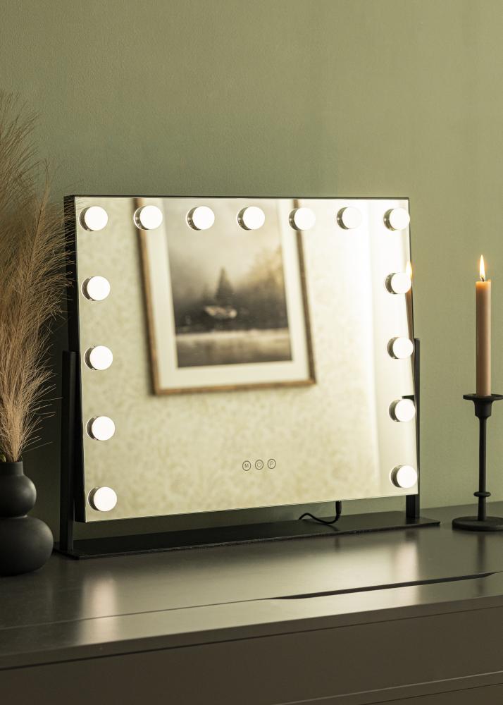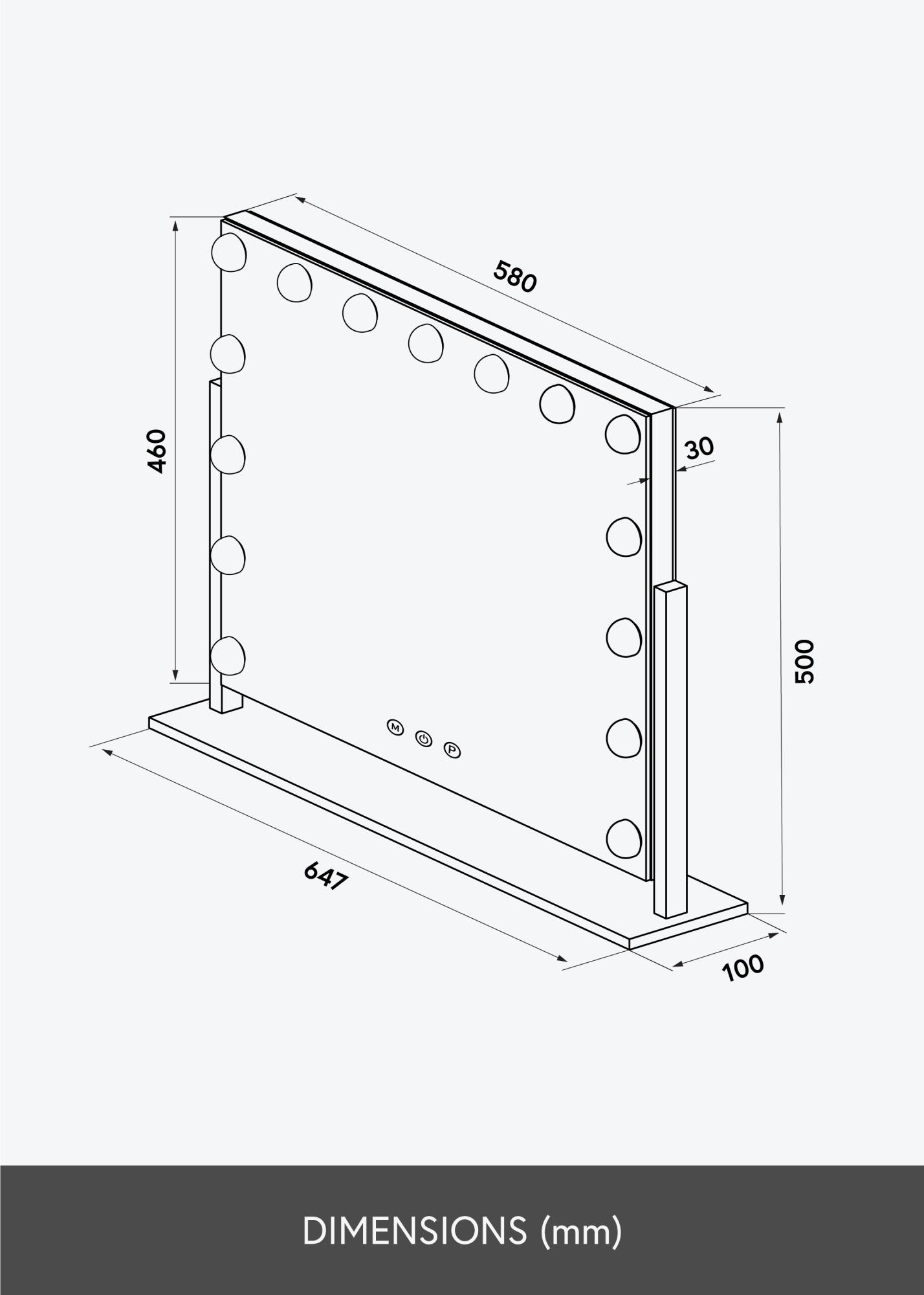Ez a sminktükör kellemes megvilágítást biztosít 3000K-6000K között, amikor nézegeti magát, miközben stílusos lakberendezési elem, amely feldobja bármely szobát. A beépített LED-világítás elegánsan van elhelyezve, mint egy keret a tükörfelület körül, és nagyobb rugalmasságot kínál, mivel a fényt lehet halványítani és állítani a színhőmérsékletét. A fénybeállításokat a tükör alsó szélén található érintőgombok segítségével lehet végrehajtani. A gombokat betűk jelölik, a "P" a fényerő állítására, és az "M" a színhőmérséklet beállítására. Itt található egy be-/kikapcsoló gomb is, hogy a tükör világítását be- és kikapcsolja. Az elektromos csatlakozás dugaszolóaljzat segítségével történik.