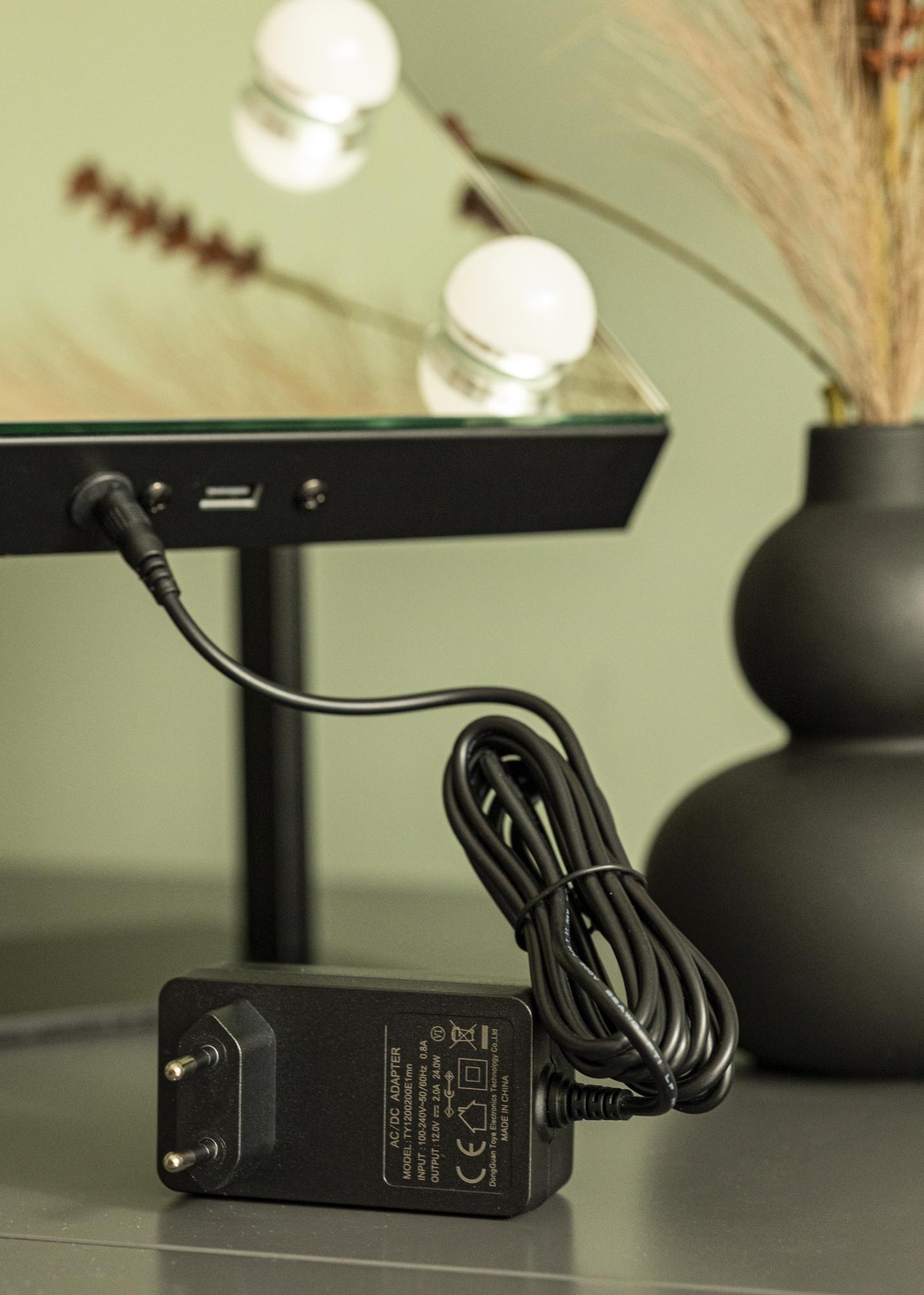 A sminktükör fekete színű fémből készült, egy talppal, amely lehetővé teszi, hogy sík felületen állva helyezze el. Az 58x46 cm-es tükörfelületet a kívánt pozícióba lehet dönteni. A tükör alsó peremén egy USB-csatlakozás található, így tükröződés közben is töltheti okostelefonját.