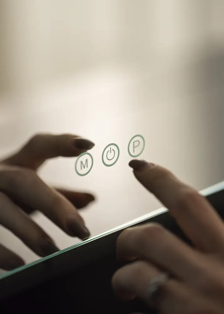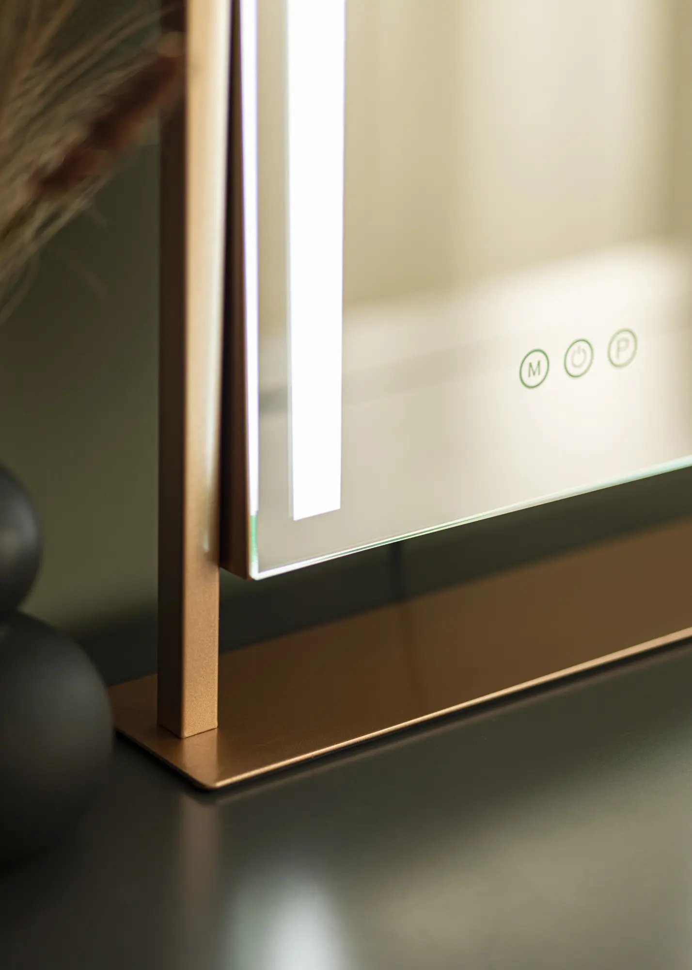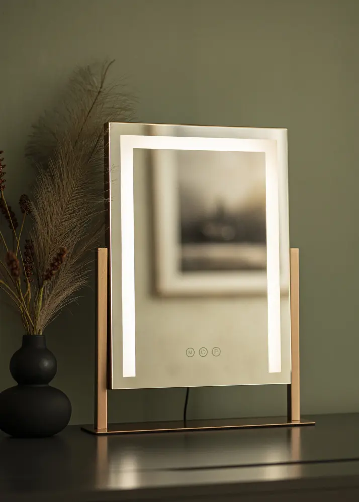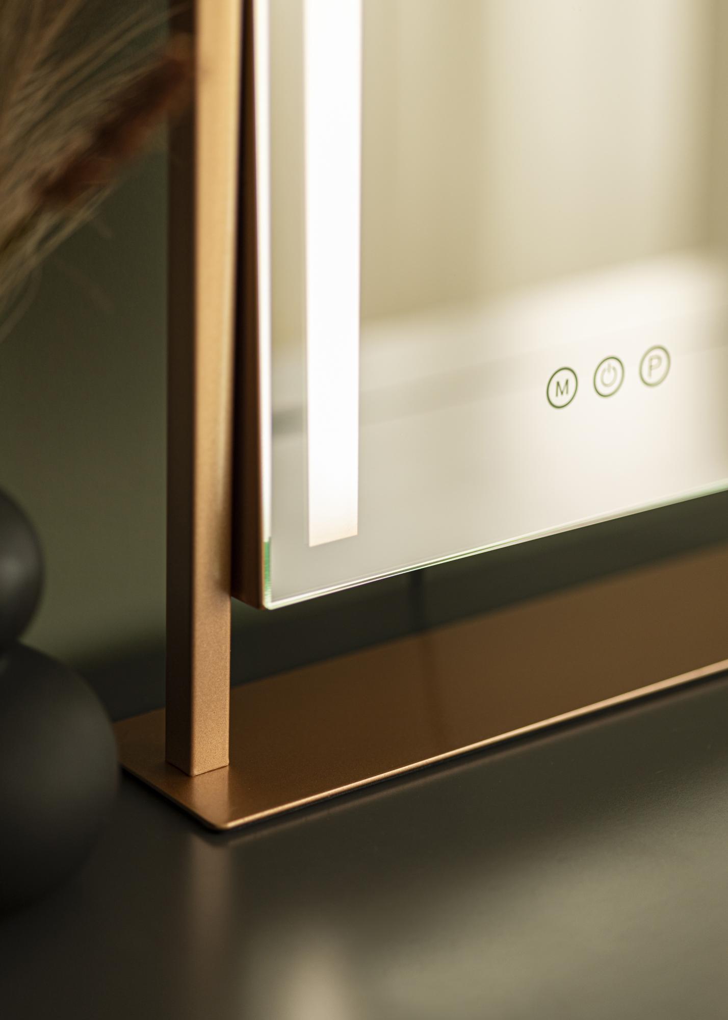 Egy elegáns, világítással ellátott tükör mind trendi lakberendezési elem, mind pedig tökéletes segítség a reggeli smink felviteléhez. Ez egy kifinomult fémkonstrukcióval rendelkező modell rózsaarany árnyalatban, amely integrált LED-szalaggal keretezi a tükör felületét. A világítás ki- és bekapcsolható, valamint a fény saját ízlés szerint állítható - mindezt a tükör alsó szélén található érintőgombok segítségével. Van egy klasszikus be-/kikapcsoló gomb, valamint egy gomb a fényerő szabályozására (jelölve "P" betűvel), és egy gomb a fény színhőmérsékletének beállítására (jelölve "M" betűvel). Így választhat meleg, hideg és természetes fény között.