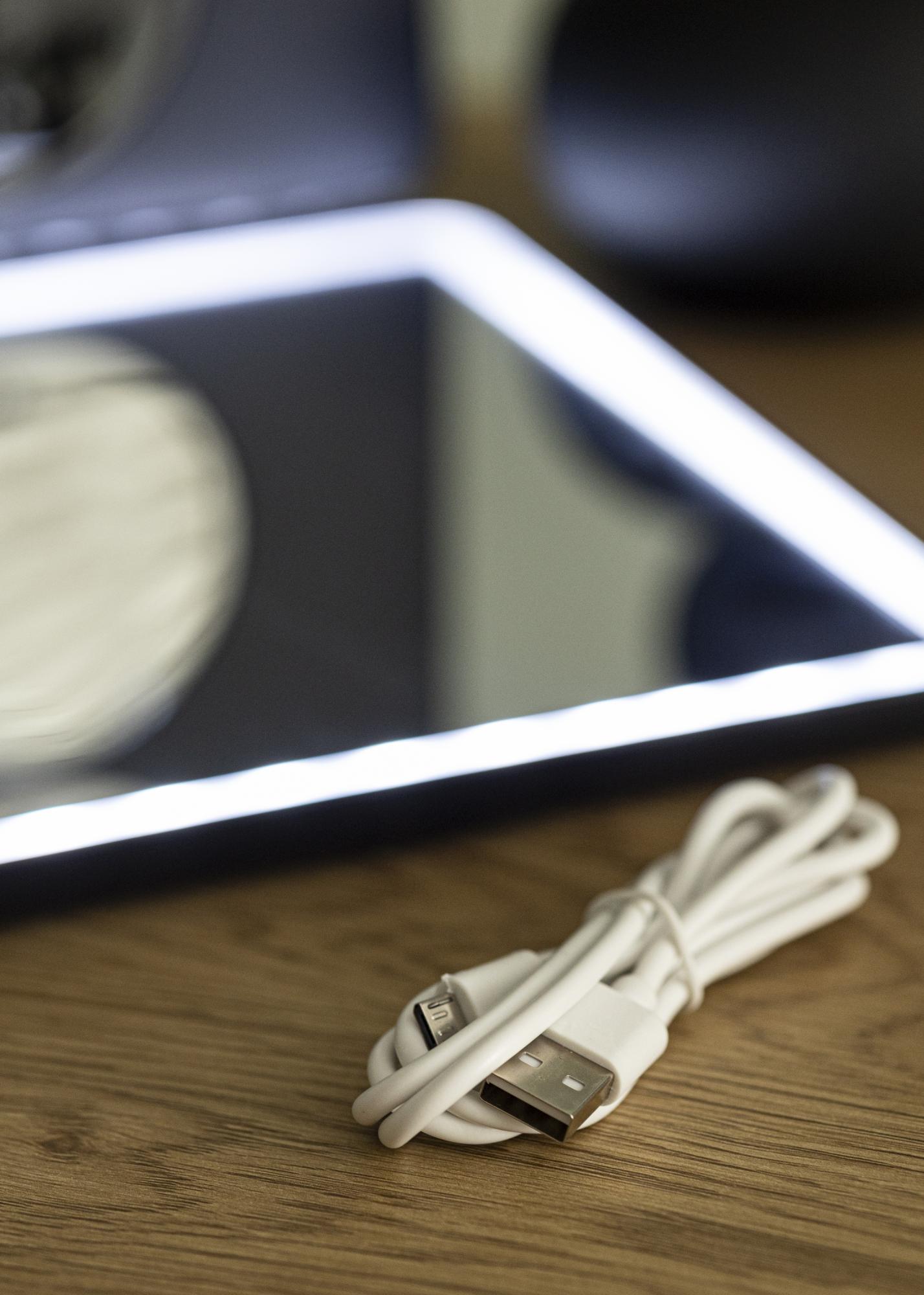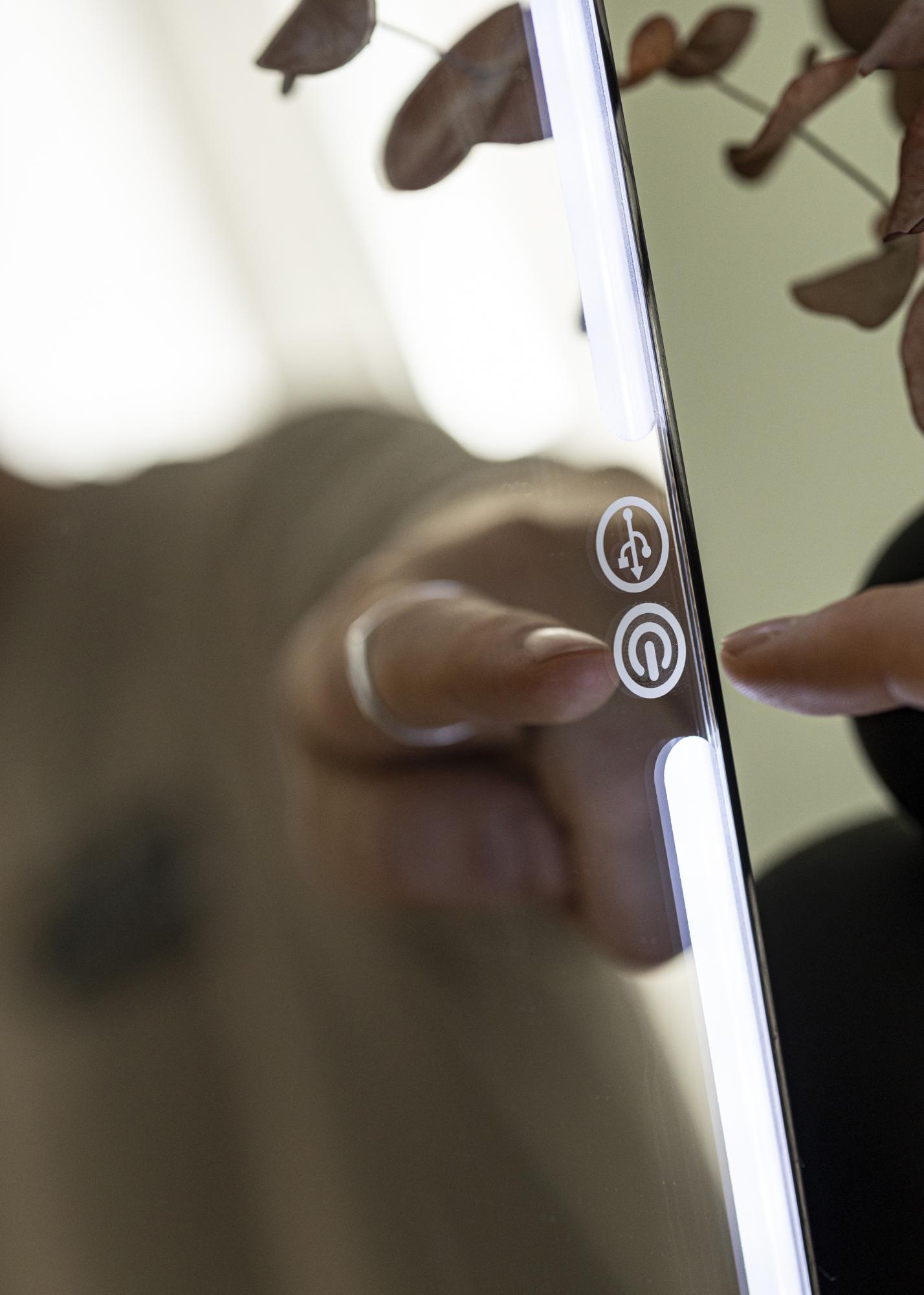 Ez a sminktükör letisztult fekete színű és beépített LED világítással rendelkezik. A világítást a tükör keretén elhelyezett érintőgombok segítségével lehet állítani, amelyekkel a tükröt is be- és kikapcsolhatod. Ha a tükröt nyitott állapotban csukod le, automatikusan energiatakarékos módba kapcsol, majd újra világítani kezd, amikor újra kinyitod a tükröt. A tükör elemmel működik és USB-csatlakozón keresztül tölthető.