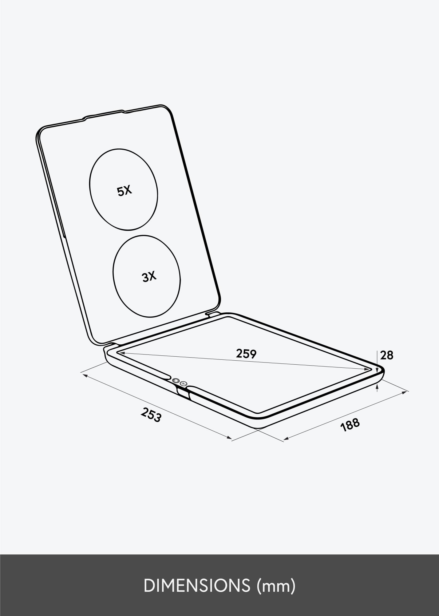 Szeretnél egy utazó méretű sminktükröt, amely tökéletesen elfér a táskában? Akkor ez a kompakt sminktükör jó választás! A tükör egy 18,5x25 cm méretű tükörfelülettel és egy összecsukható kialakítással rendelkezik, amely megóvja a tükröt a szennyeződéstől és portól. Az összehajtható design lehetővé teszi, hogy a tükör szögét használat közben állíthasd. A hagyományos tükörüveg mellett a tükör rendelkezik egy 5x-ös nagyítású és egy 3x-os nagyítású zónával.