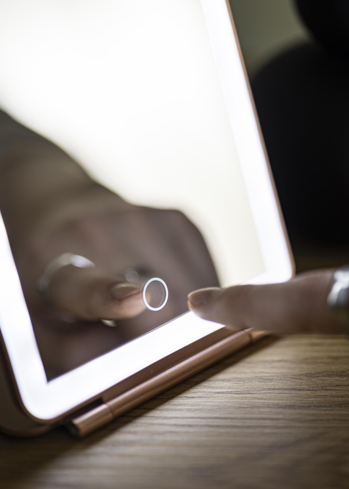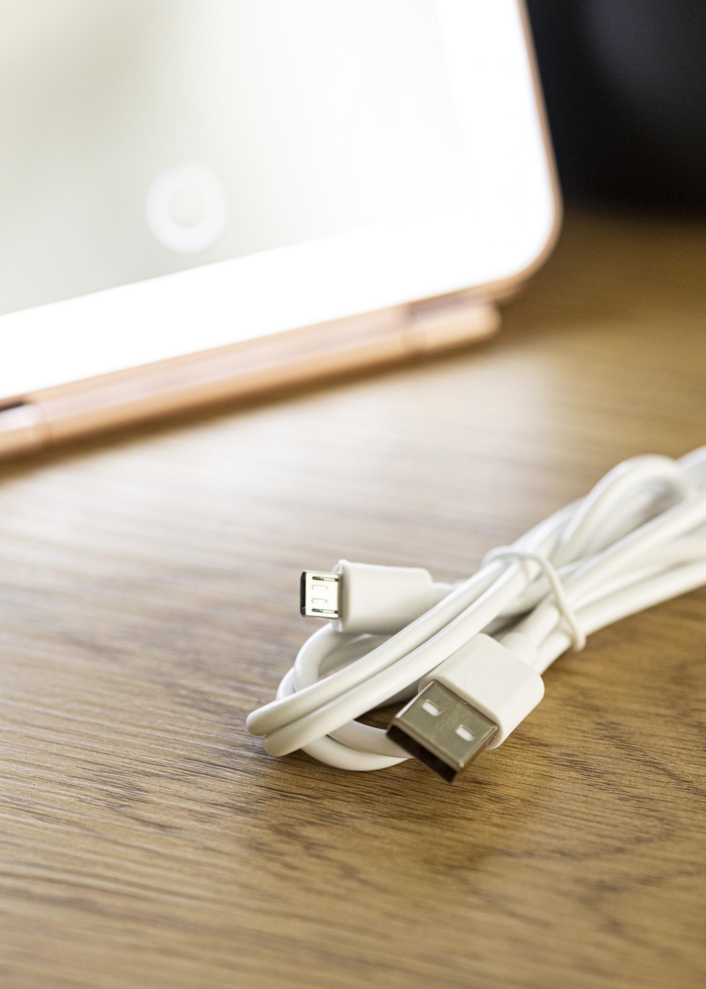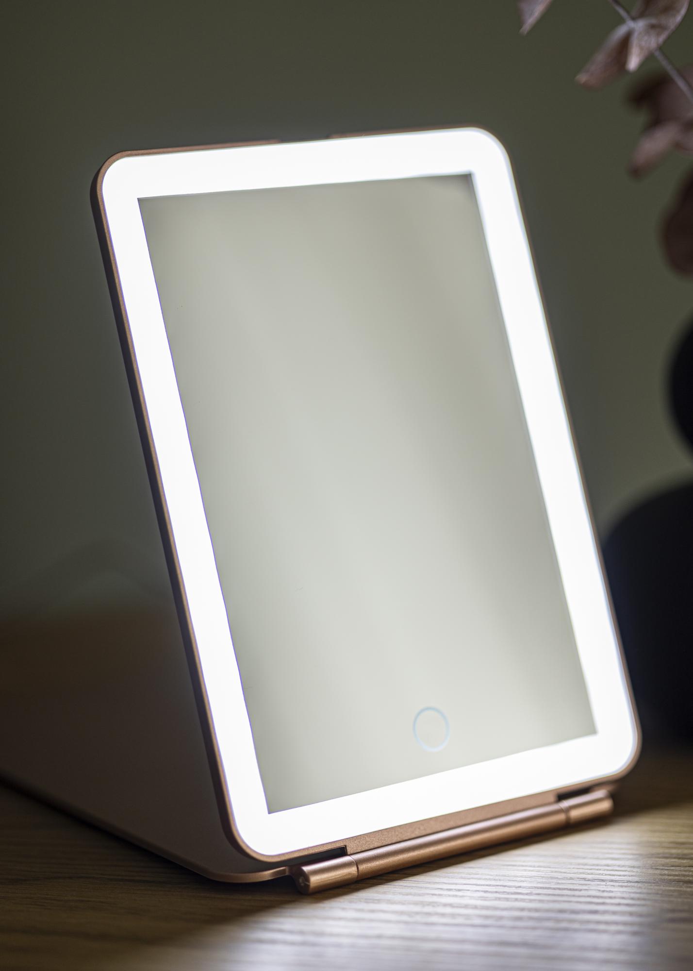 Ez a trendi rosé arany színű sminktükör hűséges társad lesz minden utazás során. Az összecsukható kialakítás lehetővé teszi, hogy a tükröt a kívánt szögbe állítsd - sőt, teljesen össze is hajthatod, ha éppen nem használod. A tükör beépített LED-világítással is rendelkezik, ami egy energiatakarékos fényforrás, amelyet idővel nem kell cserélni. Ha ennek a tükörnek az akkumulátora lemerülne, USB-csatlakozással tölthető fel. A tükröt a tükör elején található érintőgombbal kapcsolhatod be. Itt van egy másik érintőgomb is a világítás beállításához, amelyet lenyomva tartva szabályozhatod a fényerőt és beállíthatod a színhőmérsékletet.