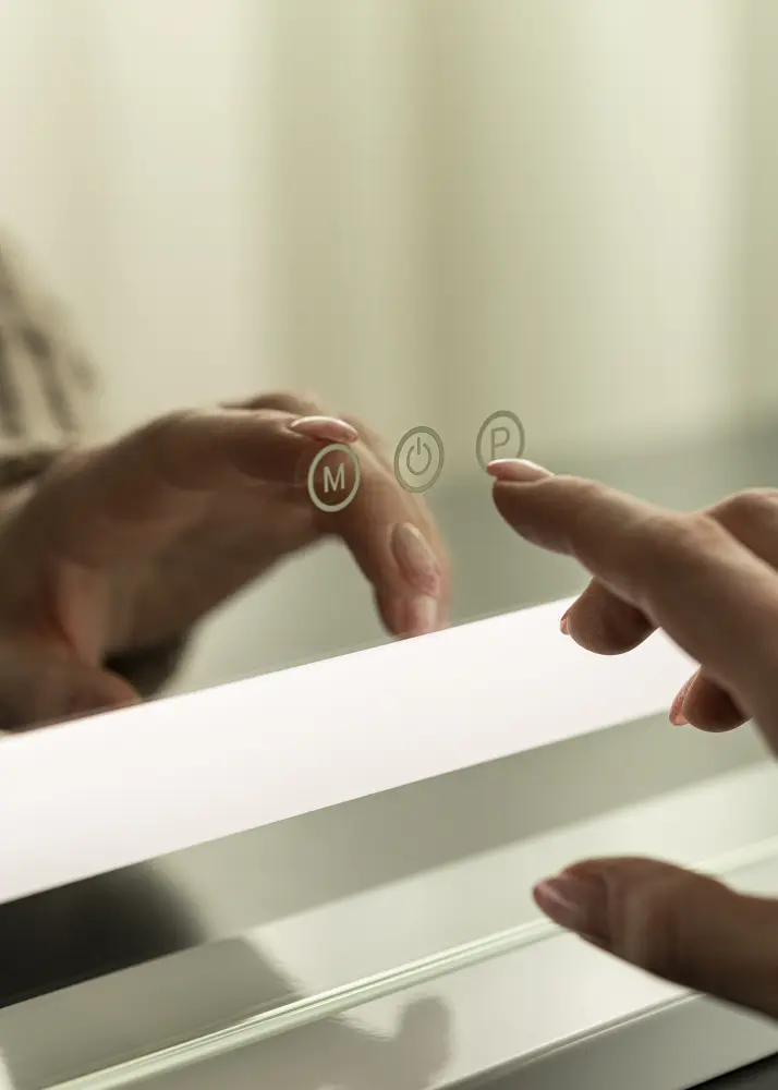 A tükör fejlett érintőfunkcióval van felszerelve. Egy egyszerű érintéssel bekapcsolhatod és állíthatod a fényerőt, valamint a megjelölt "M"- és "P"-gombok segítségével a fény színhőmérsékletét is megváltoztathatod az előlapon. Ez a sminktükör tehát nemcsak az esztétikát ötvözi a praktikus használattal, hanem energiatakarékos is LED-technológiájának köszönhetően. A fényforrások úgy vannak kialakítva, hogy a termék teljes életciklusát kibírják, és a fényerő még 50.000 óra elteltével is megőrzi az eredeti erősségének 50%-át, ami fenntartható és megbízható választássá teszi minden otthon számára.