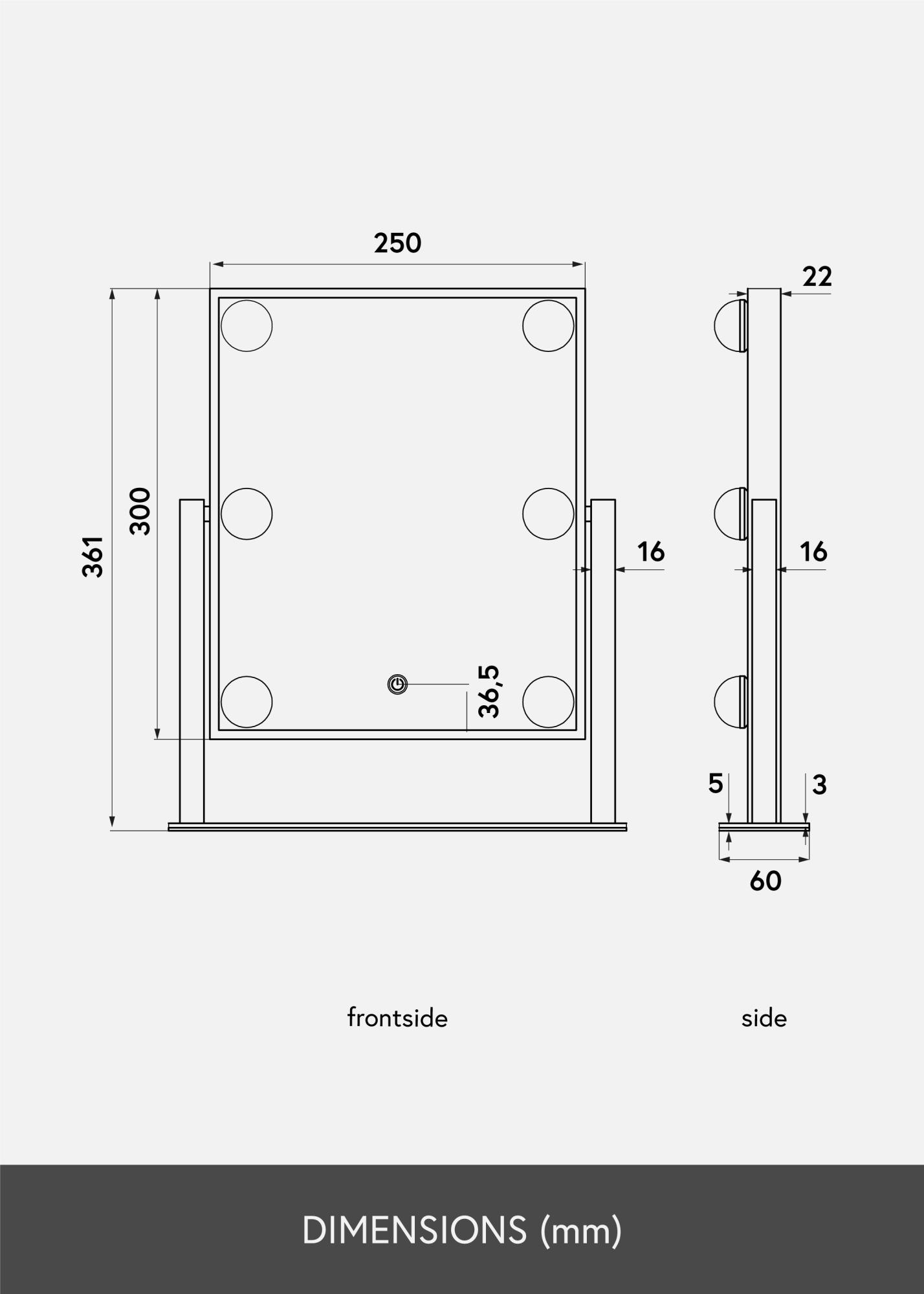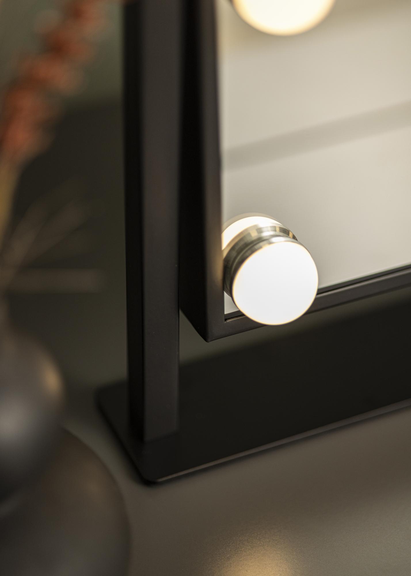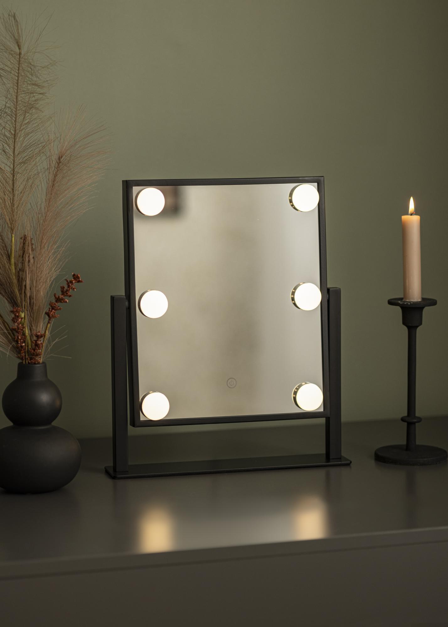 Ez egy igazán luxus sminktükör hat dekoratív és szabályozható LED izzóval egy trendi fekete árnyalatban. A világítás meleg, fehér fényt ad 3000K-ben, és a touch gomb megnyomásával kapcsolható be. A lámpák ereje a gomb néhány másodperces nyomva tartásával állítható. A LED egy fényforrás, amely kevesebb energiát fogyaszt, hosszabb élettartammal rendelkezik, és természetesebb és egyenletesebb fényt ad. A sminktükör dönthető, így egyszerűbben, precízebben alkalmazhatja sminkjét. Számos funkciója mellett ennek a sminktükörnek igazi hollywoodi érzése van, és elegáns részlete lesz az otthonnak!