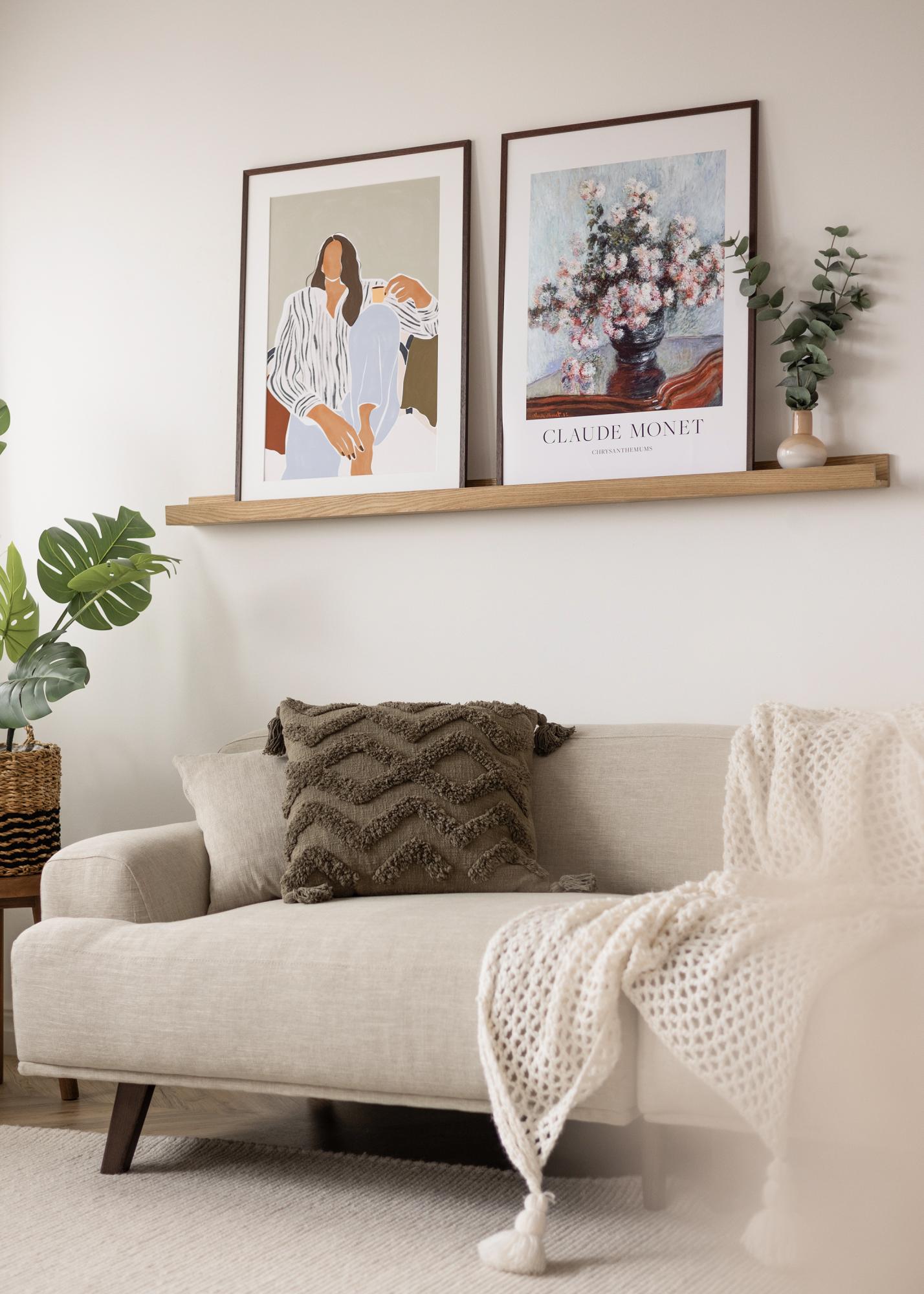 Egy praktikus képkeret polccal elegánsan megjelenítheti képeit, és kiváló lehetőséget teremt a fali művészet változatos bemutatására. Ez a képkeret polc tömör tölgyből készült, egyszerű, egyenes vonalakkal rendelkező, letisztult dizájnnal. Maga a polc egy bemart horonnyal rendelkezik, amely támaszt nyújt a képei számára, és lehetővé teszi, hogy azokat szép szögben támassza a falnak. A képlista többféle hosszúságban kapható, ebből a változatból a hosszúság 150 cm. A polc előfúrt lyukakkal van ellátva, és a teljes egyszerűsítés érdekében megfelelő csavarok és tiplik is mellékelve vannak.
