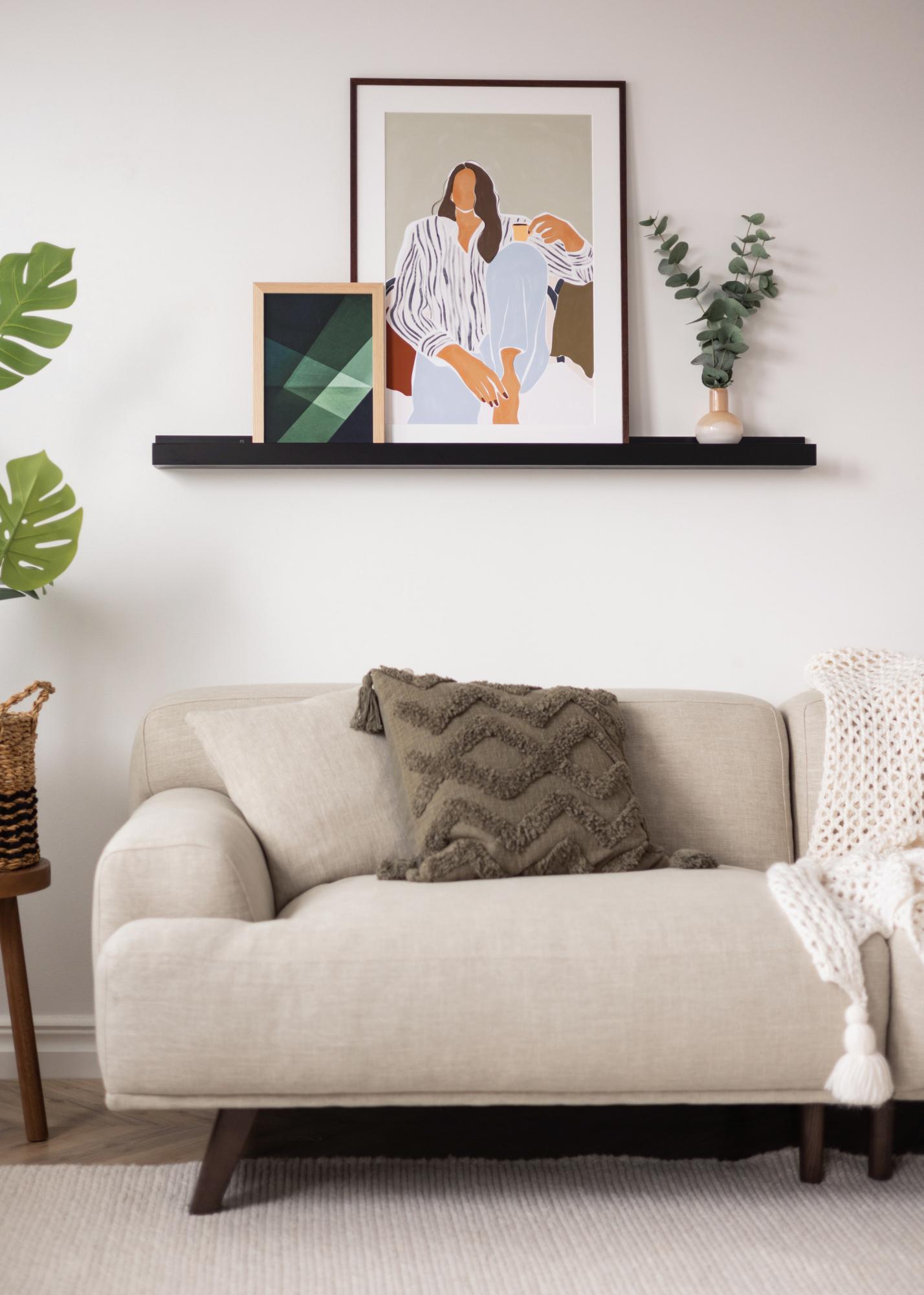 Mutassa meg és variálja a falművészetét egyszerűen és stílusosan egy elegáns képkeretléc segítségével! Ez a képkeretléc MDF-ből készült, és trendi fekete festékkel van bevonva, szép, félfényes felülettel. A képkeretléc letisztult dizájnnal rendelkezik, egyenes, egyszerű vonalakkal és minimalista érzettel. A polc közepén egy hornyolt vájat található, amely támogatást nyújt a képeidnek, és szép szögben állítja be őket, amelyben a falnak dőlnek.