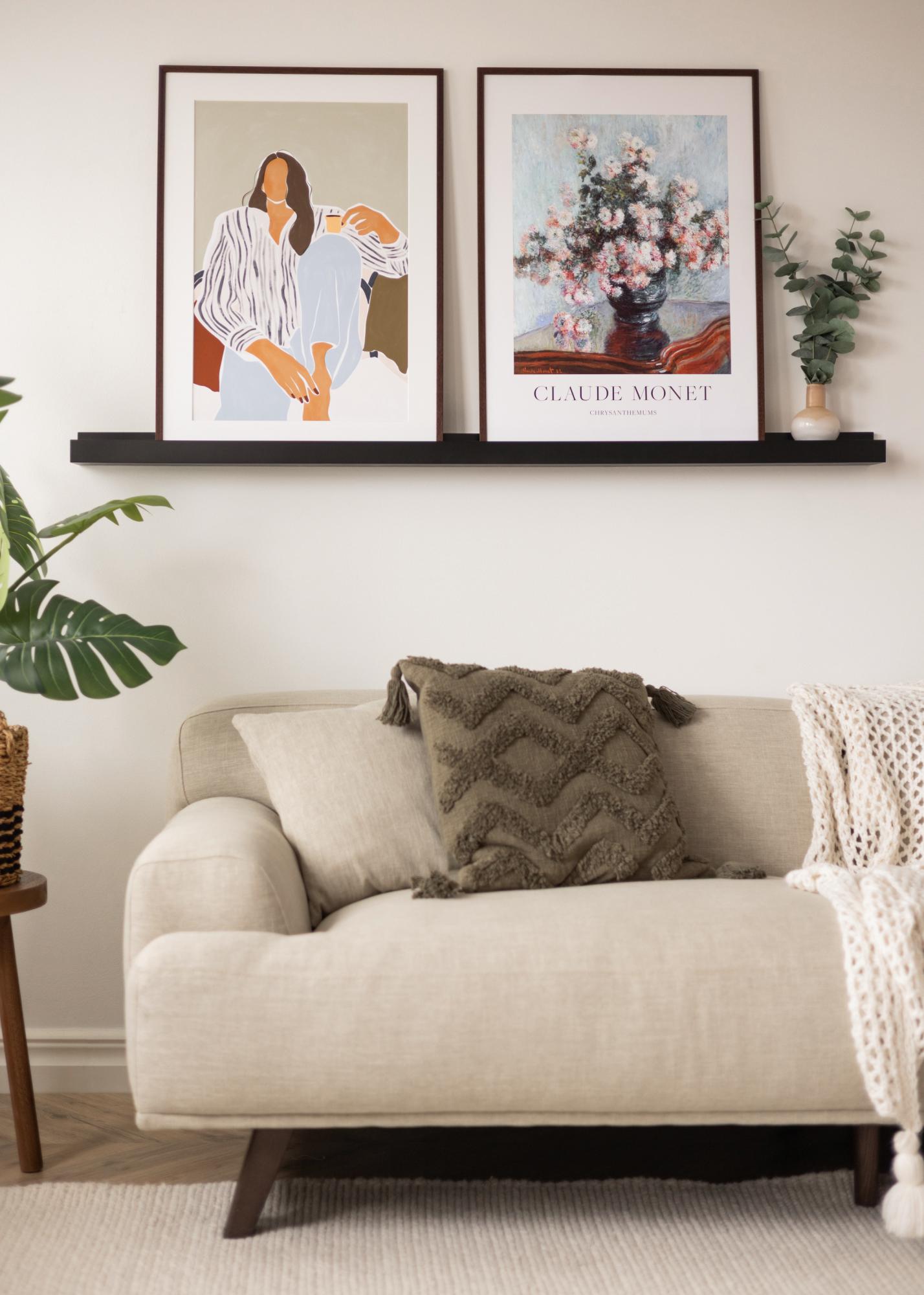 Egy elegáns képkeretléc segítségével egyszerűen és stílusosan mutathatja be és variálhatja faliművészetét! Ez a képkeretléc MDF-ből készült, és divatosan fekete festékkel van bevonva, amely finom, félfényes felületet biztosít. A képlistának letisztult, egyenes vonalú, minimalista stílusa van. A polclapon van egy maratott rés középen, amely a képek támasztékaként szolgál, és szép szögben mutatja őket, amikor a falnak támaszkodnak.