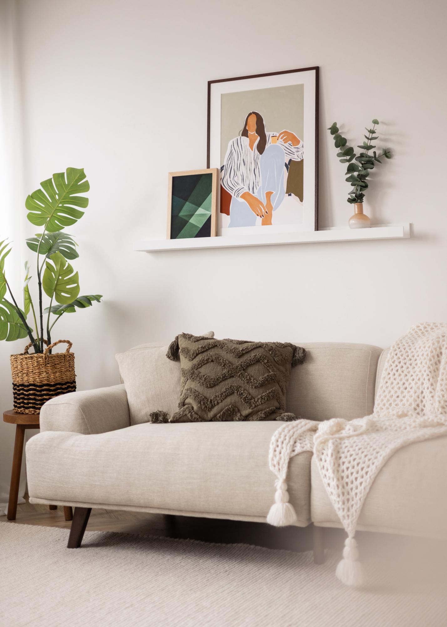 Egy praktikus képkeretpolccal könnyedén és esztétikusan bemutathatja és váltogathatja képeit! Ez az elegáns képkeretpolc MDF-ből készült, és gyönyörű, félfényes felületű, fehérre festett. A design letisztult az egyszerű, egyenes vonalakkal és időtlen minimalista érzéssel. A polc közepén egy mart horony fut, amely támaszt nyújt a képeknek, és tökéletes szögben tartja őket a falnak dőlve. A képkeretpolc előre fúrt lyukakkal rendelkezik, és a csomagolás tartalmazza a megfelelő csavarokat és tipliket, hogy az egész még egy kicsit egyszerűbb legyen!