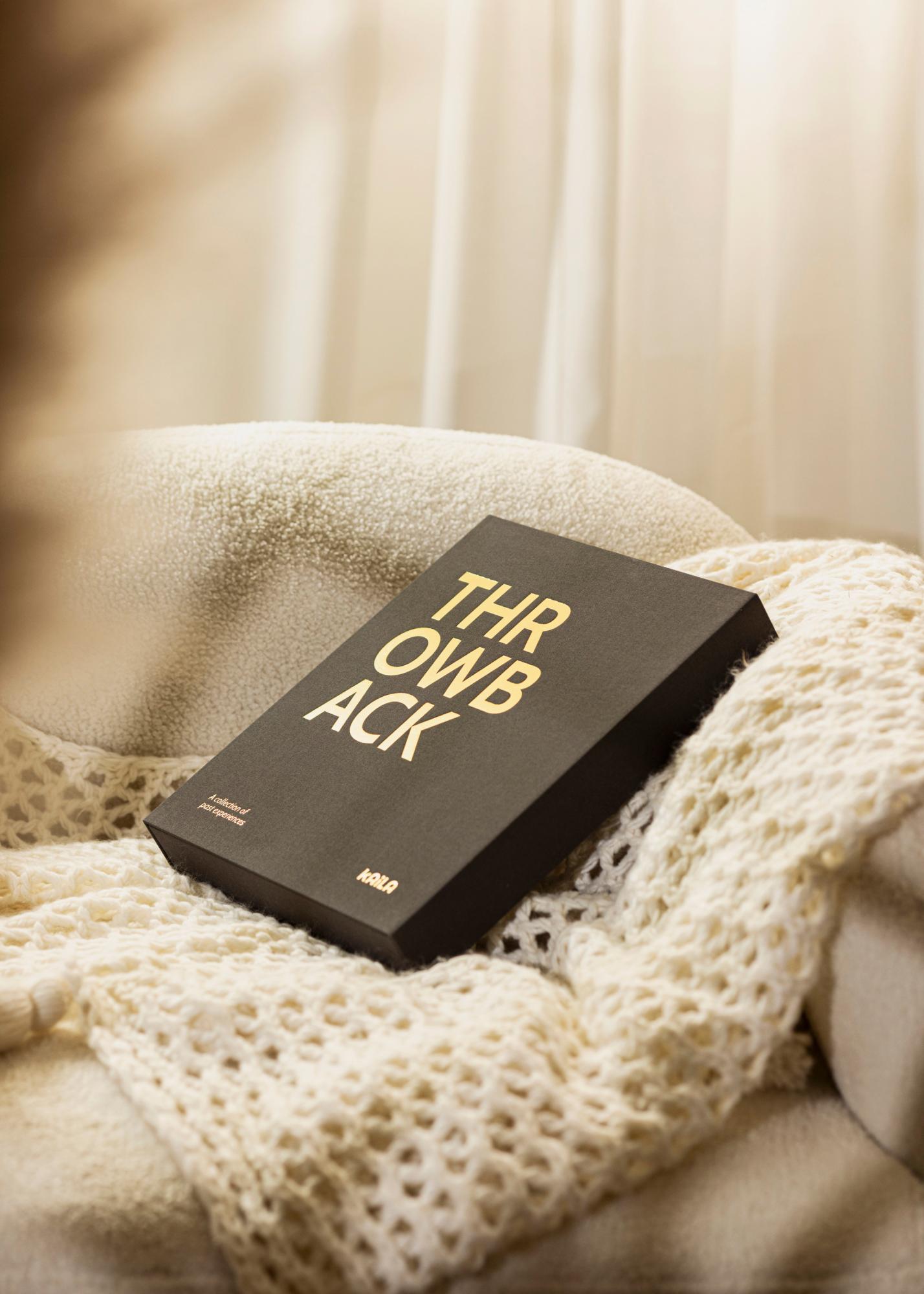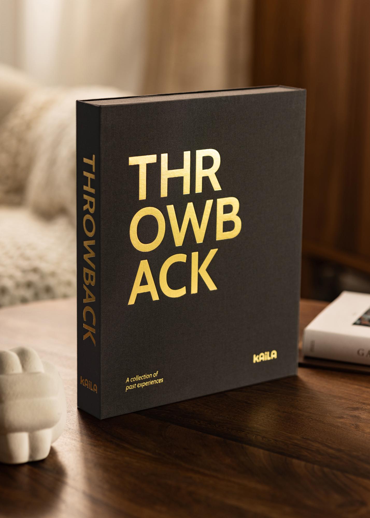 Ez egy nagyon divatos fényképalbum, amely luxus kivitelben, stílusos Coffee Table Könyvként van csomagolva - úgynevezett Coffee Table Fényképalbum. A fényképalbum egy exkluzív dobozként van kialakítva, amelyet kinyitva férhet hozzá a tartalomhoz. A borító elegánsan fekete textillel van bevonva, és arany színű nyomattal a "THROWBACK" felirat díszíti mind az elejét, mind az album gerincét. Ez a jól ismert kifejezés a visszatekintés modern és kissé szemtelen érzést ad a fényképalbumnak, mivel valóban megkülönbözteti magát a klasszikus albumstílusoktól. Az albumnak van egy alcíme is, amely így szól: „A collection of past experiences”, és a bal alsó sarokban van nyomtatva.