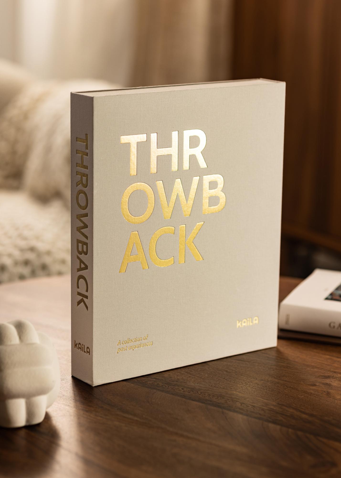 Ez egy nagyon divatos fényképalbum, amely luxus módon van csomagolva, mint egy stílusos Kávés Asztali Könyv – egy úgynevezett Coffee Table Photo Album. A fényképalbum egy exkluzív dobozként van kialakítva, amelyet kinyitva elérhetővé válnak a tartalmak. A borító elegánsan krémszínű textillel van bevonva, és egy aranyszínű nyomtatás a "THROWBACK" felirattal díszíti az album elejét és gerincét. Ez az ismerős fogalom a visszatekintésre modern és kissé vagány érzést kölcsönöz a fényképalbumnak, mivel valóban megkülönbözteti magát a klasszikus albummintáktól. Az albumnak van egy alcíme is, amely így szól: "A collection of past experiences", és a bal alsó sarokban van nyomtatva.