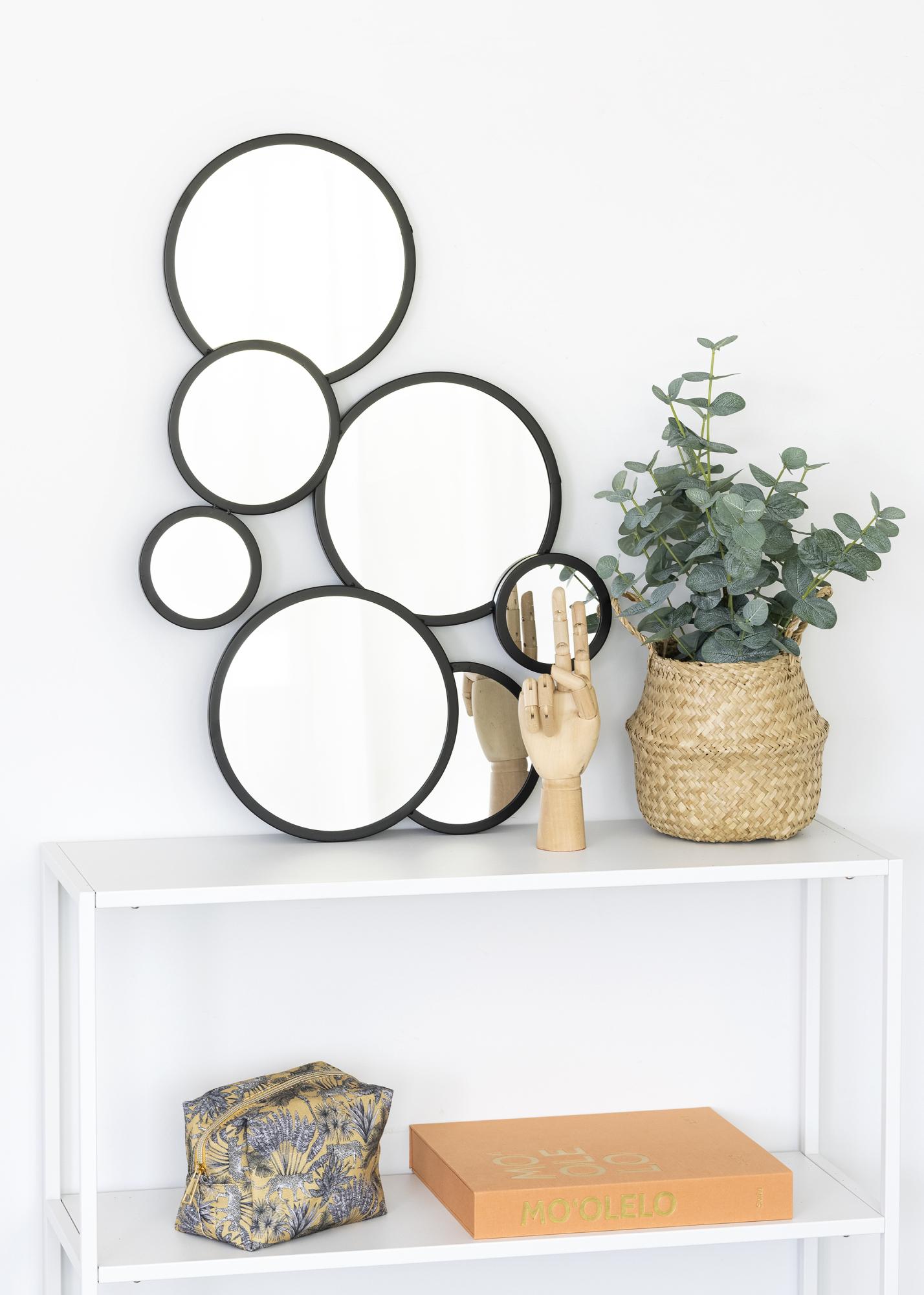 A Bubbles egy szép tükör egyedi dizájnnal, sok kisebb kör alakú tükörrel, amelyek együtt egy nagy egészet alkotnak. A tükör mérete 72x43 cm, és trendi fekete árnyalatban kapható. A falra szerelhető fekvő pozícióban, de a tükör szépen állítva is a falnak dönthető. A tükör fém anyagból készült.