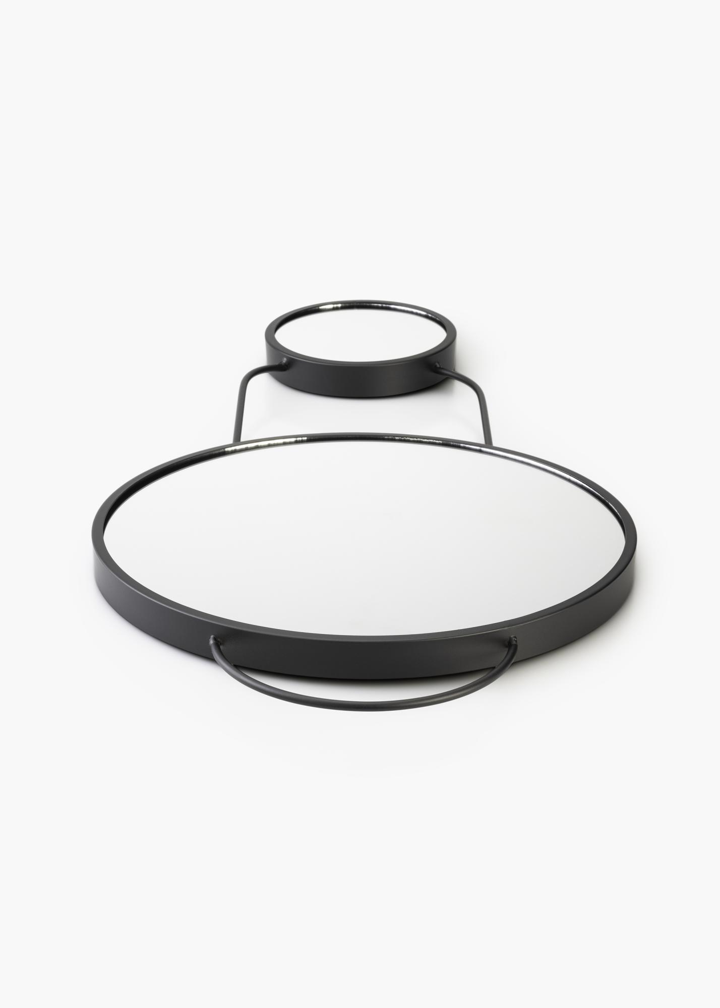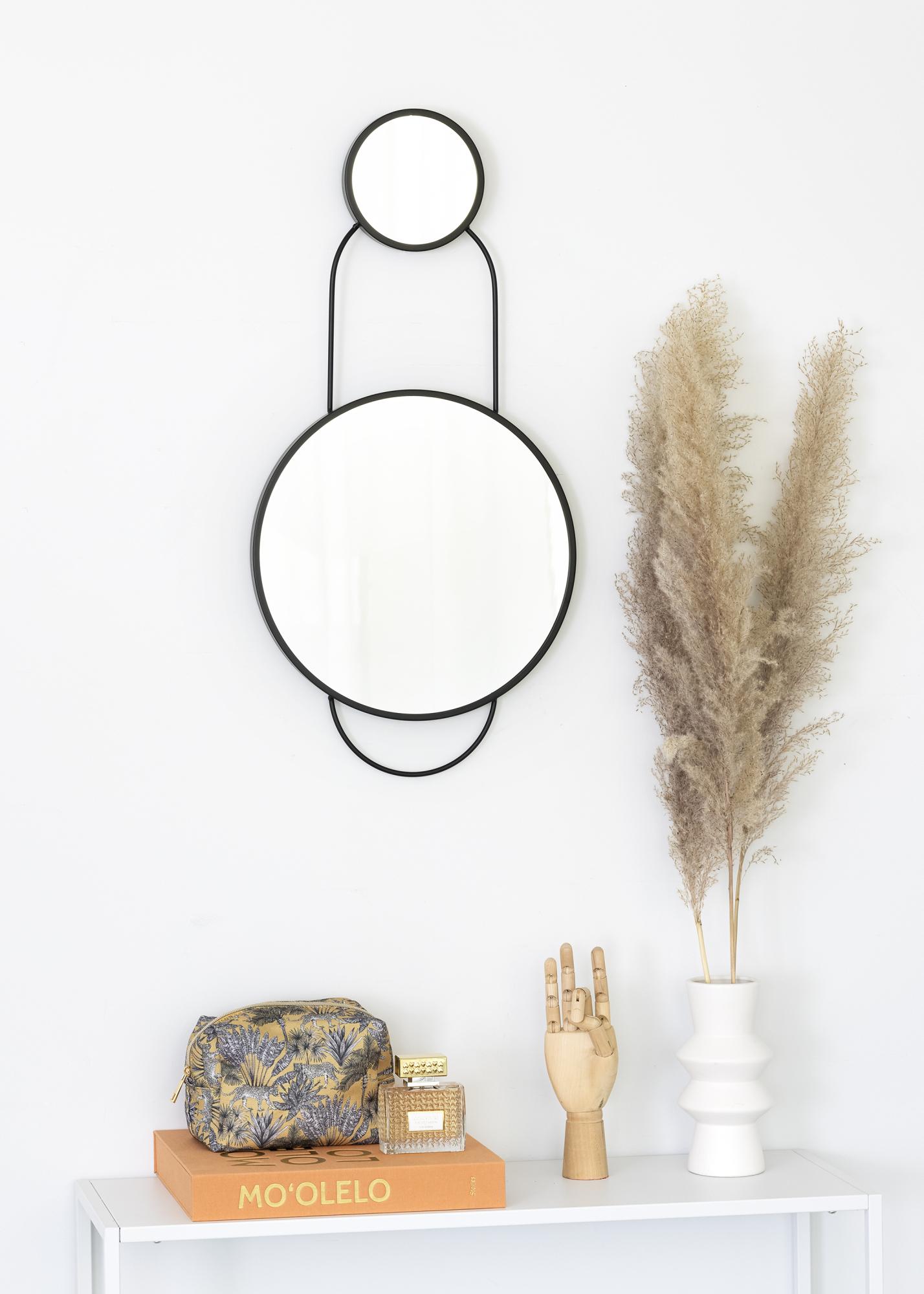 Ez egy menő fali tükör a KAILA-tól két tükörrel, kombinálva egyedi és divatos kialakítással. A fali tükör felső részén van egy kisebb tükör, alul pedig egy nagyobb. A tükör mérete 35x71 cm, és fémből készült. A tükör elegáns fekete árnyalatban készül, ami nagyon trendi dizájnt biztosít.