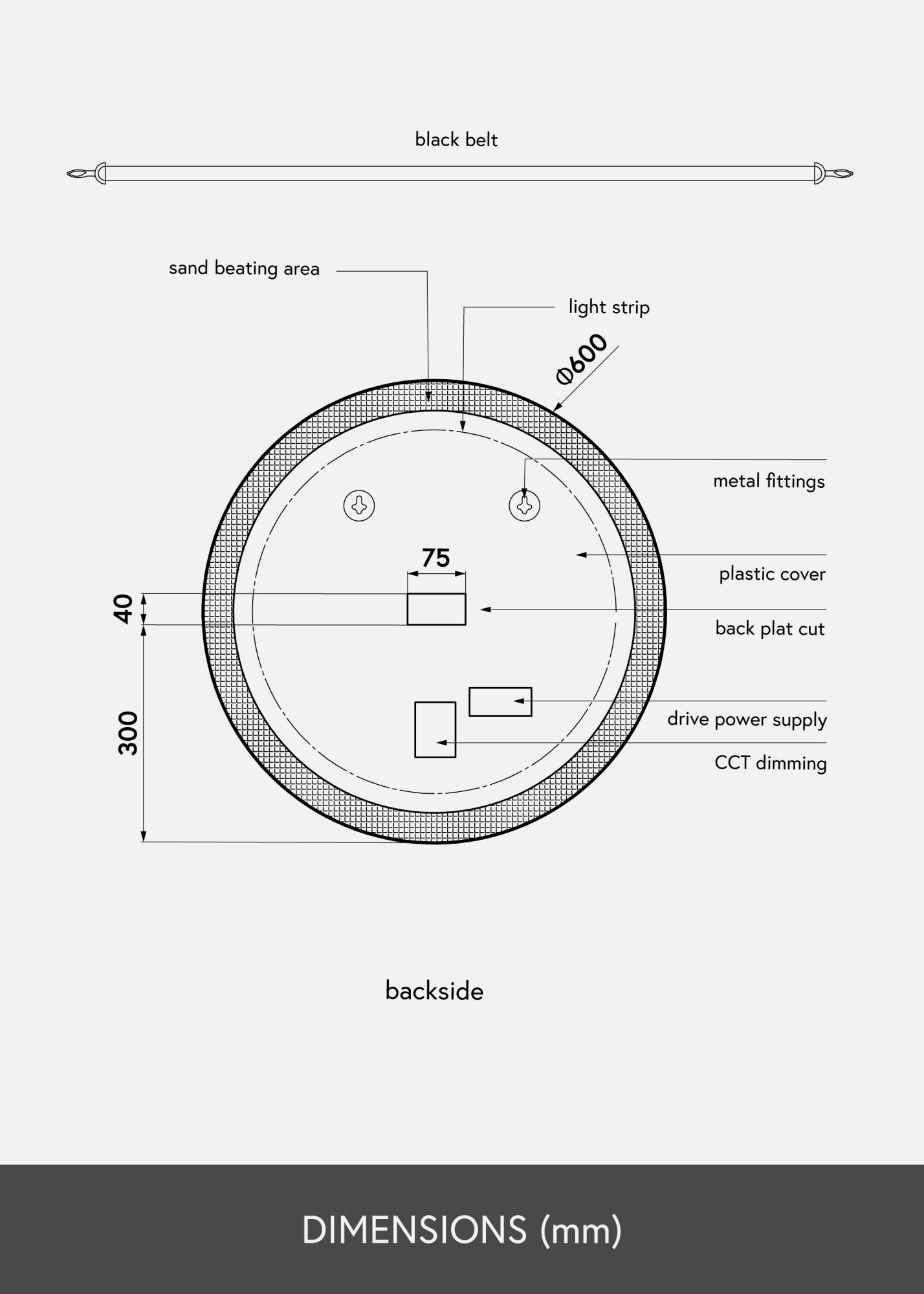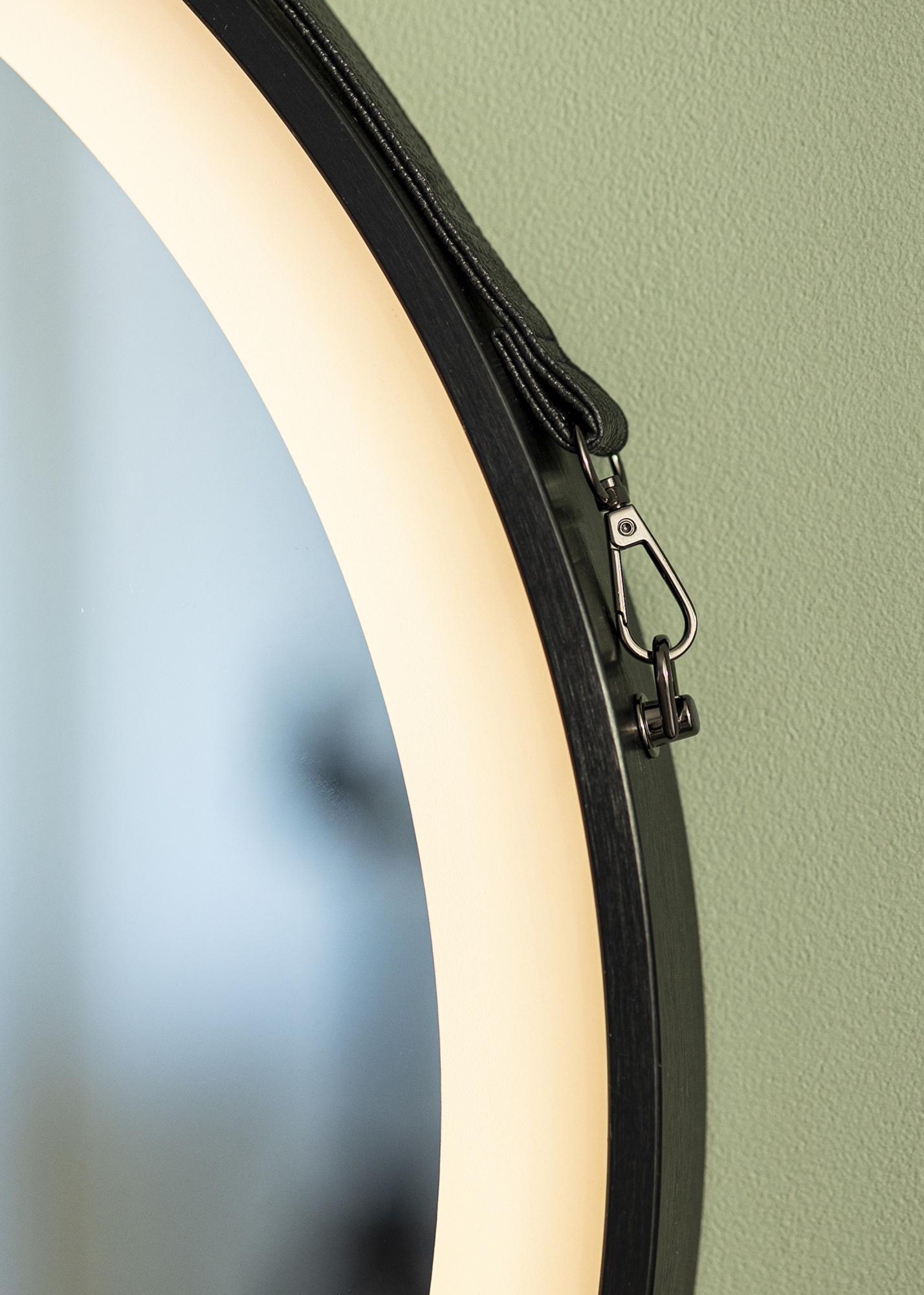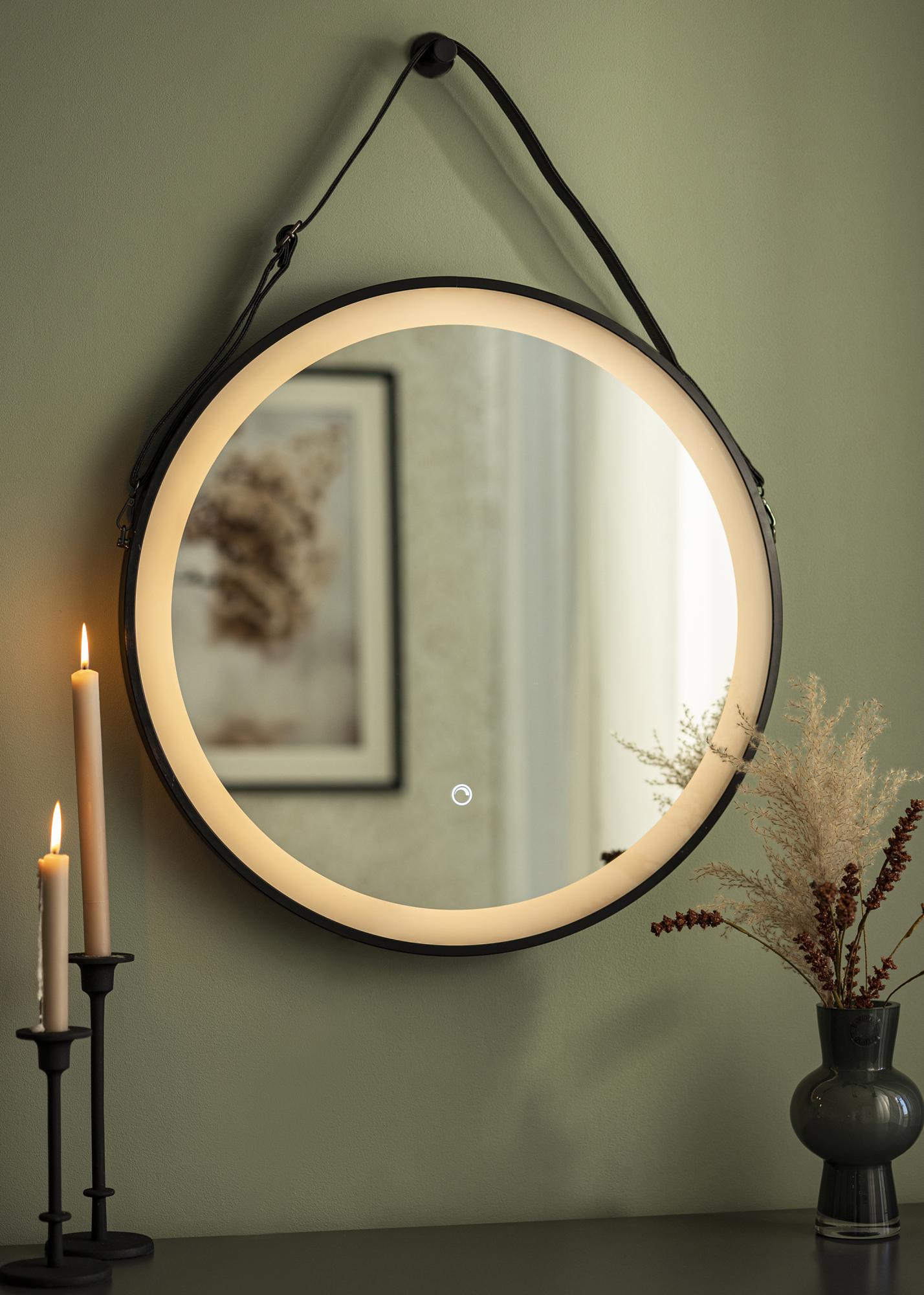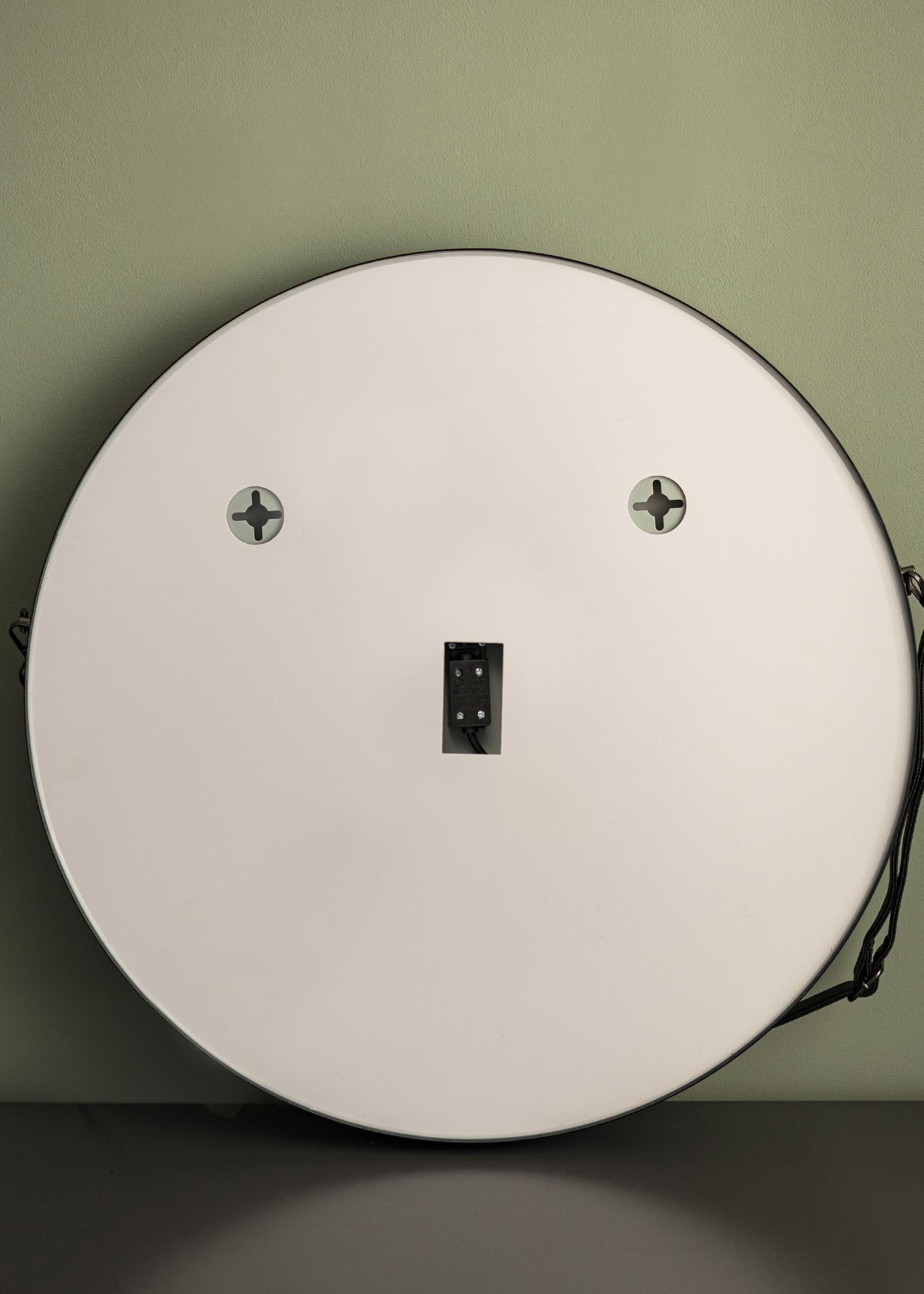 Ez a fürdőszobatükör ipari dizájnt követ fekete árnyalatával és trendi kerek kialakításával. A tükör átmérője 60 cm, és egy barna-fekete bőrszíj tartozik hozzá a felfüggesztéshez. A tükörüveget körülveszi egy integrált LED világítás, amely 3000K meleg fehér fényt biztosít. A világítás fényereje szabályozható, és könnyen beállíthatja, ha néhány másodpercig nyomva tartja az érintőgombot a képernyőn. A tükör megjegyzi a legutóbbi fénybeállítást, és következő bekapcsoláskor is ugyanúgy világít. Ez lehetővé teszi, hogy mindig jó fényviszonyok között tekintse meg magát! A tükör fürdőszobai használatra jóváhagyott, de a lakás más falaiban is szemet gyönyörködtető dekoratív elem lehet! A tükör fix installációra készült, és kapcsolóra köthető. Annak érdekében, hogy a tükör megfelelően működjön, sima kapcsolóra kell csatlakoztatni, nem világítási fokozatszabályozós kapcsolóra.
