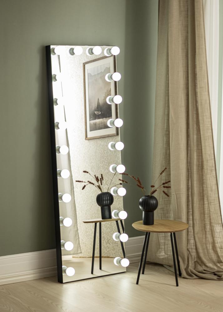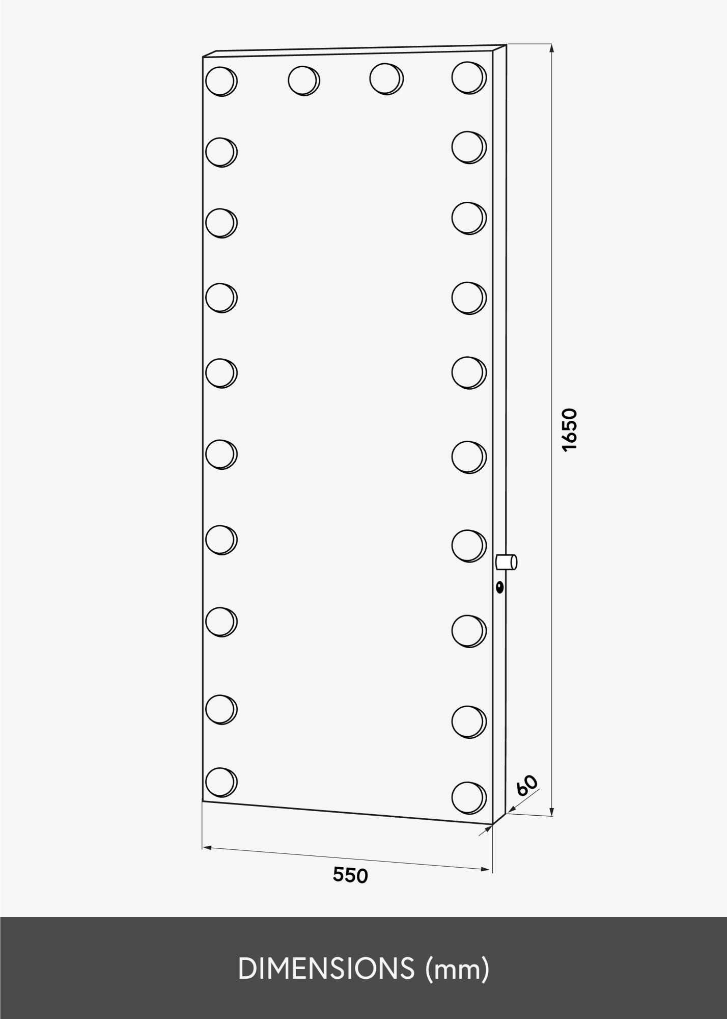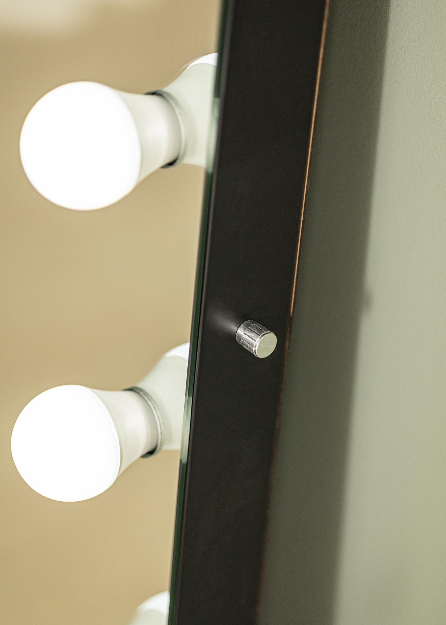 A fali tükör 22 nagy LED-lámpával rendelkezik, amelyek szépen keretezik a tükörfelületet, és segítenek a tükörnek, hogy glamour megjelenést kapjon. A tükör egyik hosszanti oldalán található kisebb gomb segítségével ízlés szerint szabályozhatja a fényerőt. Az elektromos csatlakozás dugvillával történik.