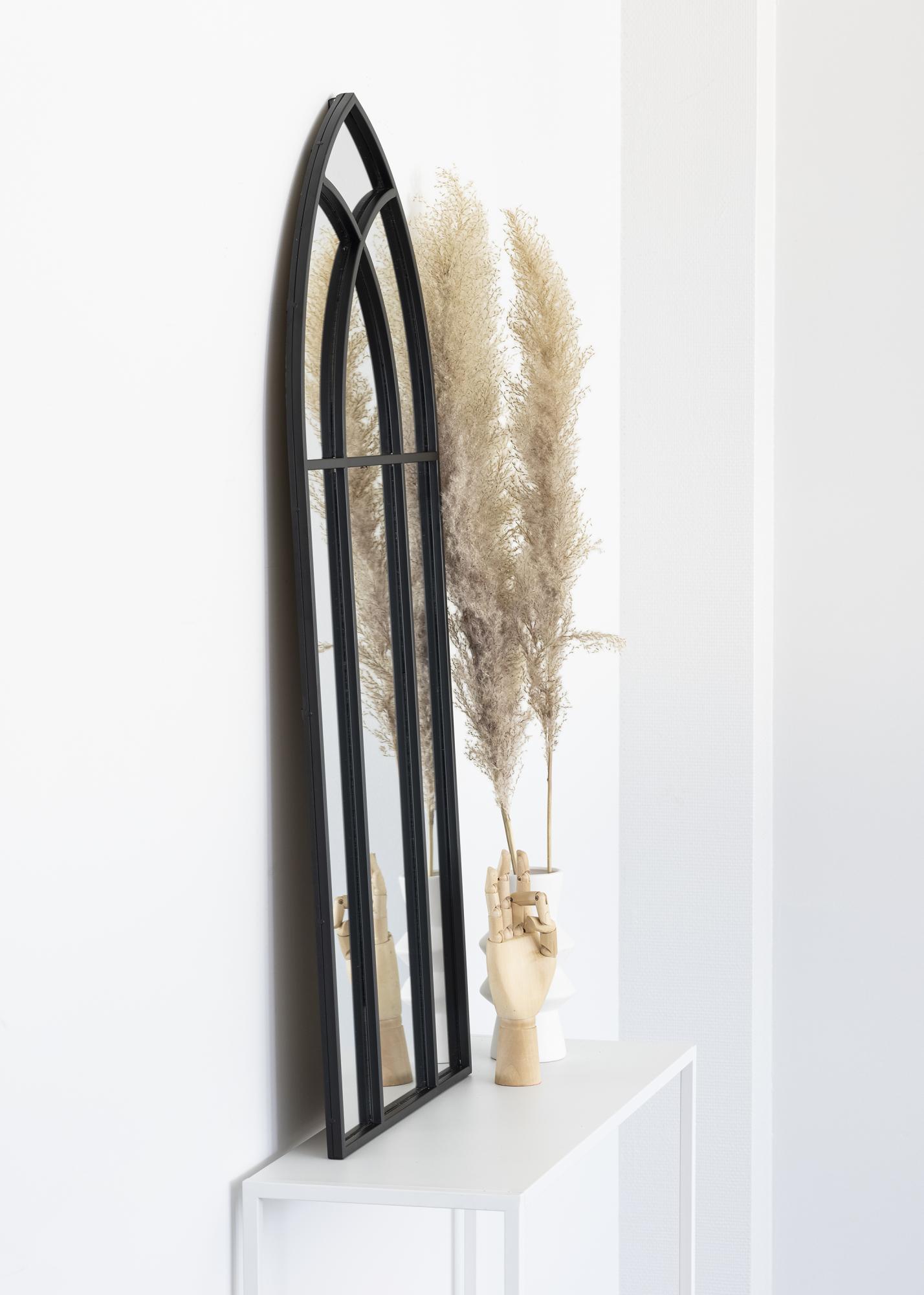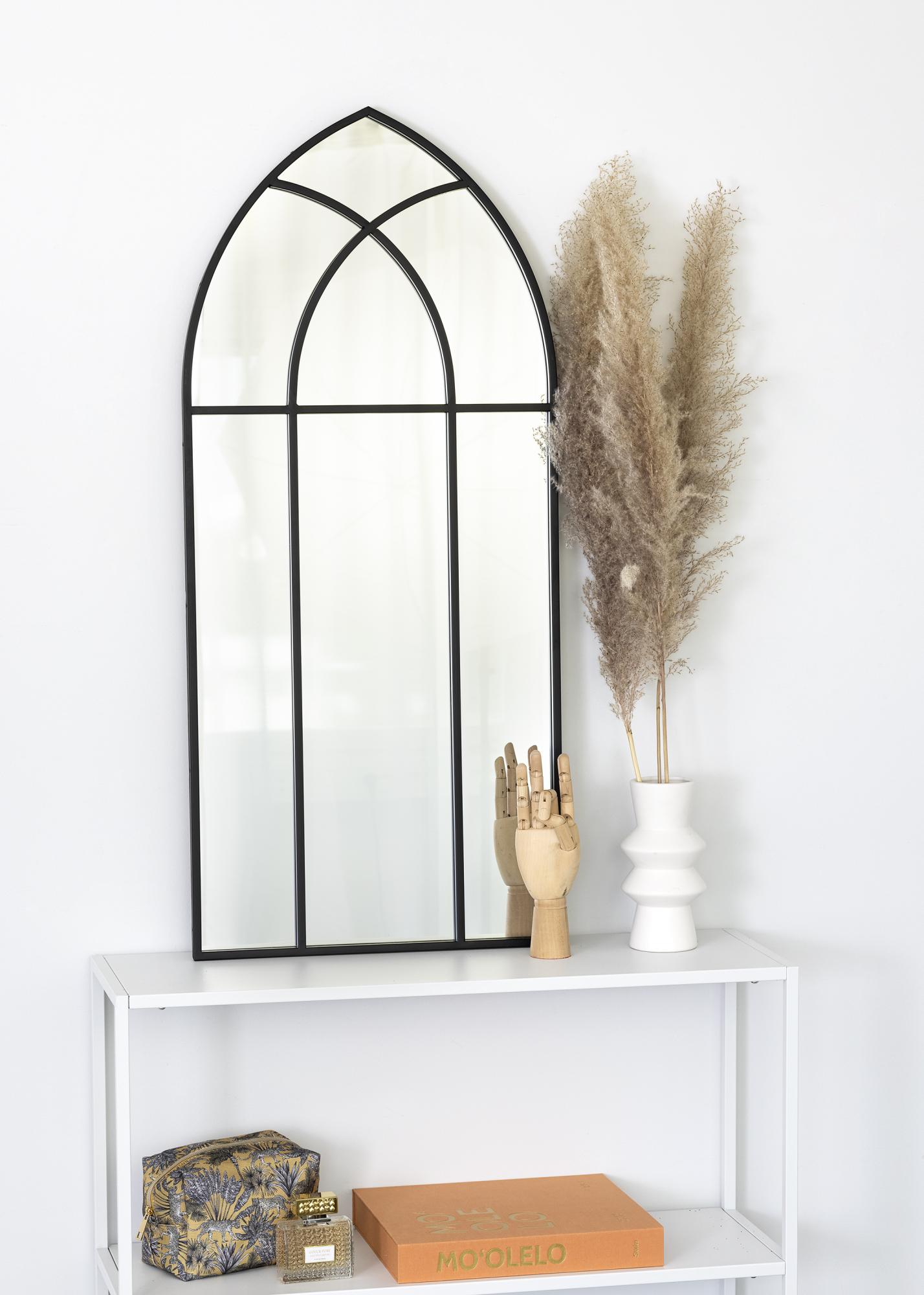 Ez egy nagyon dekoratív tükör, amely azonnal romantikusabb légkört teremt a helyiségben, ahol elhelyezik! A tükör kialakítása egy kert ablakára emlékeztet, ugyanakkor egy kissé gótikus jellege van. A tükör izgalmas formája otthonod szemrevaló darabjává válik! A tükör mérete 45x100, és dekoratív mintázata vékony fekete fémvonalakból áll.