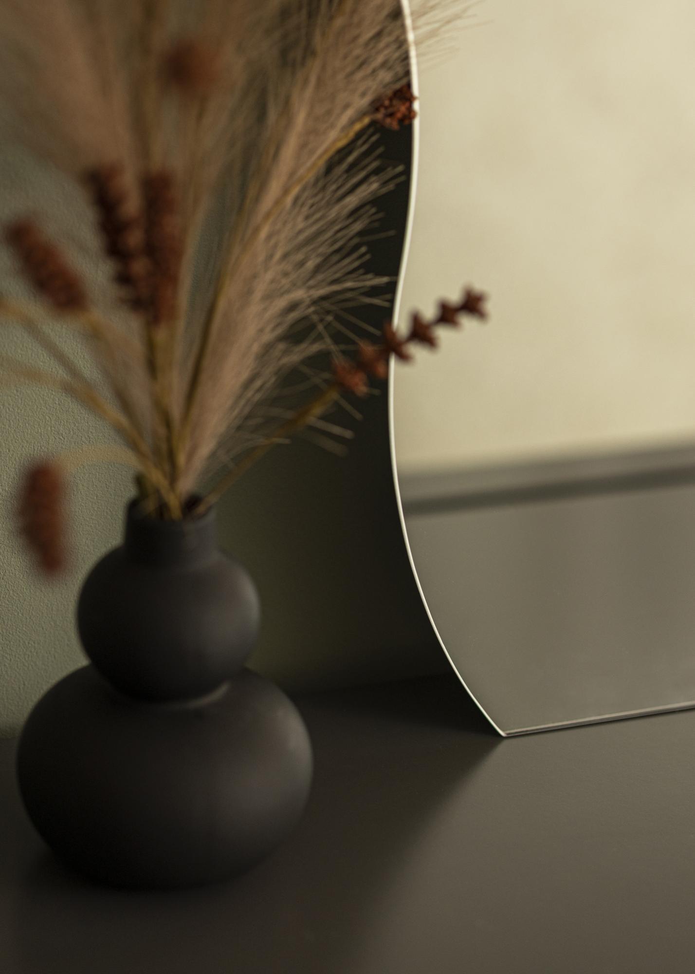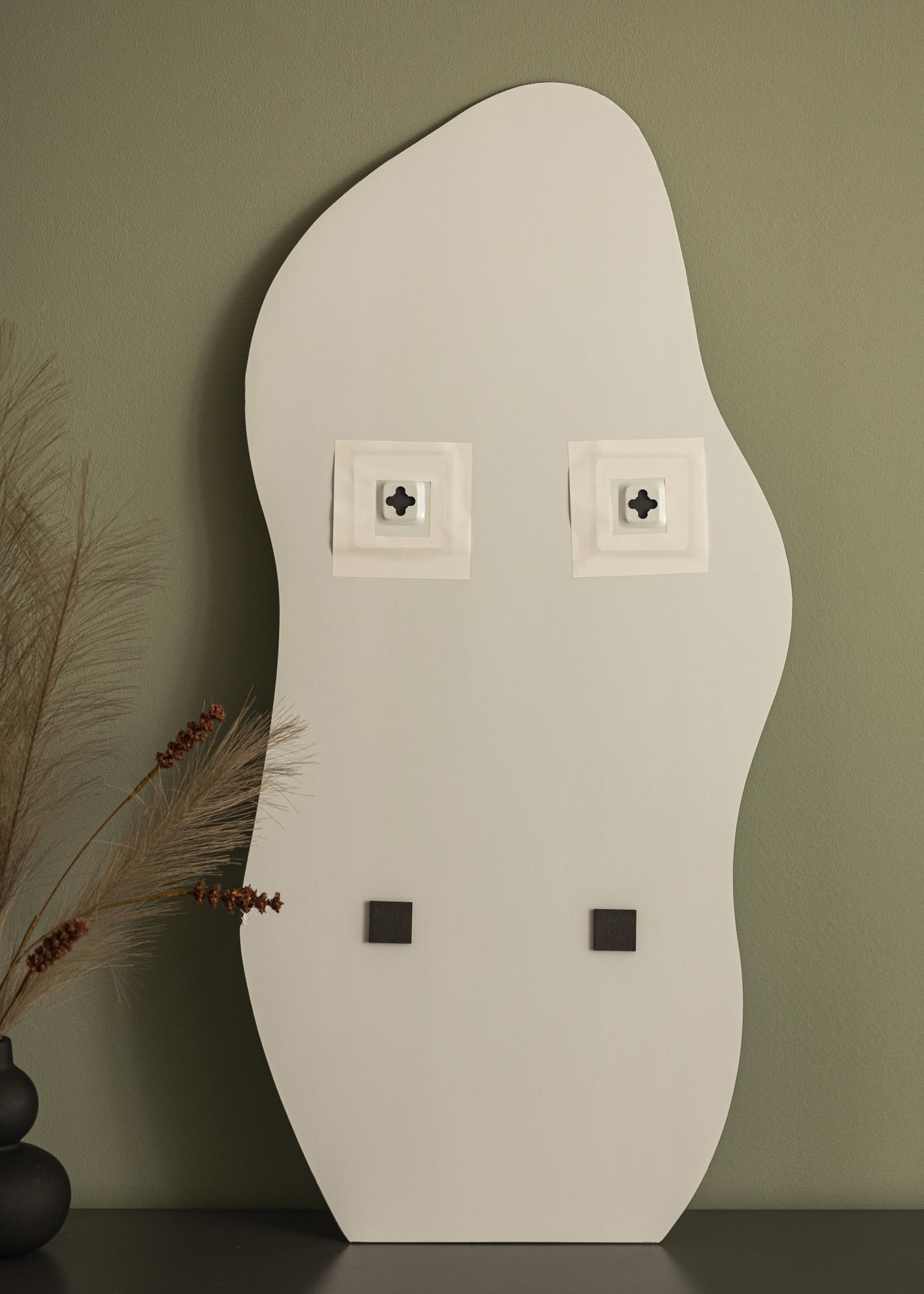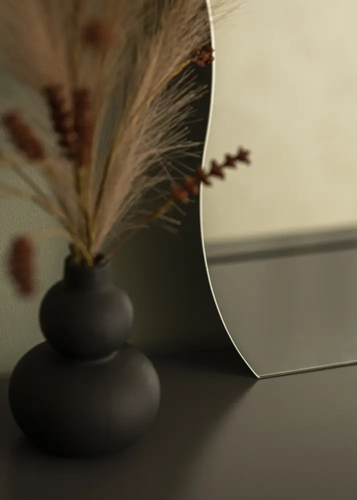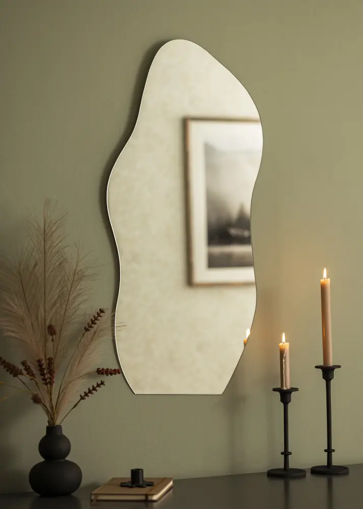 Ez egy falitükör trendi kialakítással, melynek oldalai lágy, hullámzó formájúak. Az alsó széle egyenes, ami különösen elegánssá teszi a tükröt, ha egy bútor fölé helyezik, ahol a tükör alsó széle párhuzamos vonalat képez a komód vagy az oldalsó asztal felső részével. A tükör hátoldalán falra szerelhető tartóelemek találhatóak, és függőleges helyzetben szerelik fel a falra.