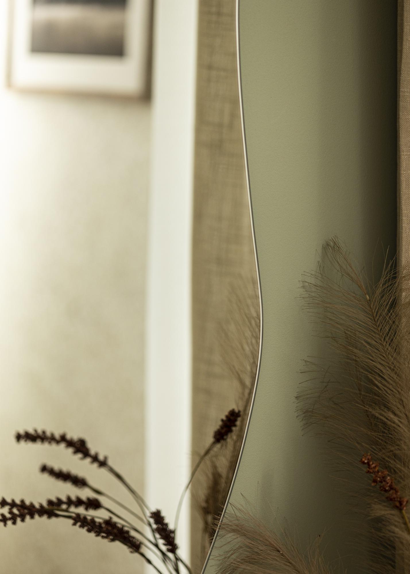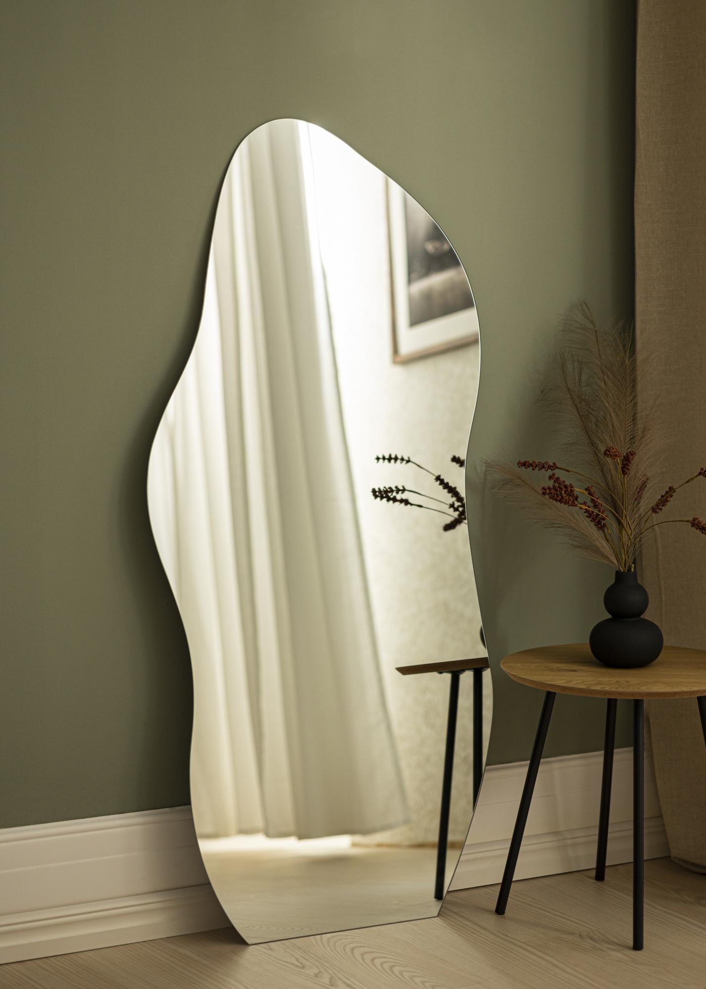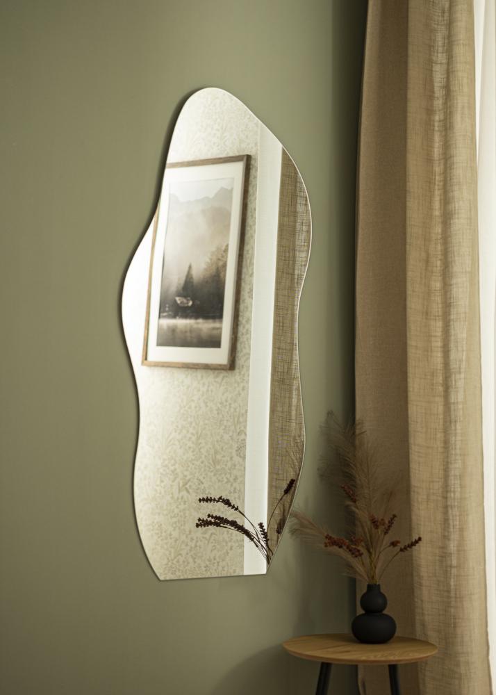 Ez egy falitükör divatos dizájnnal, oldalai lágy, hullámos formával. Az alsó széle egyenes, ami különösen elegánssá teszi a tükröt, ha egy bútor fölé akasztják, ahol a tükör alsó éle párhuzamos vonalat alkot a szekrény vagy oldalasztal felső részével. A tükör hátulján fali rögzítők találhatók, és függőleges helyzetben szerelhető a falra.