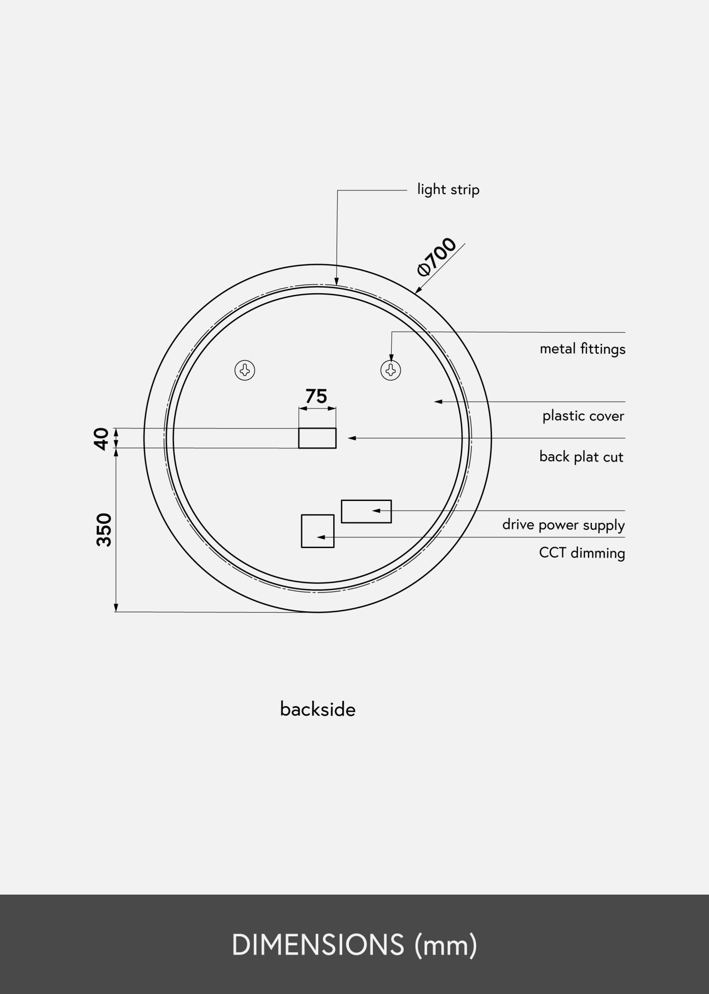 A tükör fürdőszobai használatra jóváhagyott, de időtlen és elegáns kialakítása miatt más falakon is jól mutat a lakásban. A tükör átmérője 70 cm, mindössze 3 cm mély, és falra szerelhető tartók vannak hozzá. A tükör rögzített telepítésre szolgál, és kapcsolóra van kötve. Ahhoz, hogy a tükör megfelelően működjön, szokásos kapcsolóra kell csatlakoztatni, nem pedig dimmer kapcsolóra.