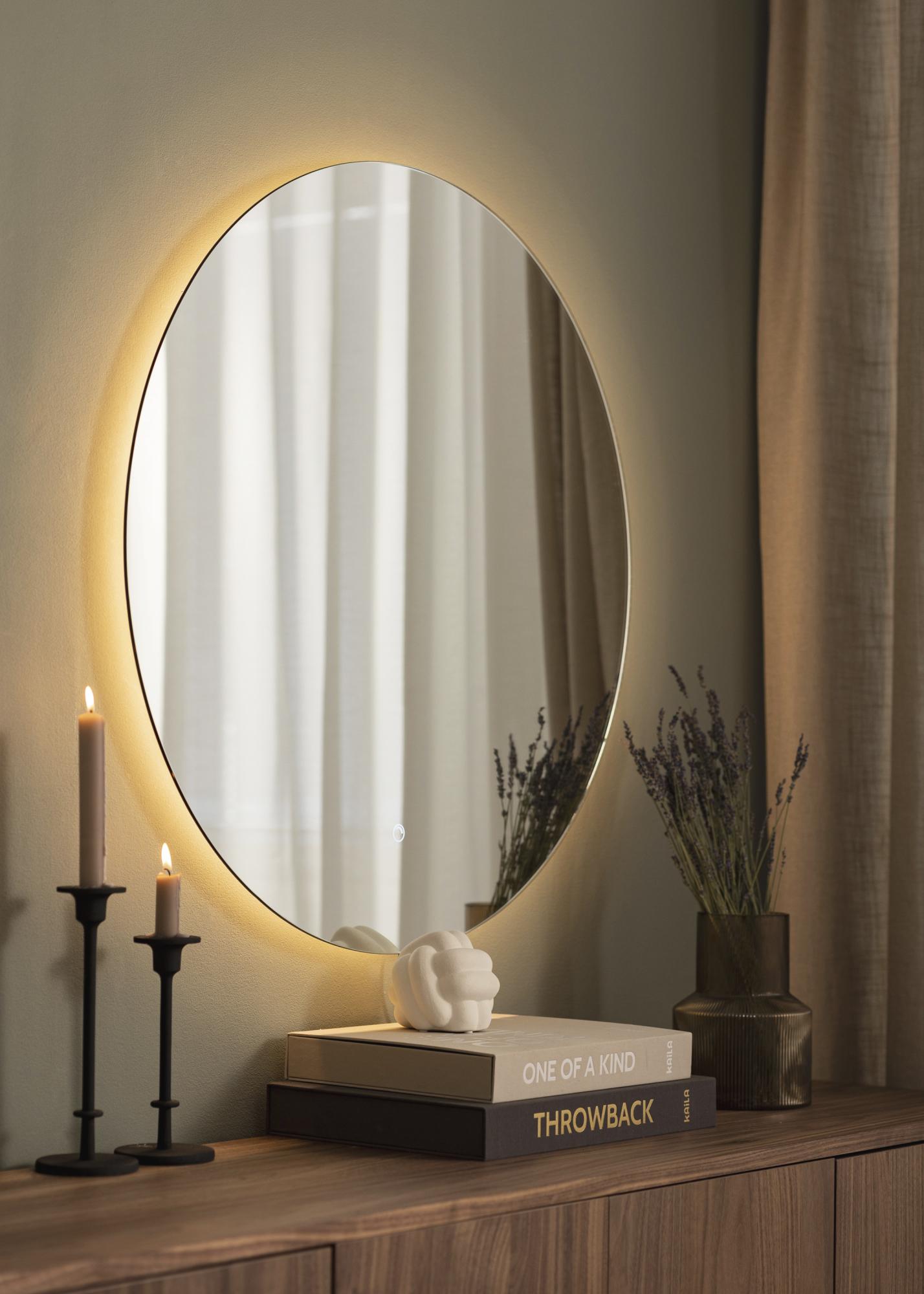 Ez egy klasszikus fürdőszobai tükör kerek formában a svéd KAILA-tól. A fürdőszobai tükör beépített szabályozható LED világítással rendelkezik körül, amely hátulról világít, és elöl kellemes meleg fehér fényt ad 3000K-on. A világítás szabályozható, és egyszerűen beállíthatja a világítás erősségét a gomb néhány másodpercig történő lenyomásával. Amikor legközelebb bekapcsolja a világítást, a tükör emlékezni fog, milyen fényerőre volt beállítva. A LED energiatakarékos fényforrás, amely egyenletes és természetes fényt ad.