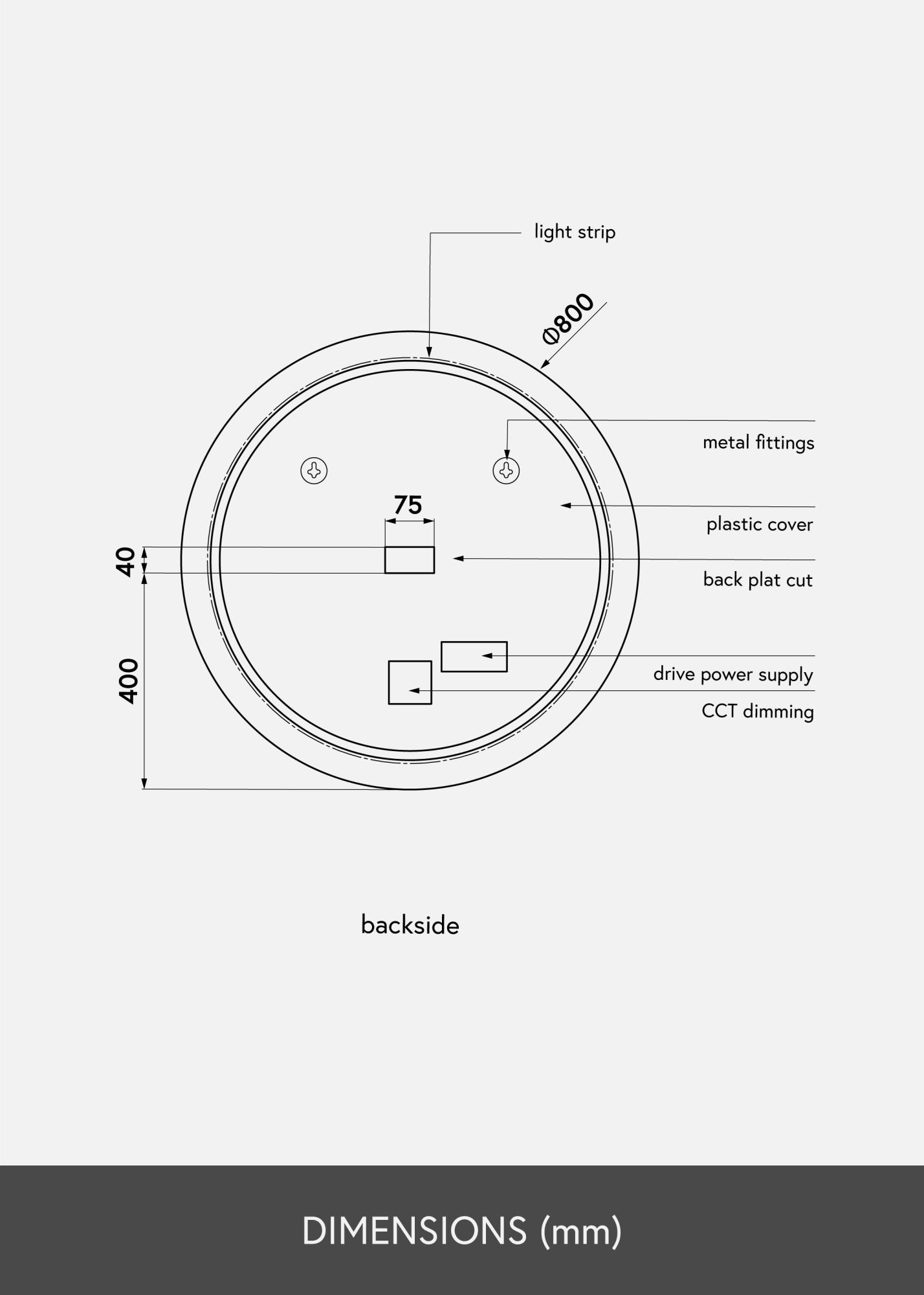 A tükör fürdőszobai használatra engedélyezett, de időtlen és elegáns kialakítása más falakon is jól mutat otthon. A tükör átmérője 80 cm, mindössze 3 cm mély, és falirögzítőkkel rendelkezik. A tükör állandó telepítésre készült, és kapcsolóhoz csatlakozik. A tükör helyes működéséhez normál kapcsolóhoz kell csatlakoztatni, nem szabályozható kapcsolóhoz.