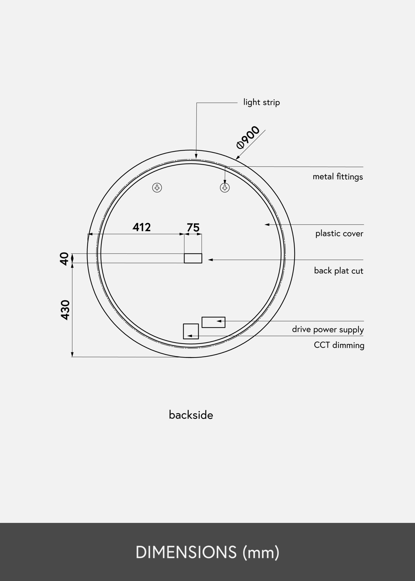 A tükör fürdőszobába van jóváhagyva, de időtlen és elegáns kialakítása más falakon is jól mutat az otthonban. A tükör átmérője 90 cm, csak 3 cm mélységű, és falra szerelhető. A tükör fix telepítésre készült, és kapcsolóval kell összekapcsolni. A tükör helyes működéséhez szükség van egy hagyományos kapcsolóra, nem szabályozható kapcsolóra.