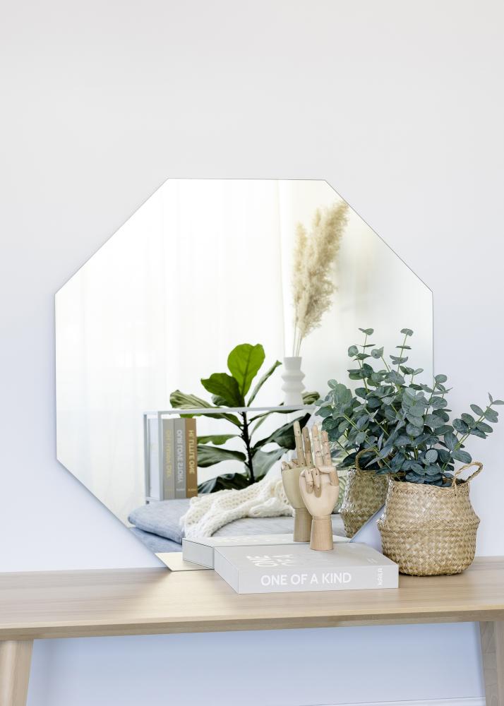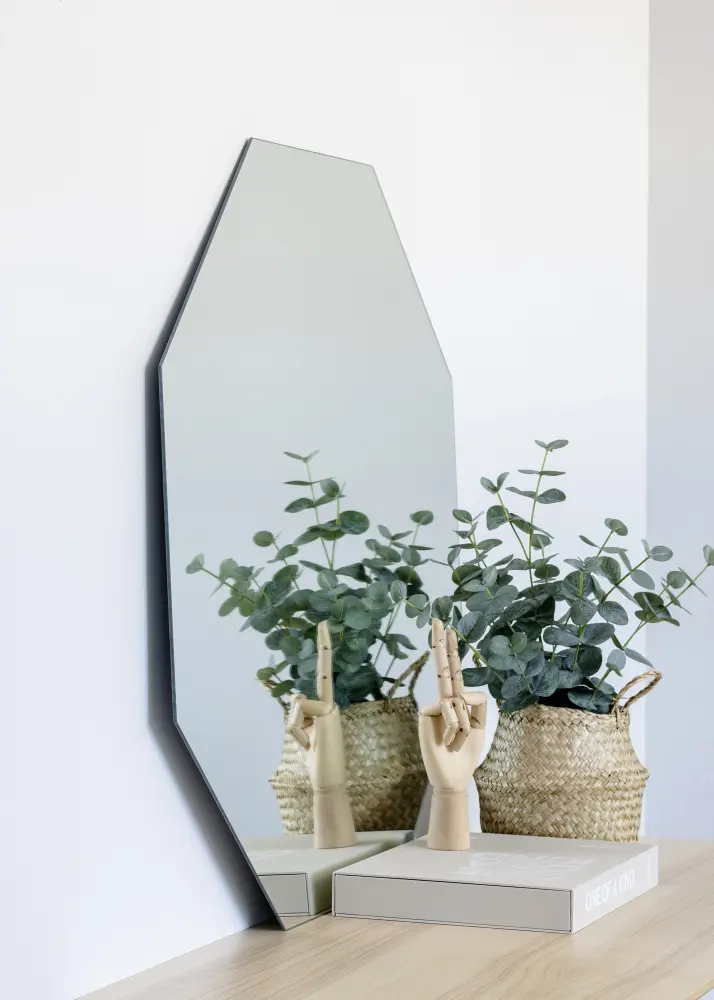 Ez a stílusos tükör a KAILA-tól tökéletes a nappaliba, előszobába vagy hálószobába. A keret nélküli nyolcszögletű forma tökéletes egyensúlyt teremt a minimalizmus és a csillogás között. Különböző formák és anyagok használatával dinamikát hozhatsz létre otthonodban, és ez a szögletes tükör szép kontrasztot ad más bútoroknak és lakberendezési részleteknek. A tükör falra szerelhető, és könnyen felakasztható a falra.