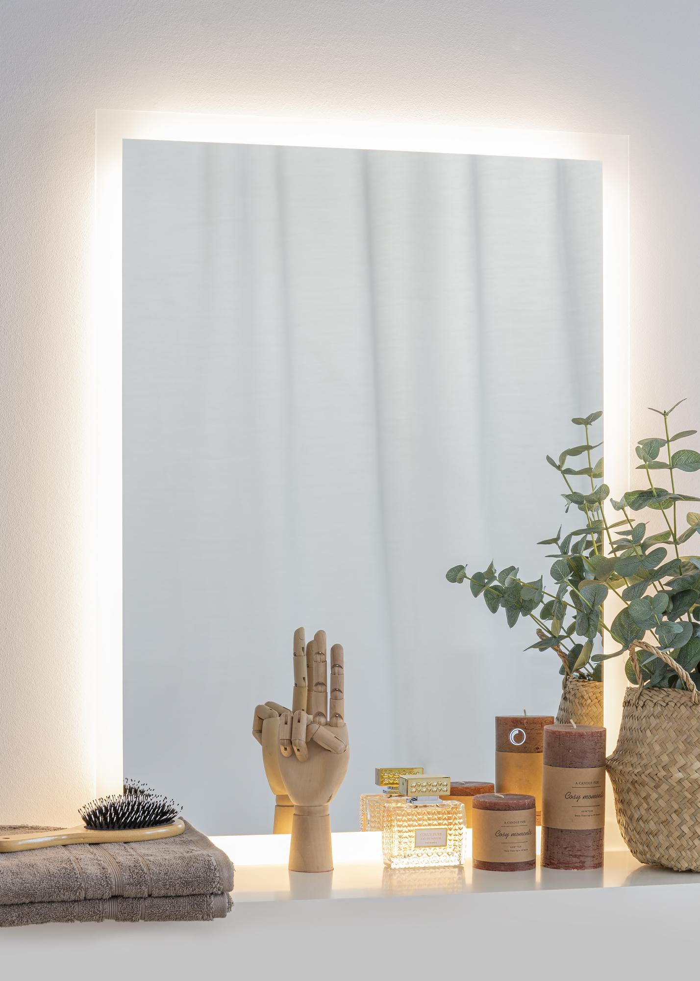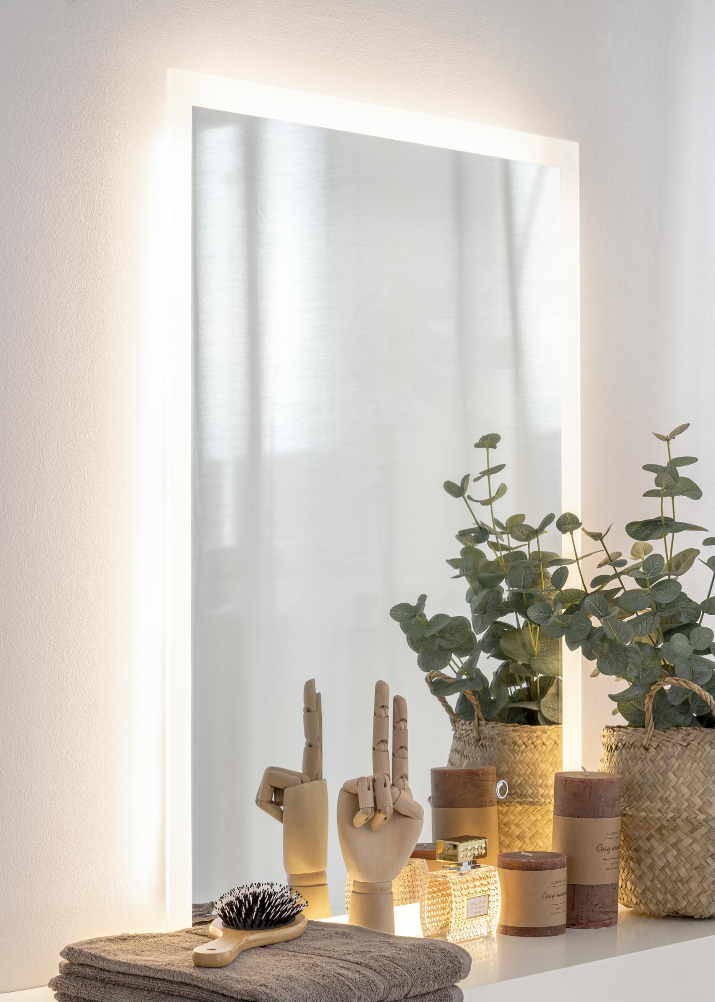 Ez egy elegáns téglalap alakú fürdőszobai tükör a svéd KAILA márkától. A tükör beépített LED világítással rendelkezik, amely szegélyként fut végig, és kellemes meleg fehér fényt ad 3000K-on. A világítás fényereje szabályozható, és egy vízálló érintésgombbal állítható be. Ha az ujját az érintésgombon tartja, a fényerő a kívánt szintre csökken. Ez a tükör megjegyzi a legutóbbi beállítást, így mindig kellemes fényben tükröződhet a következő bekapcsoláskor!