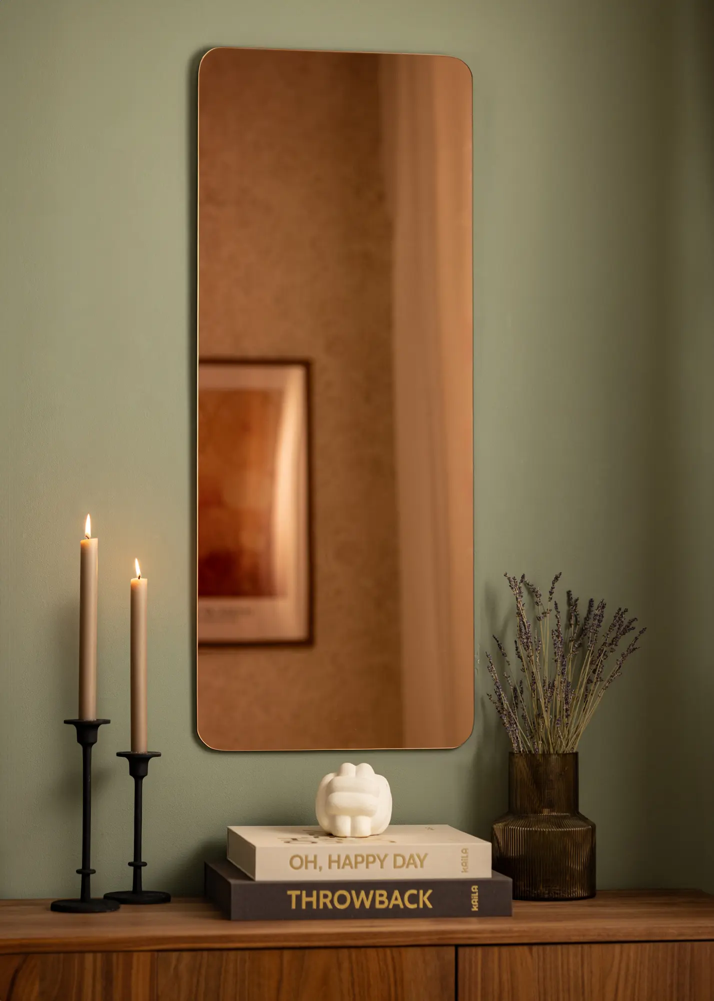 Egy téglalap alakú tükör, lágyan lekerekített sarkokkal, amely sok eleganciát kölcsönöz az összhatásnak! A tükör rosé-arany tónusú tükörüveggel rendelkezik, ami nagyon feltűnővé teszi a faladon – ugyanakkor megőrzi elegáns megjelenését. Ez a trendi tükör emellett nagyon vékony, és nincs kerete, ami tovább erősíti a letisztult érzést.