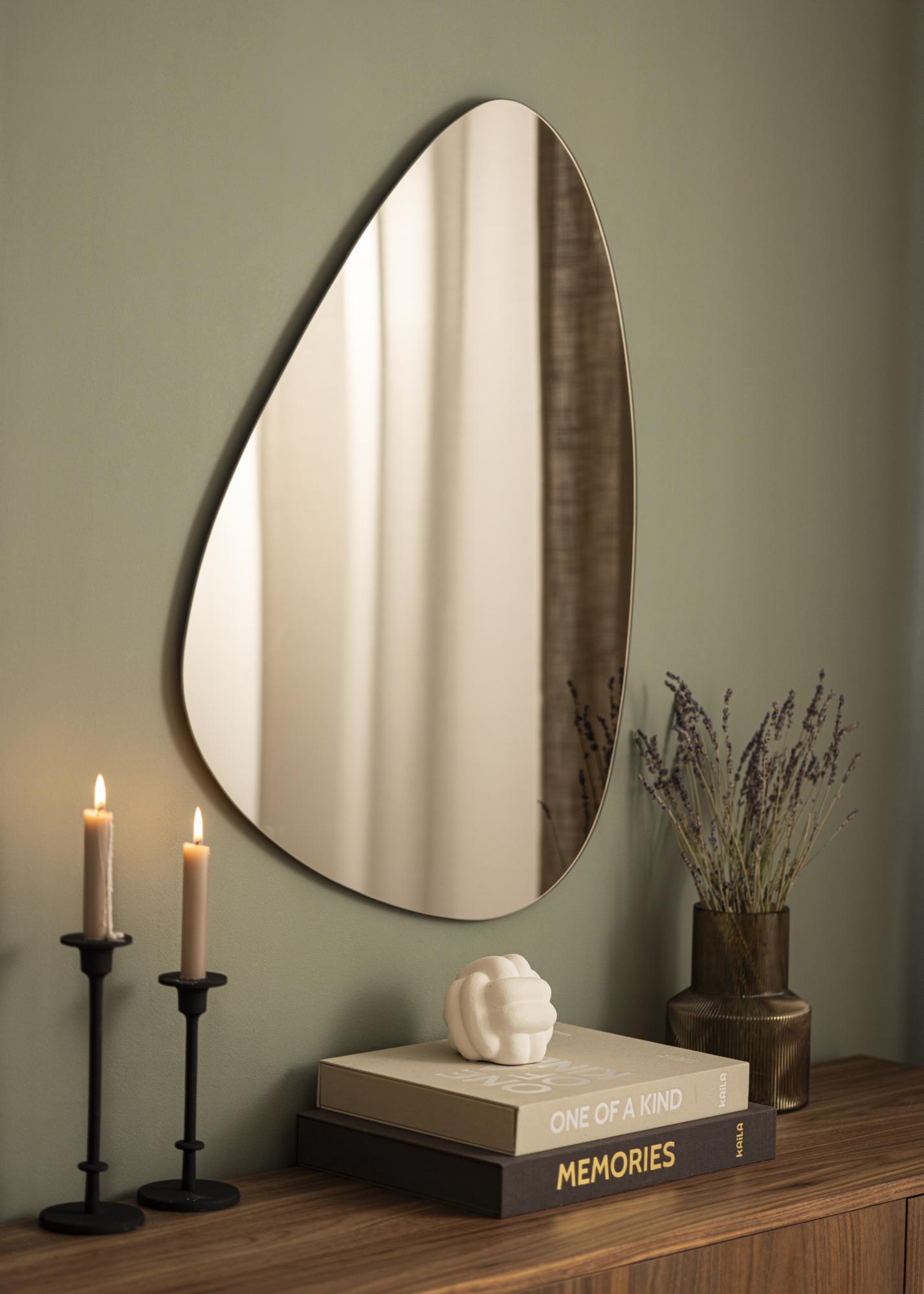 Ez az aszimmetrikus tükör igazán mutatós és divatos belsőépítészeti elem lesz otthonodban! Az érdekes tojásformájú dizájn mellett ez a tükör egy stílusos bronz árnyalatú tükröződő üveggel is rendelkezik, amely tovább erősíti a modern megjelenést és szépen harmonizál sokféle színsémával. A puha forma, valamint az a tény, hogy a tükör nagyon vékony és nincs kerete, ritka elegáns és karcsú érzést kölcsönöz a tükörnek. Tökéletes funkcionális és trendi fali dekorációként a nappaliban, előszobában vagy hálószobában.