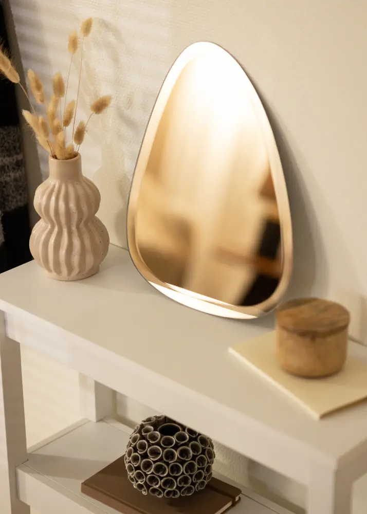 A 30x40 cm-es méretével a tükör tökéletes kisebb falakra vagy egy nagyobb falkompozíció részévé. A csepp formájú design lágy és organikus benyomást nyújt, amely kiegészíti a különböző belsőépítészeti stílusokat. Engedd meg, hogy ez a tükör az otthonod részévé váljon, és élvezd szépségét és funkcionalitását minden nap.