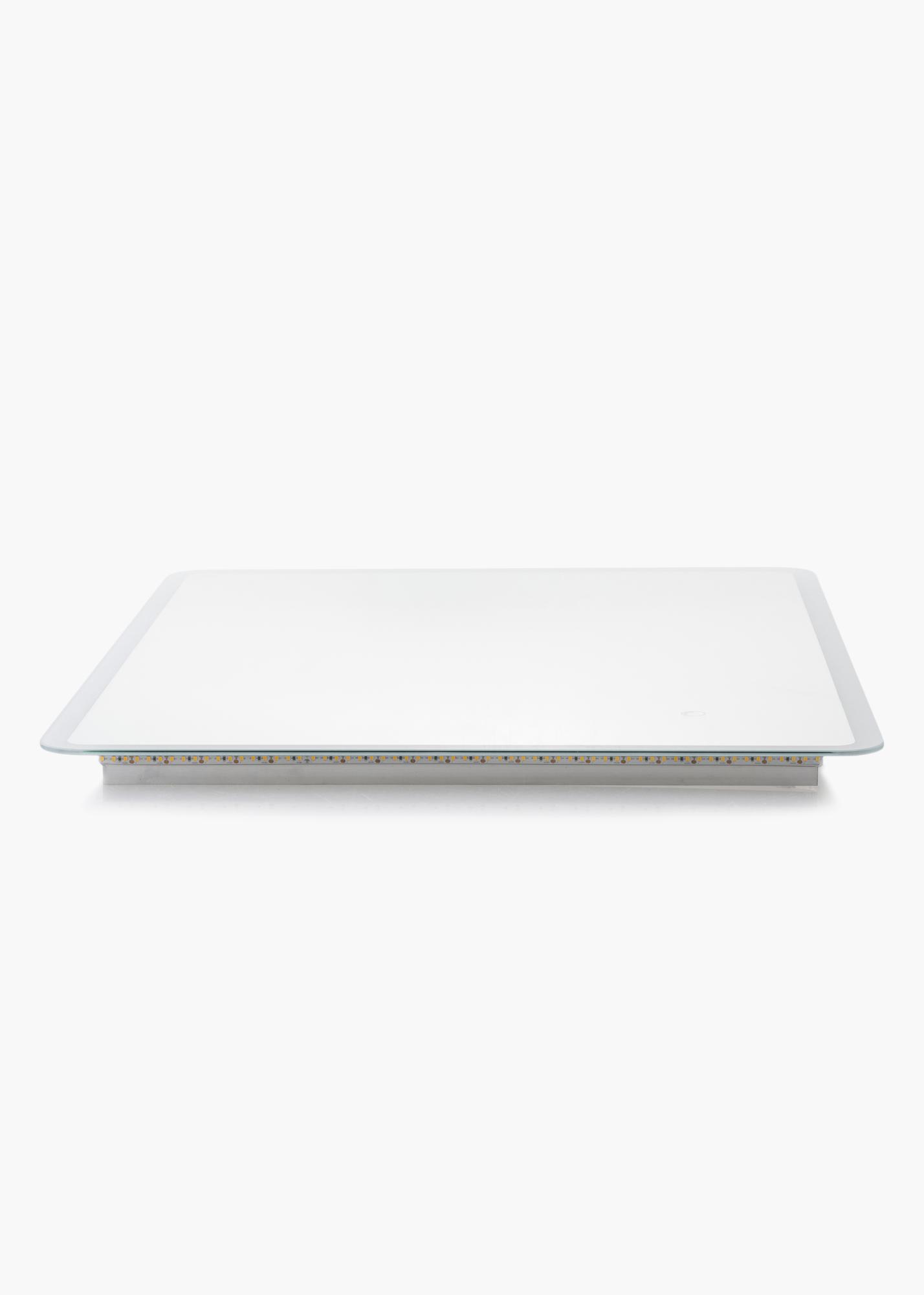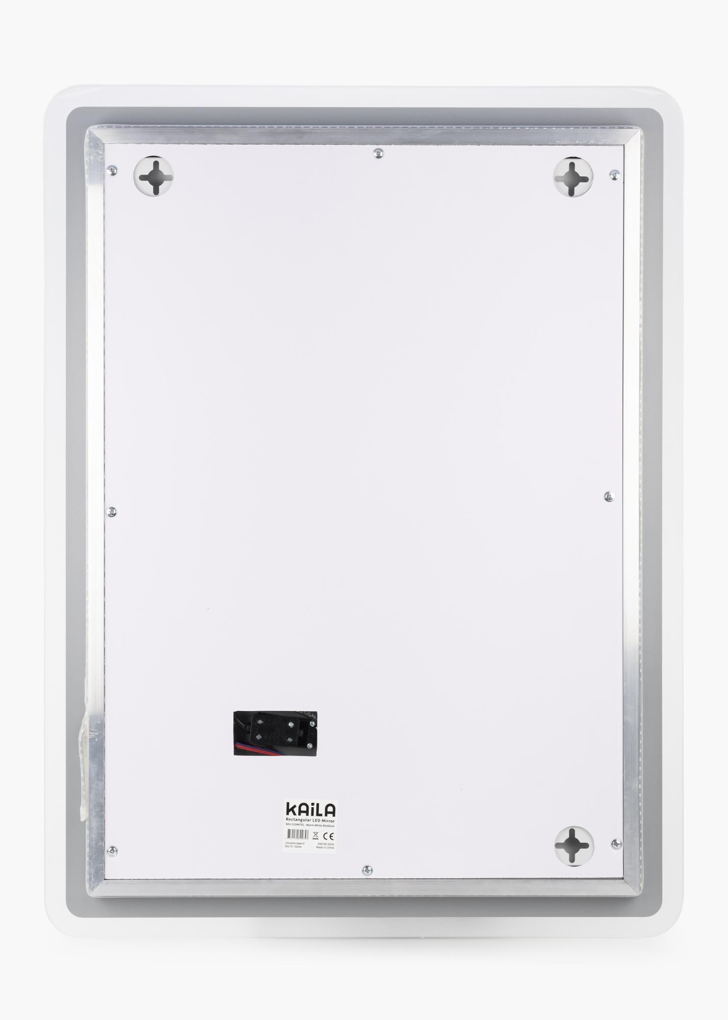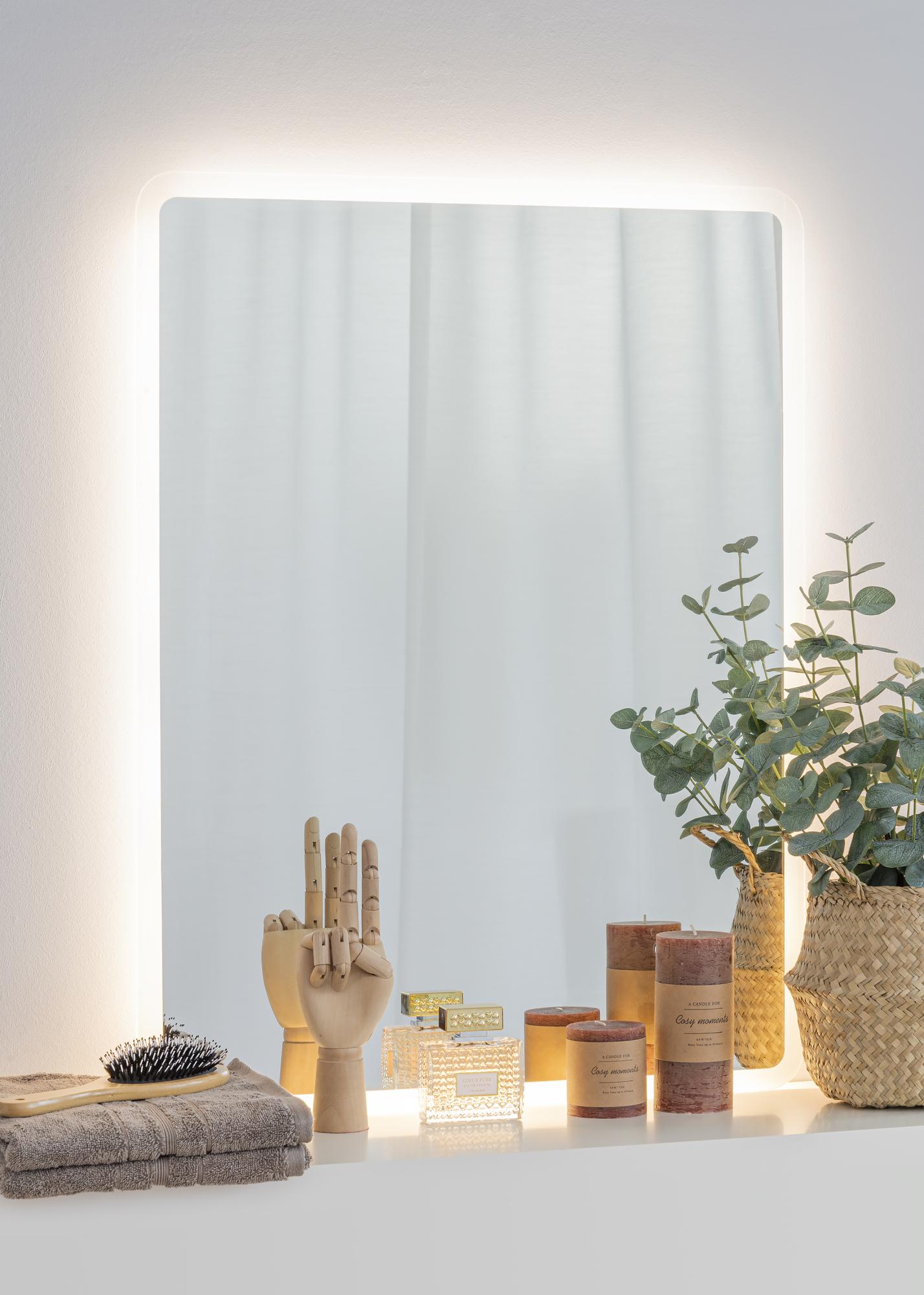 Ez a fürdőszobai tükör időtlen dizájnnal rendelkezik, téglalap alakú és lágy, lekerekített sarkokkal. A szélén integrált LED világítás fut végig, ami szépen keretezi a tükröt. A LED világítás a tükör mögött világít, és 3000K meleg fehér árnyalatú fényét előrefelé adja. A világítás szabályozható, és egyszerűen állíthatja az erősségét úgy, hogy néhány másodpercig lenyomva tartja az érintőgombot a képernyőn. A tükör megőrzi az utolsó fénybeállítást a következő alkalomra, amikor bekapcsolja a világítást. A tükör fürdőszobai használatra van jóváhagyva. A fürdőszobai tükröt fix bekötésre tervezték, és egy kapcsolóhoz csatlakoztatják. A tükör helyes működéséhez általános kapcsolóhoz kell csatlakoztatni, nem pedig dimmer kapcsolóhoz.