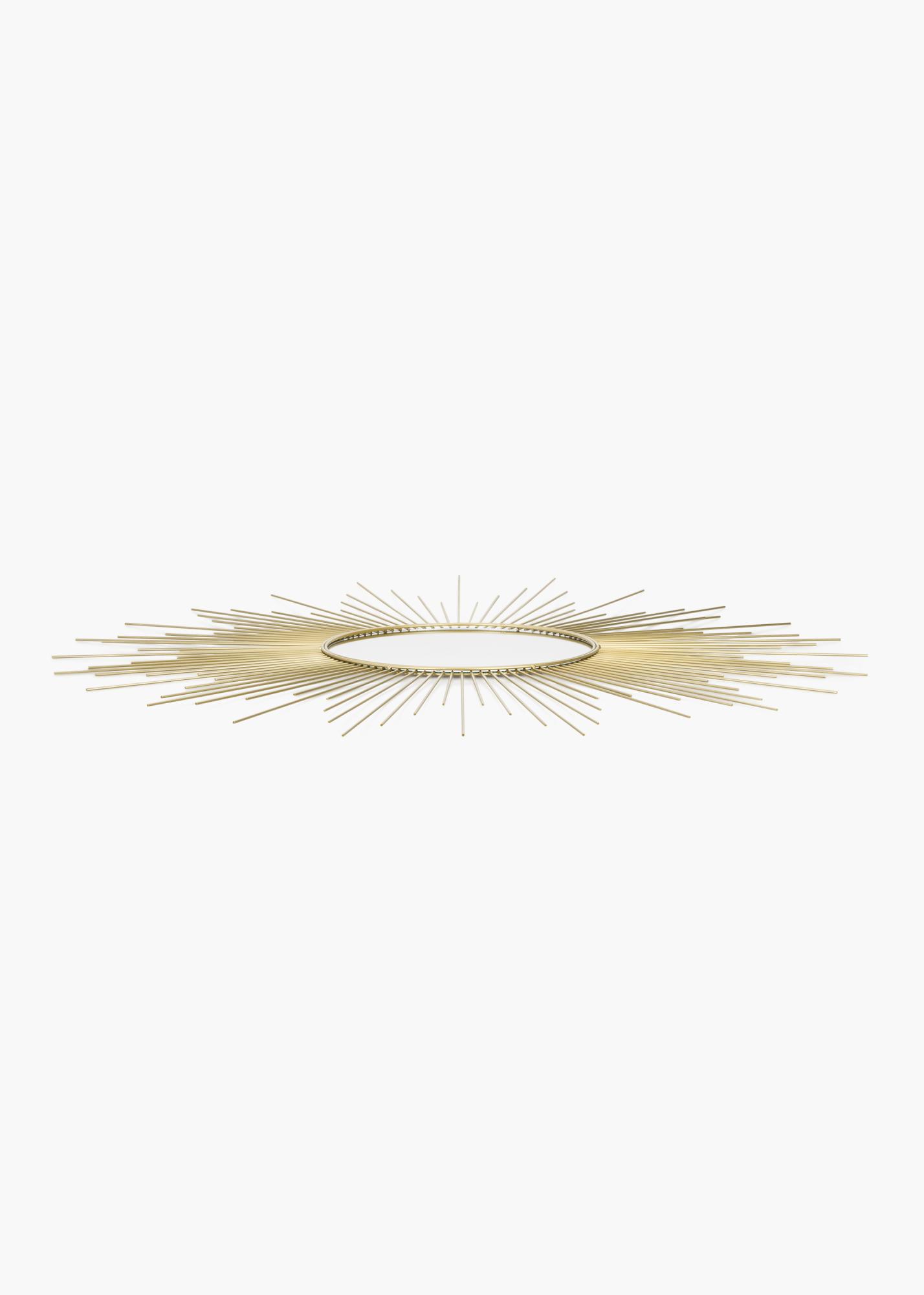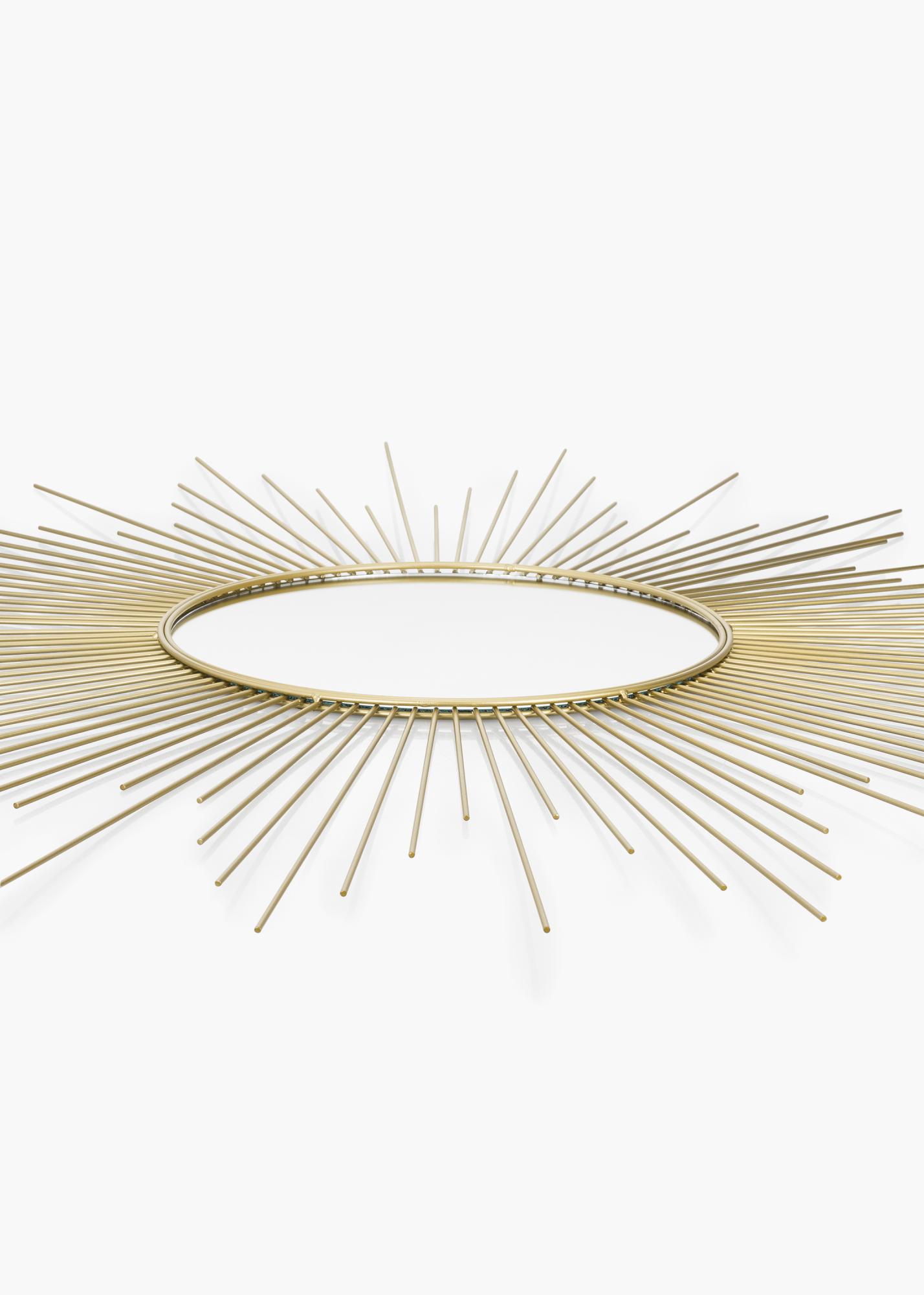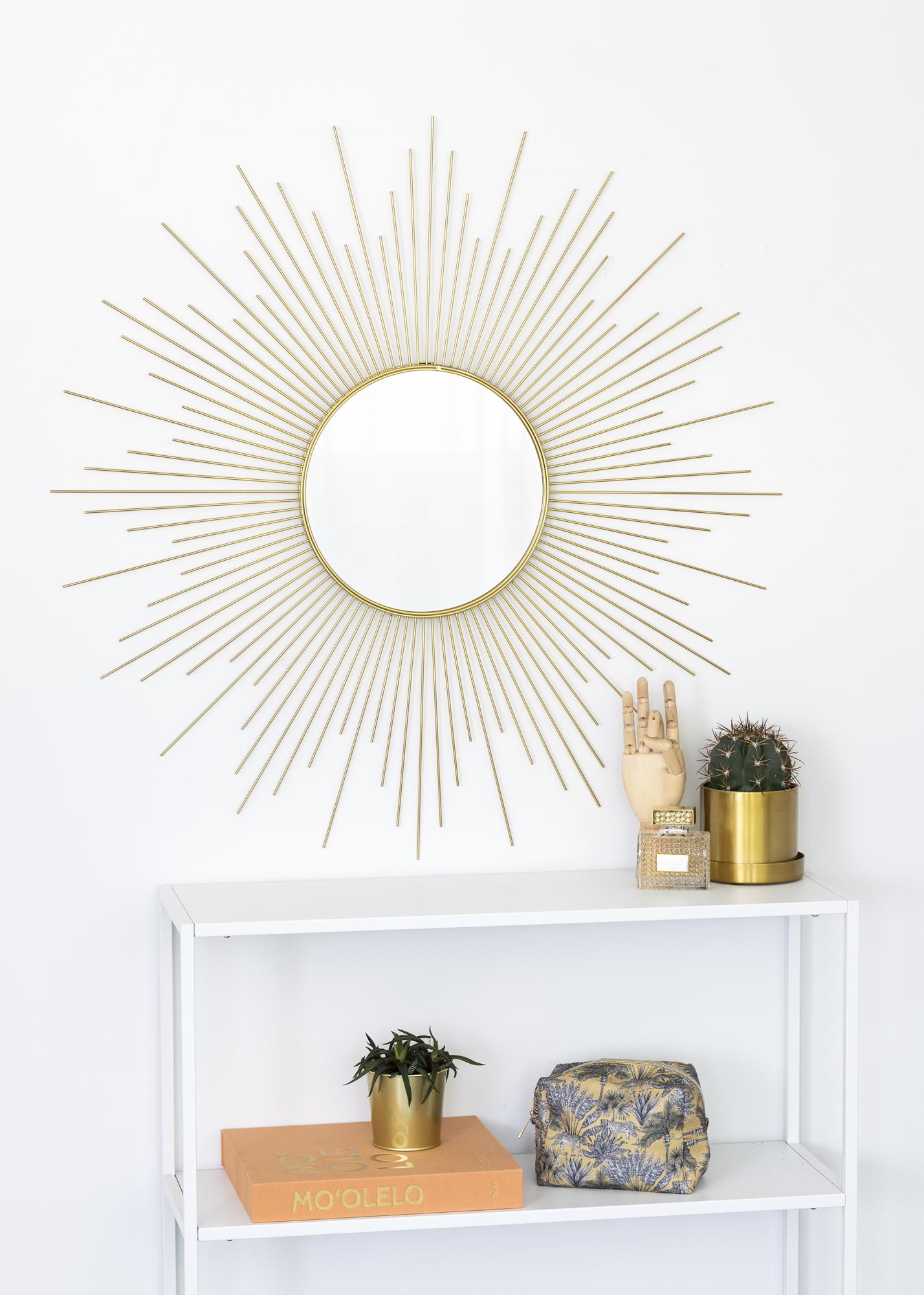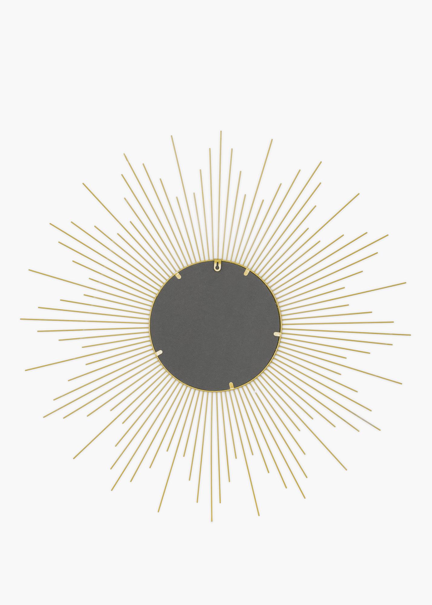 Ez egy kör alakú fali tükör nagyon dekoratív dizájnnal. A tükörüveget egy csillagra emlékeztető minta keretezi, amely szép arany árnyalatban pompázik. Helyezze ezt a szép tükröt otthonába egy jól megválasztott helyre, ahol dekoratív elemként igazán kiteljesedhet, hogy figyelemfelkeltő enteriőr részletté váljon. A tükör külső mérete 90x90 cm, és fémből készült.