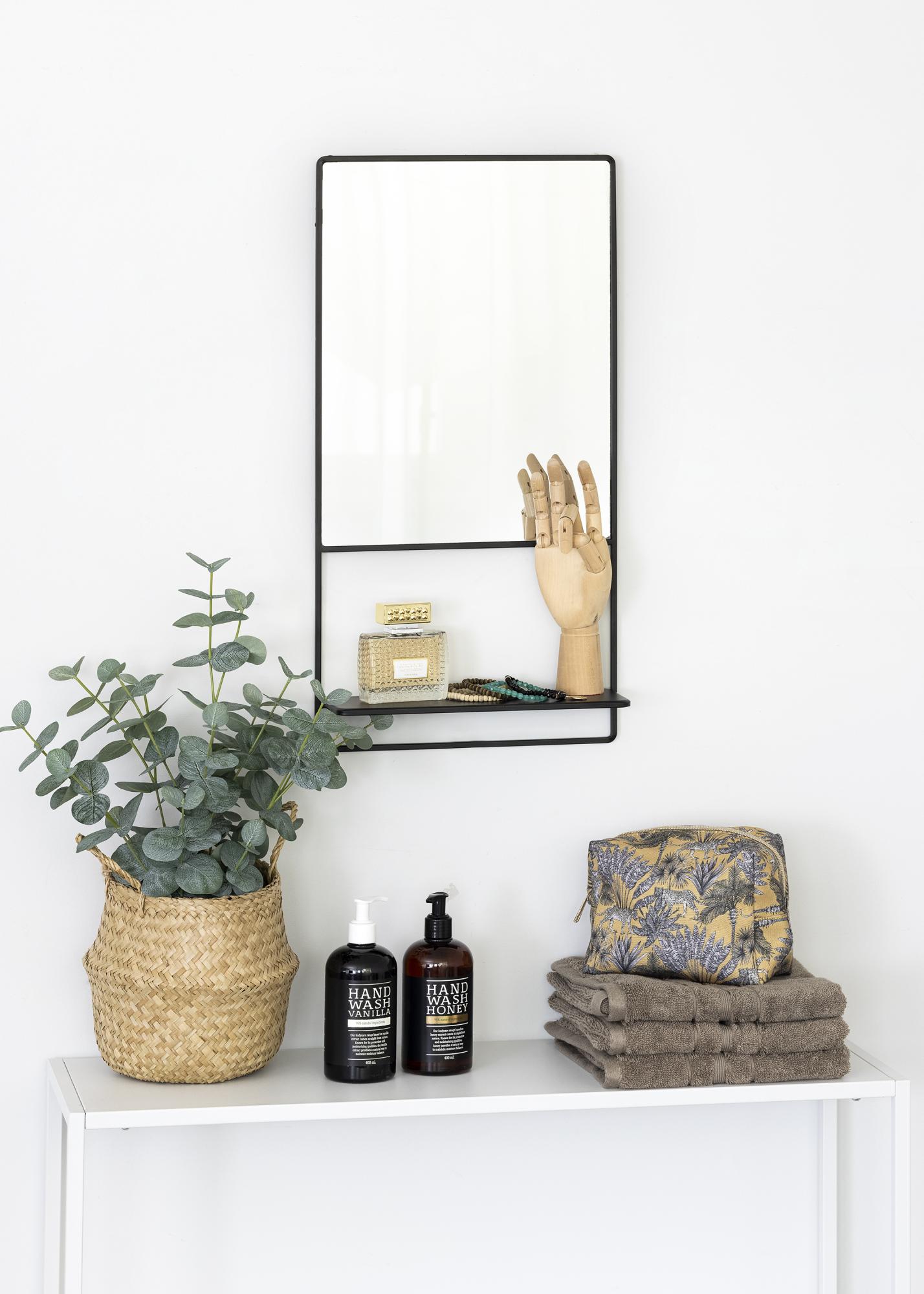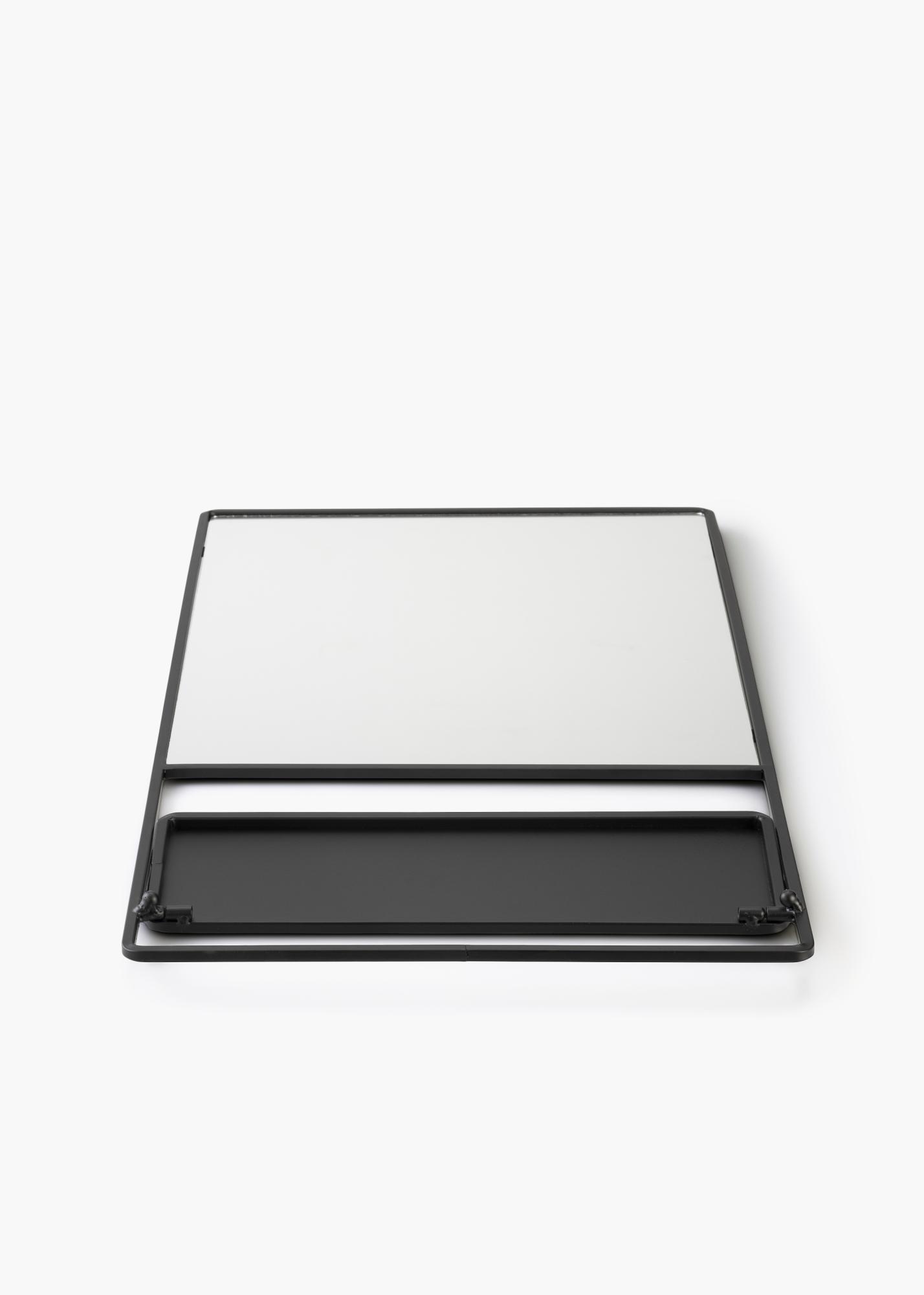 Ez a stílusos fali tükör polccal a KAILA svéd dizájnja. A tükör fekete árnyalatban pompázik, és fémből készült. Maga a tükörfelület téglalap alakú, és fekete fém keret övezi. Alul van egy polc - tökéletes, hogy szép dekorációt vagy némi sminktárolást lehessen ráhelyezni! A tükör mérete 31x60 cm, és falra szerelhető.