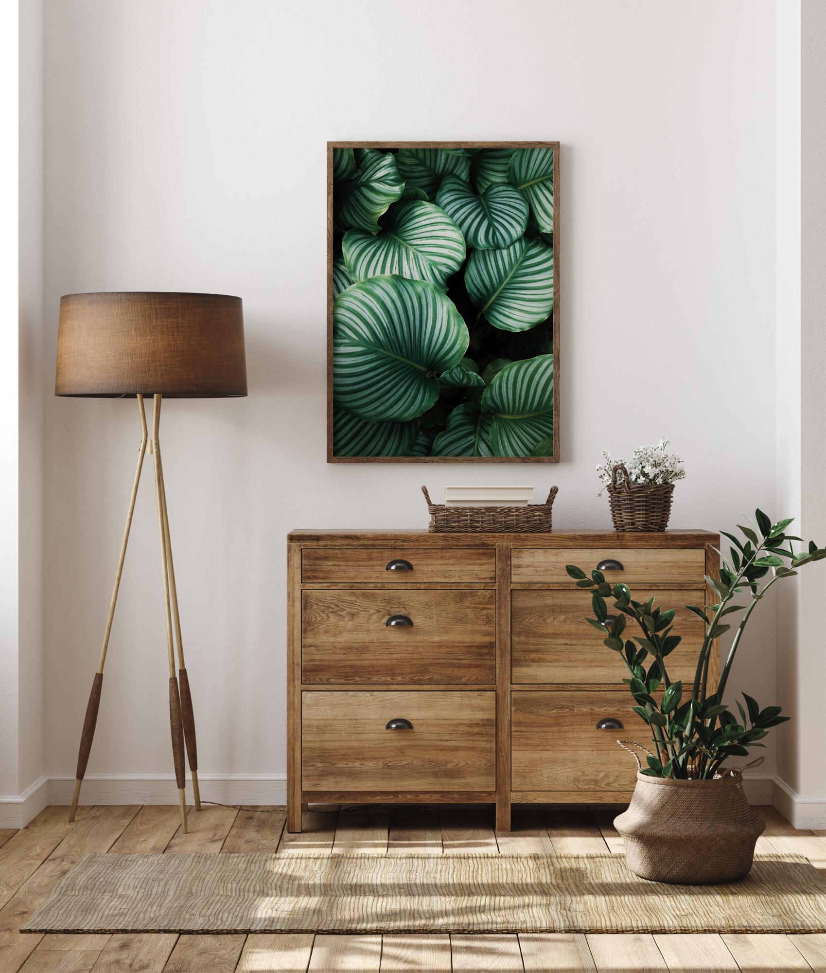 Egy gyönyörű poszter madártávlatból, sötét, zöld levelekkel egy kalateáról. A napfény besugározza a leveleket, átható fényt teremtve. Különböző zöld árnyalatok intenzív környezetet alkotnak, így ideális képpé teszik, amelyet a nappaliban növényekkel körülvéve lehet felakasztani.