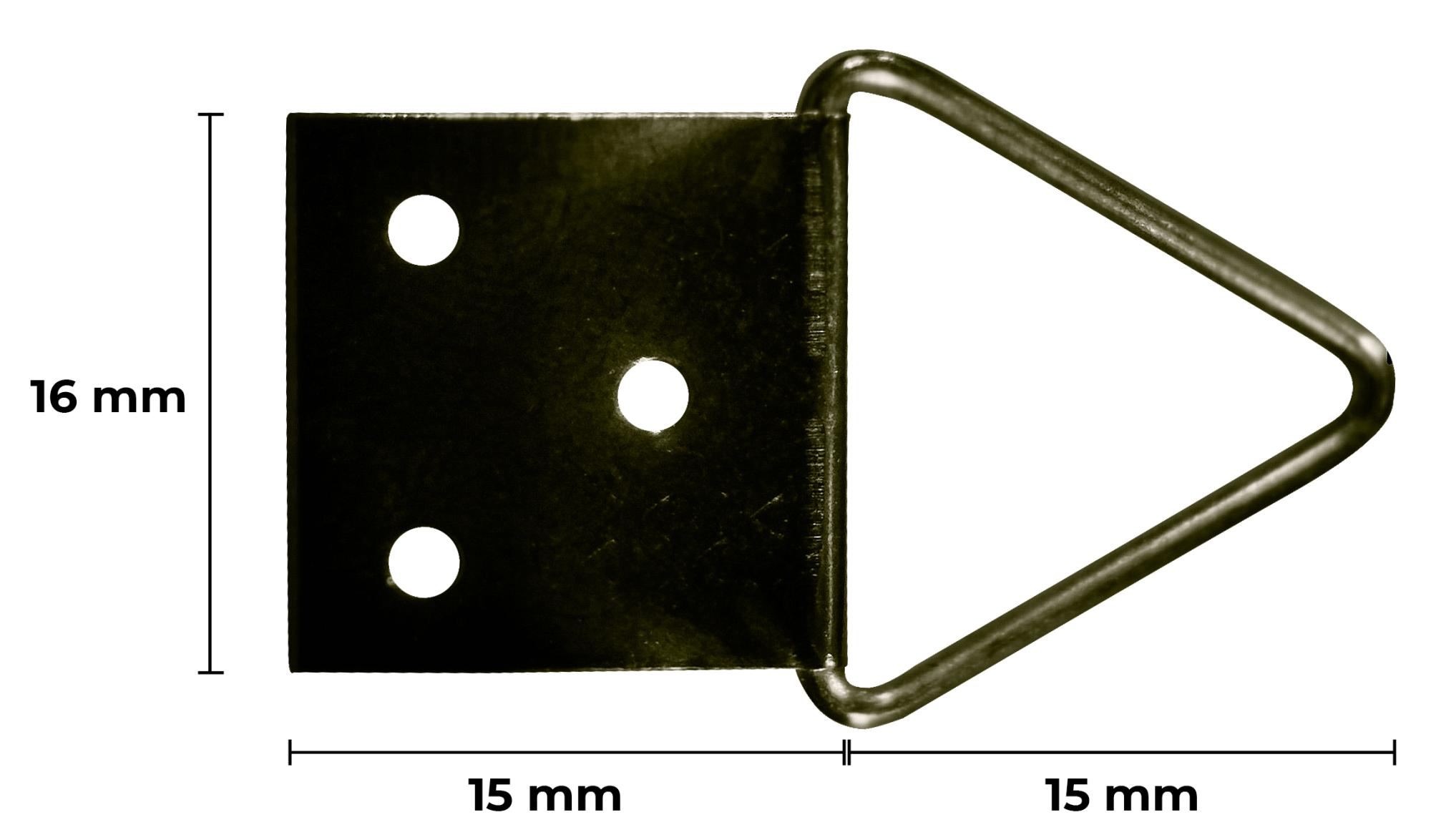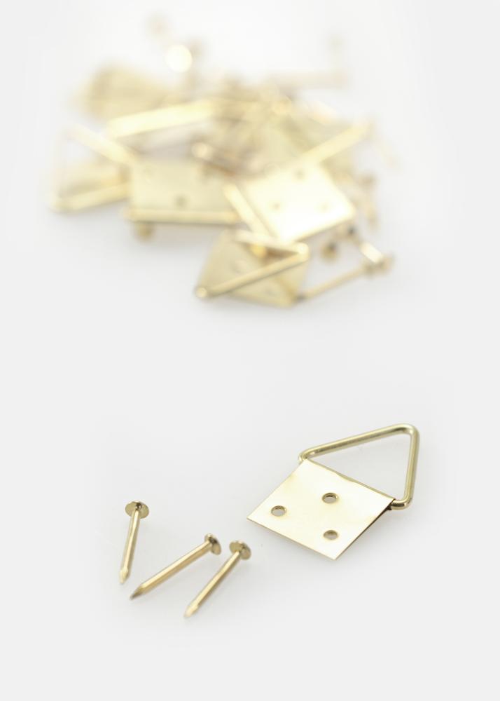 Háromszög alakú akasztó rézből. A keret hátuljára szögezhető. Használható egy vagy két akasztóként, ha képakasztó huzalt szeretne használni. Ez az akasztó kiválóan alkalmas kissé nagyobb képekhez (maximális méret: 60x90 cm)