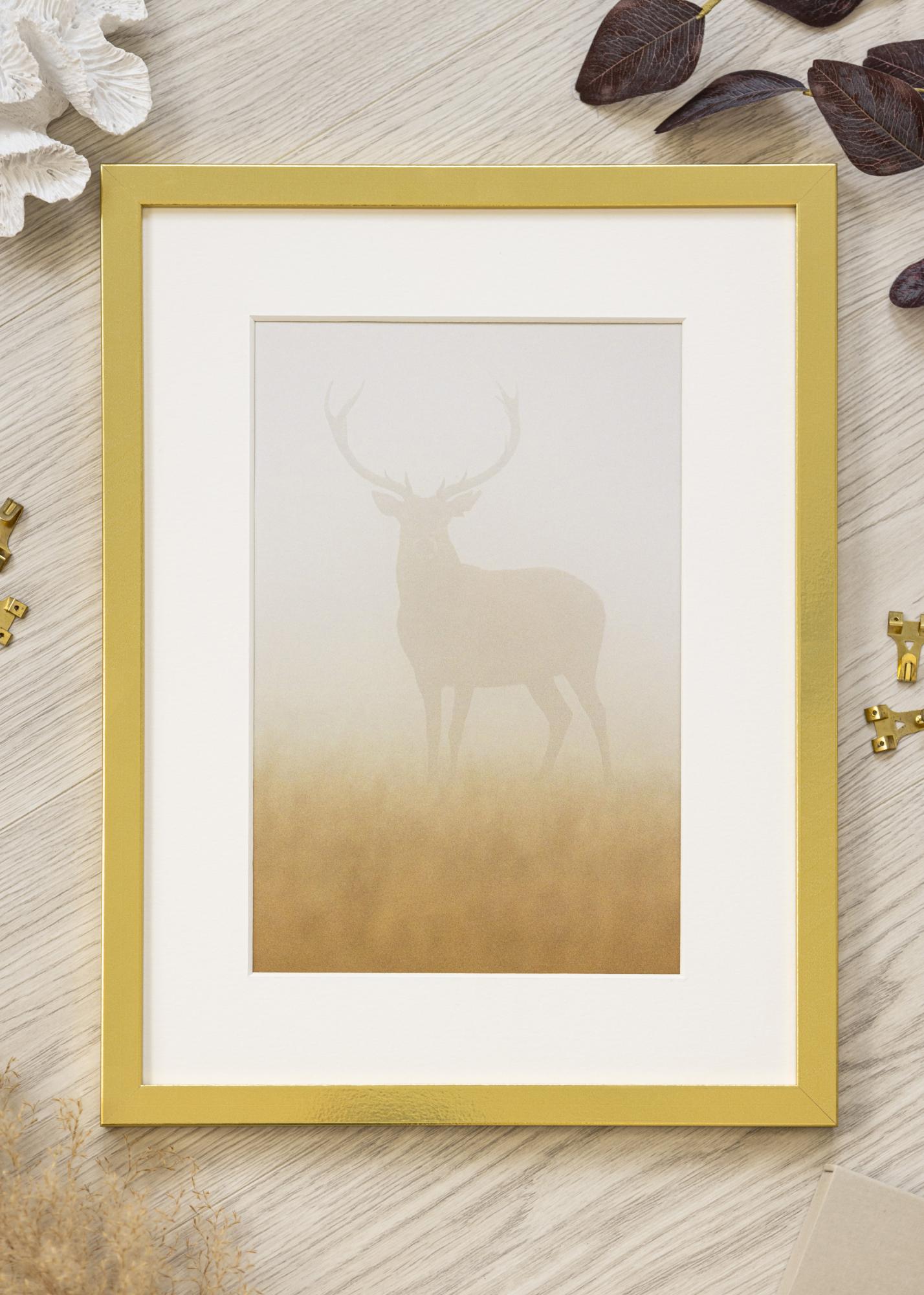 Ez a képkeret az elegancia és a modern dizájn tökéletes kombinációja. Luxus aranyszínű, stílusos profiljával bármelyik szobának kifinomult megjelenést kölcsönöz. A keret fából készült, és finom csillogással, enyhén texturált felülettel rendelkezik, ami fokozza exkluzív érzetét. Az éles és tiszta sarkok hozzájárulnak a minimalista megjelenéshez, így kiváló választás kedvenc motívumainak kiemelésére.
