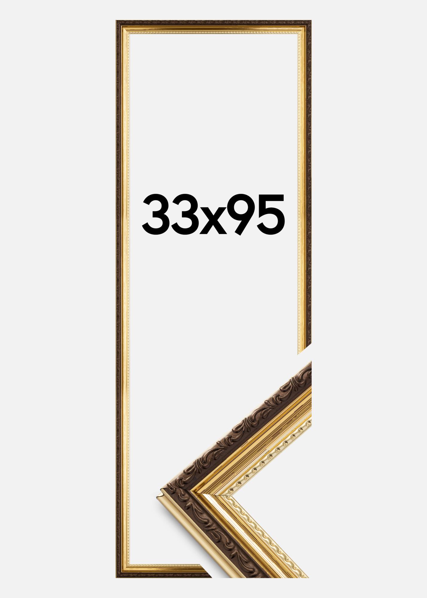 Gyönyörűen díszített, régi stílusú keretet keresel? Az Abisko Akrilüveg Arany egy masszív arany keret hihetetlenül elegáns díszekkel. A keret 25 mm széles léce fényes arany színű, közepén díszített barna szegéllyel. Az arany rész is díszített, hullámzó mintával a legközelebb az üveghez.