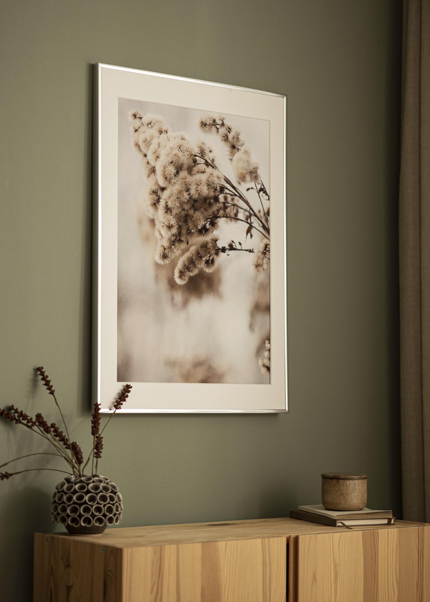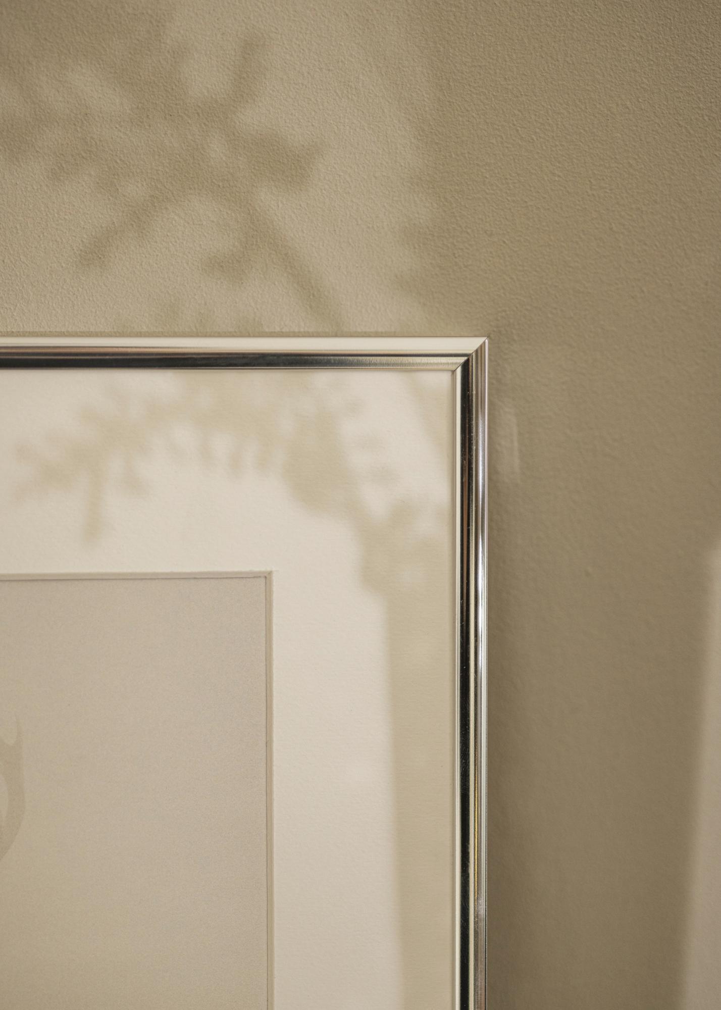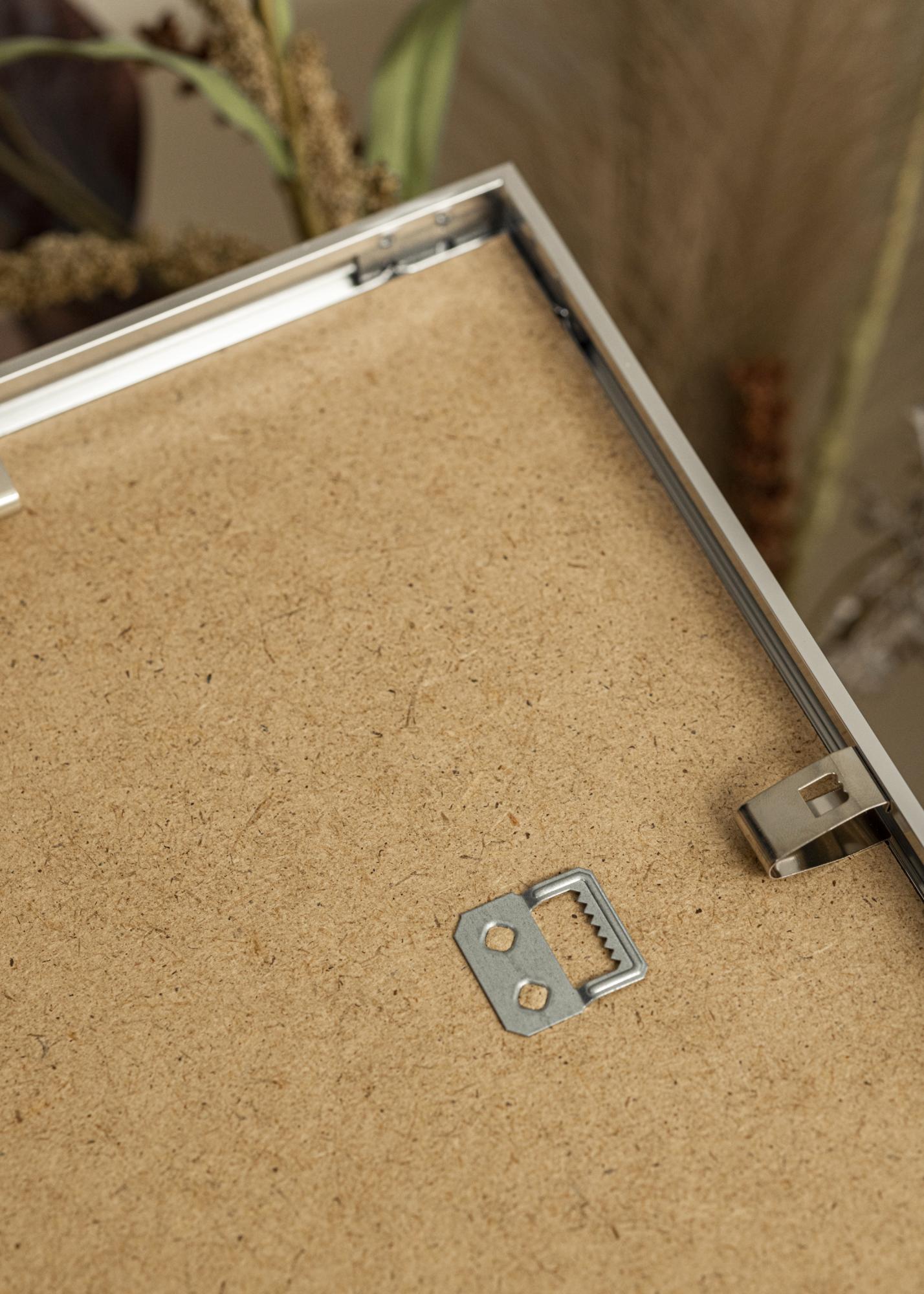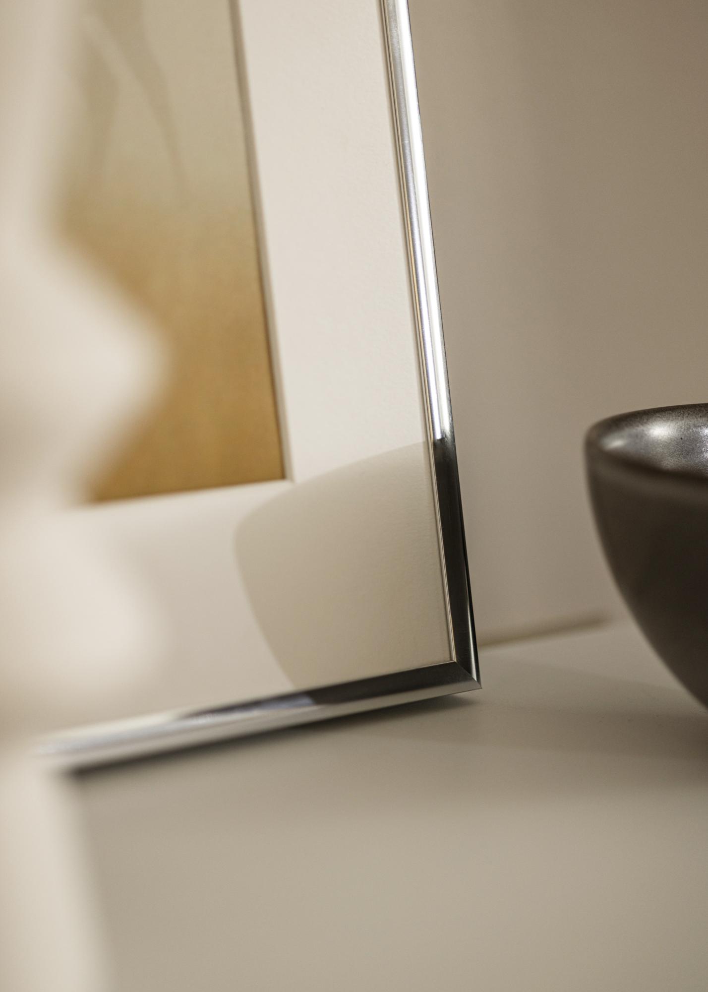 Ez egy masszív alumíniumkeret modern ezüst árnyalatban. A keskeny keret, melynek szélessége mindössze 9 mm, szép keretezést biztosít, anélkül hogy elvonná a figyelmet a motívumairól. A fényes felület tovább fokozza a keret divatos megjelenését. Ahhoz, hogy a motívumait a keretbe helyezze, lazítsa meg a hátlapot, amelyet kis fémkapcsok tartanak a helyén, majd helyezze be képeit a keret üvege mellé.