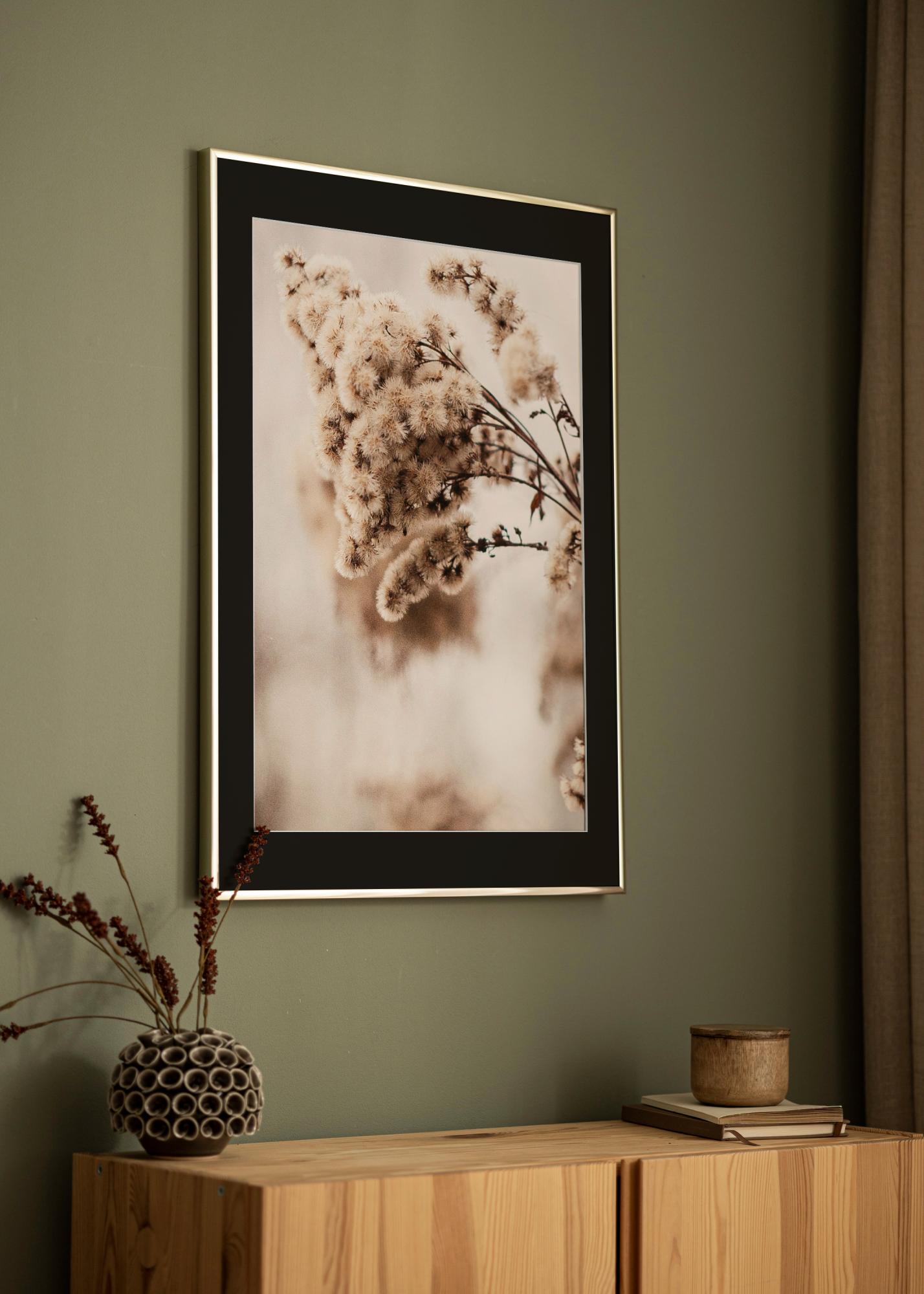A keret fényes, és finoman tükrözi a fényt, ami fokozza a kontrasztot a fekete paszpartuval szemben. Ez drámai keretezést teremt, és a tekintetet a motívumra vonzza.