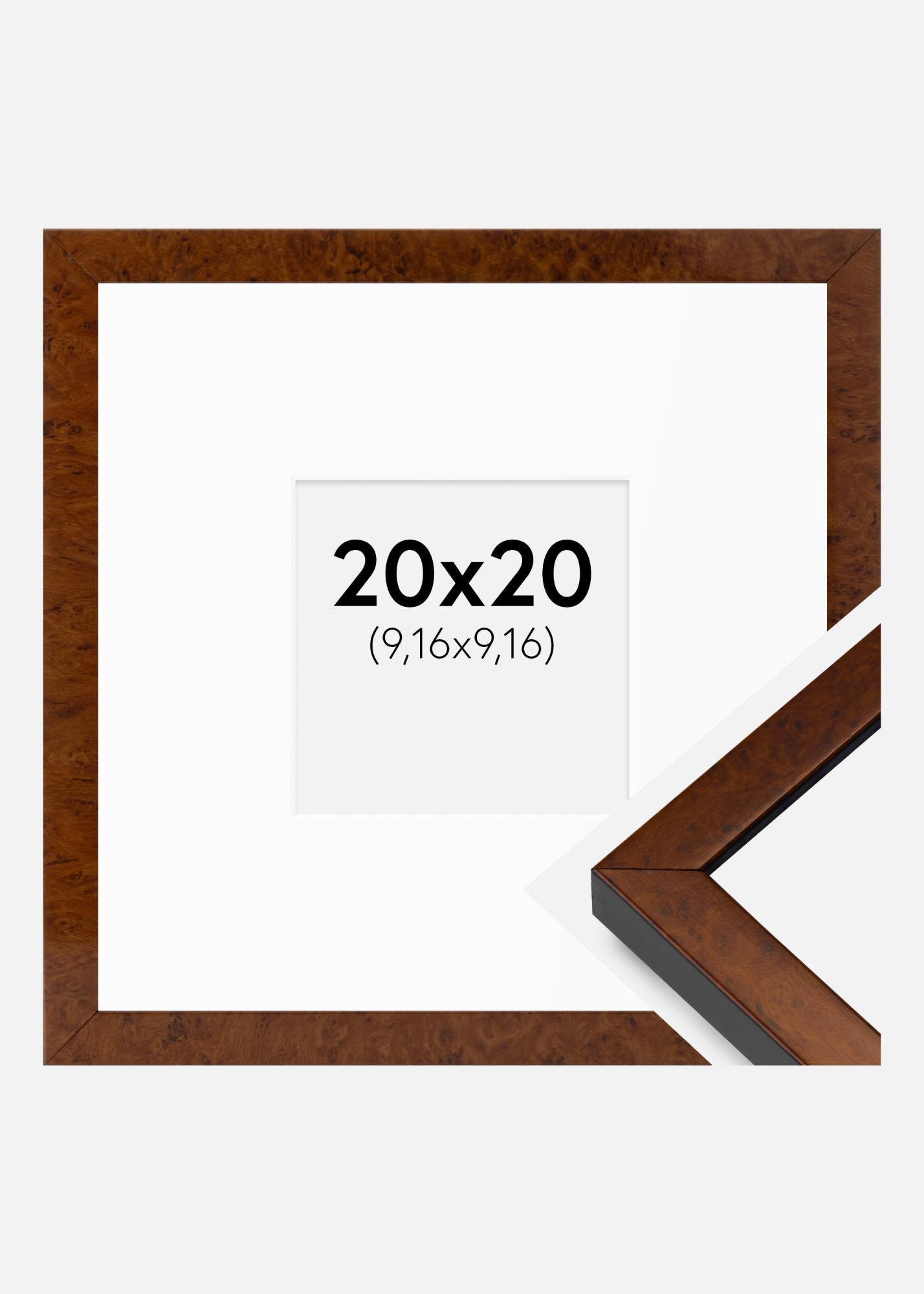 A keret szélessége 15 mm, mélysége pedig 20 mm, ami robusztus és stabil keretezést biztosít. A fehér paszpartu gyönyörű kontrasztot alkot a dió mintázattal, ízlésesen emelve ki a képet.
