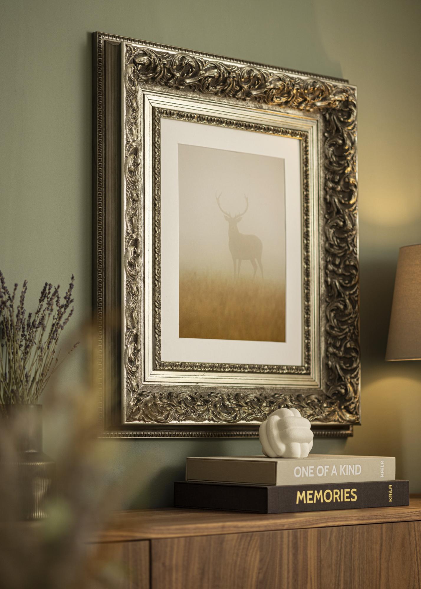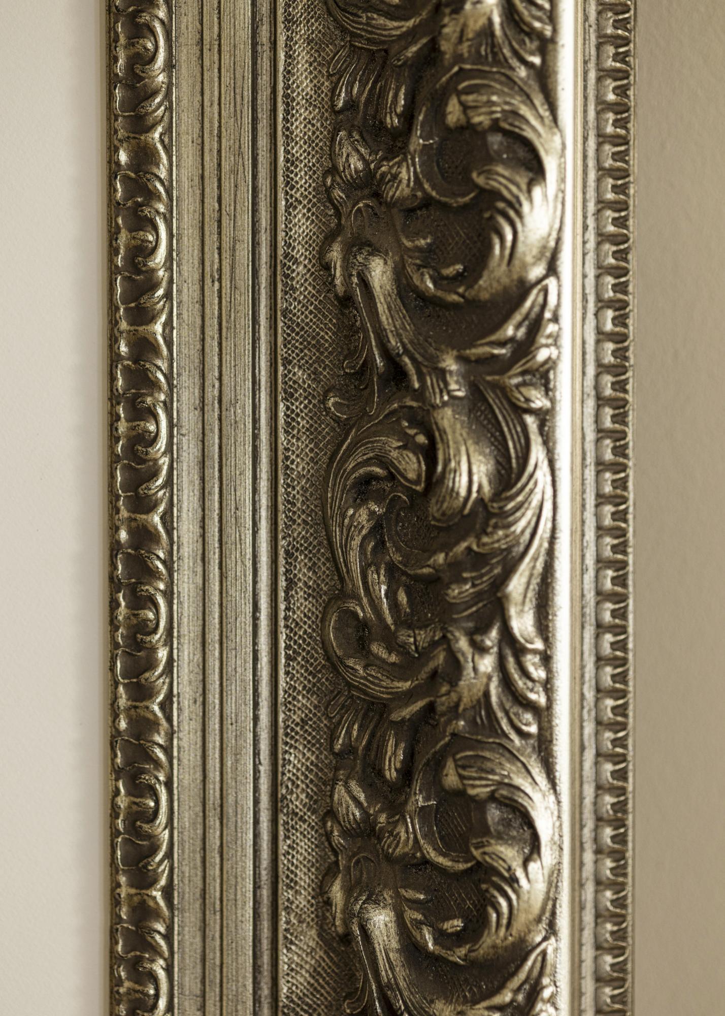 Ez a gazdagon díszített keret antikezüstben bonyolult részletekkel és gyönyörű patinával rendelkezik, amely eleganciát és időtlenséget sugároz. A mély dombormű kiemeli a domborított levélmintákat, így tökéletes választássá válik klasszikus motívumokhoz és olyan keretezésekhez, amelyek megkövetelik a jellegzetes és dekoratív képkeretet.