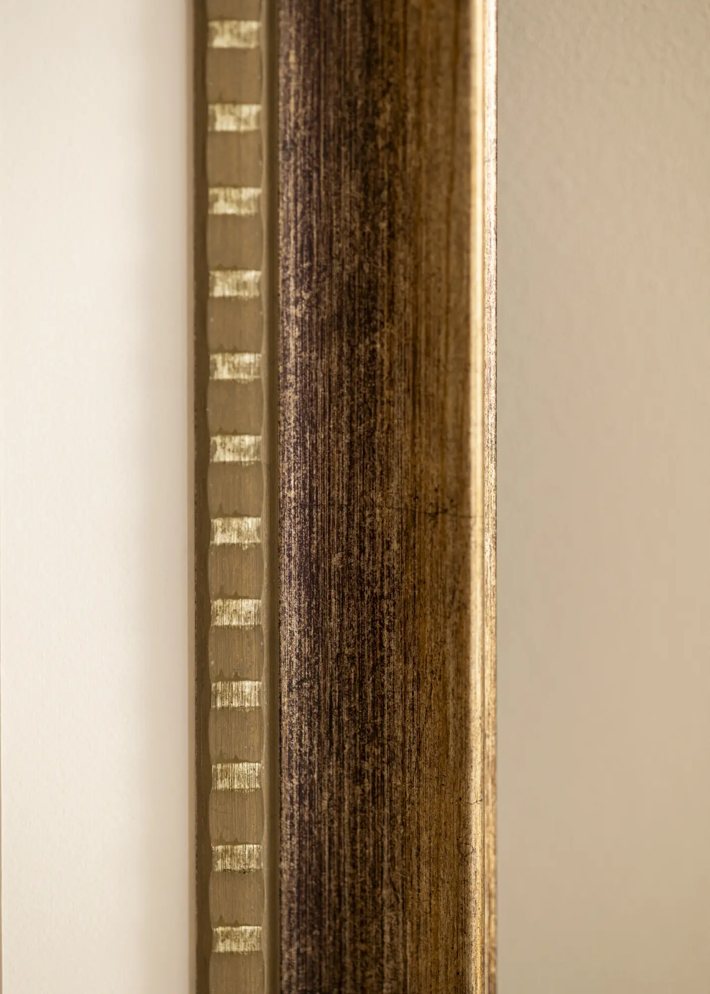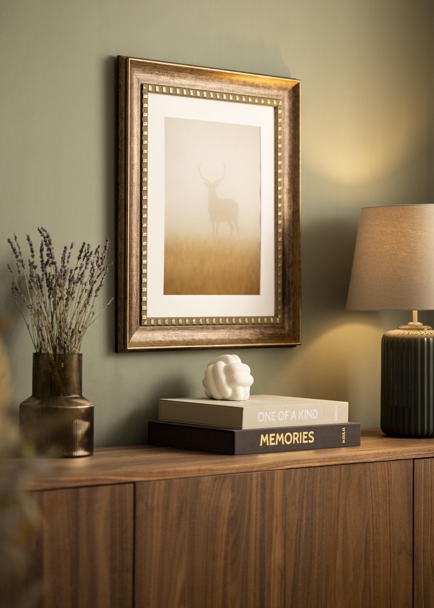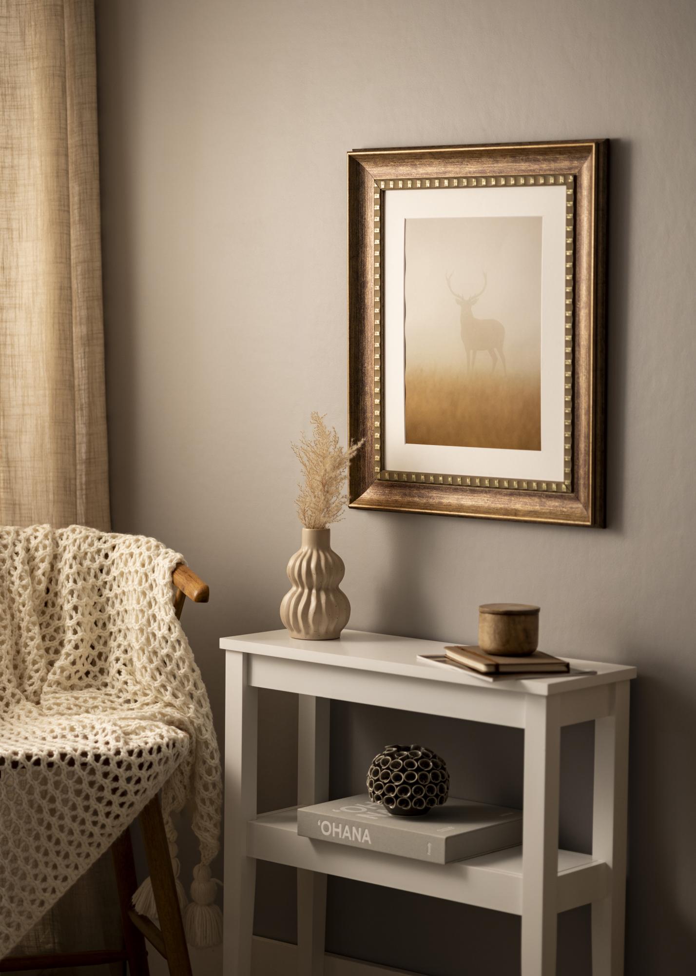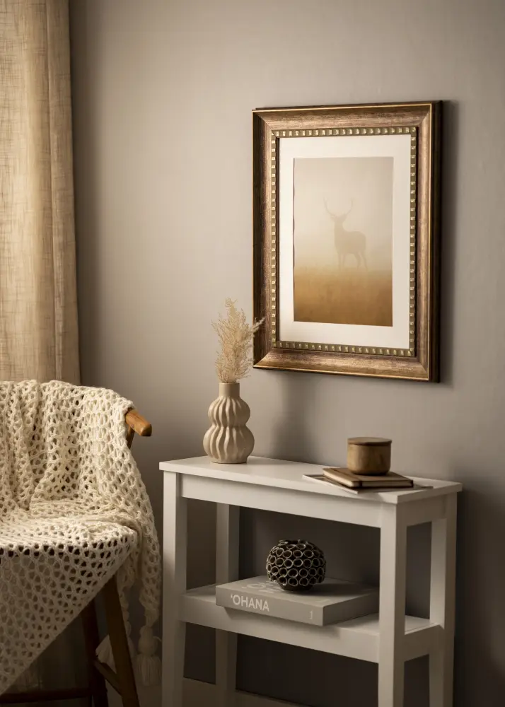 A Camden Silver meleg barna színű, finom antik felülettel, amely rusztikus jelleget kölcsönöz neki. Felülete enyhén erezett, amely a természetes fa textúráját utánozza, erősítve ezzel a vintage megjelenést. A dekoratív belső szélt apró, szabályos aranyszínű részletek díszítik, amelyek elegáns kontrasztot jelentenek a sötétebb fa árnyalattal. A külső szél lágyan lecsapott, diszkrét aranybevonattal, ami luxus és időtlen érzetet kelt.