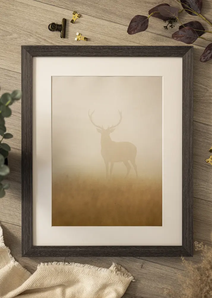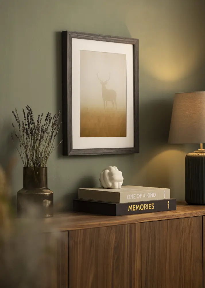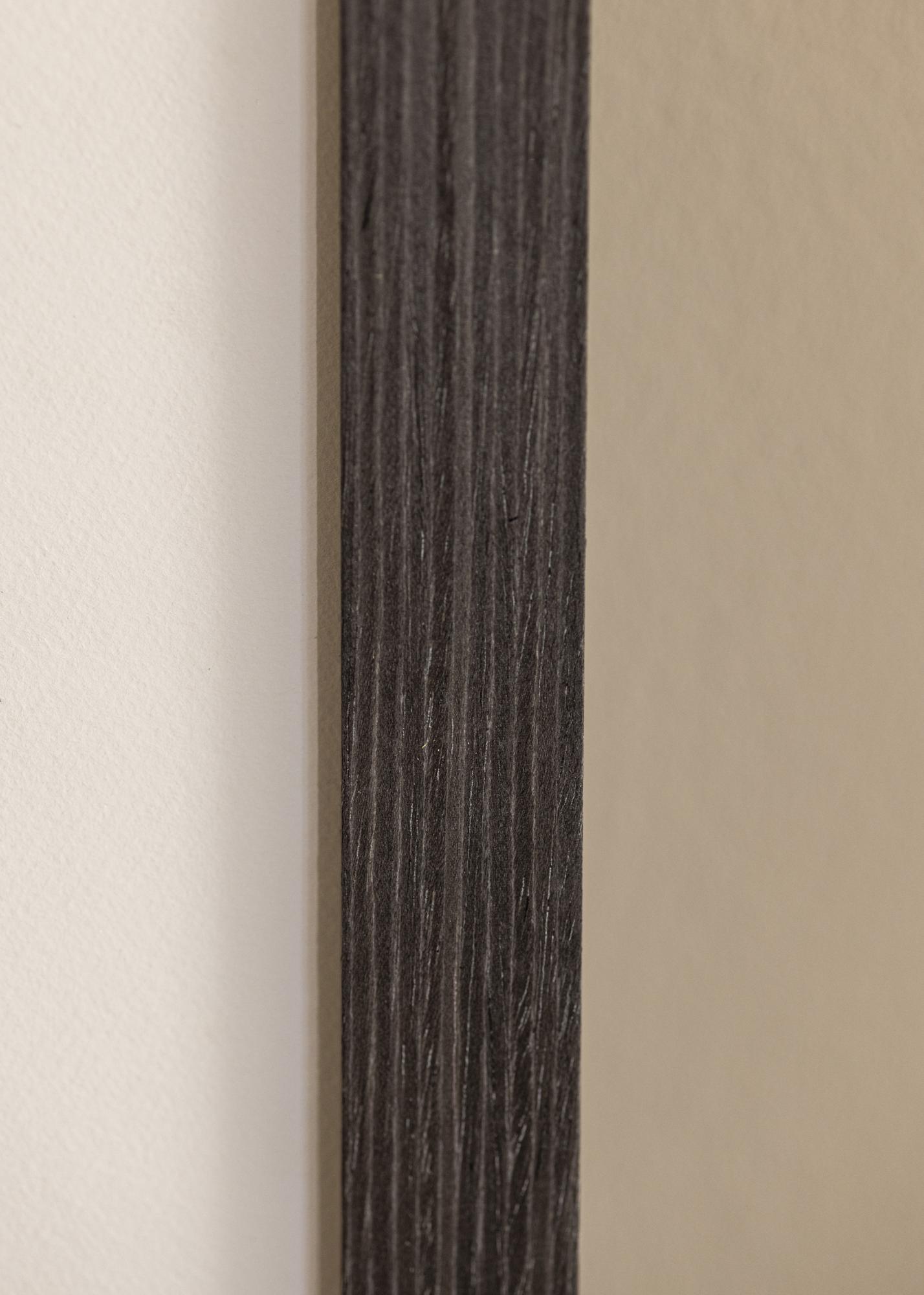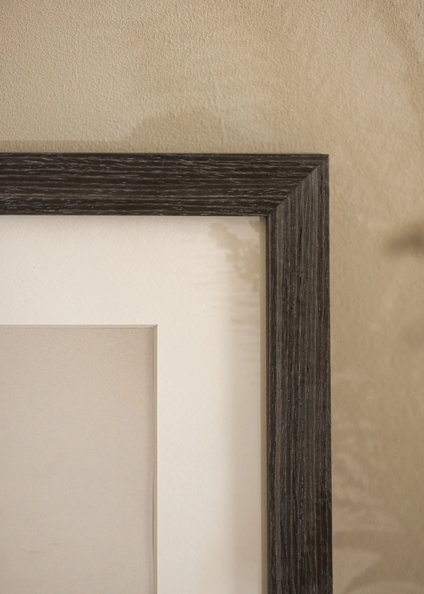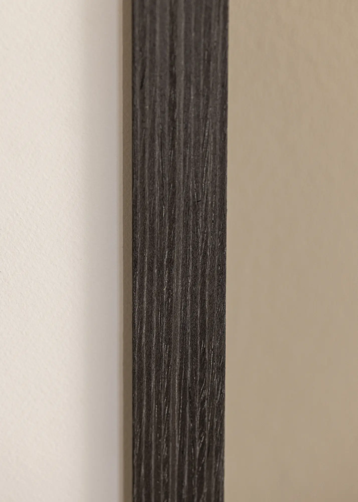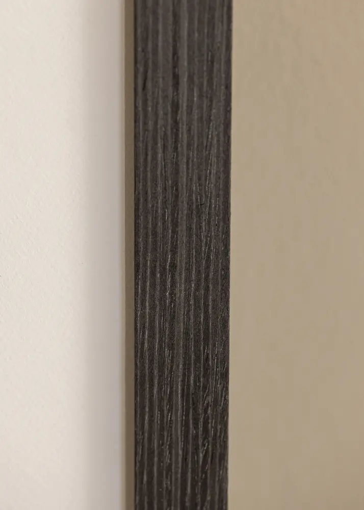 Ez a képkeret fenyőből készül, és sötét fa felületkezeléssel rendelkezik, jól látható szálas szerkezettel. A mély, majdnem fekete-barna árnyalat lehetővé teszi, hogy a fa természetes textúrája megjelenjen egy enyhén matt felület mögött, ami fokozza annak természetes megjelenését. A keskeny és egyenes profil diszkrét és stílusos megjelenést kölcsönöz, amely a legtöbb környezetben megállja a helyét.