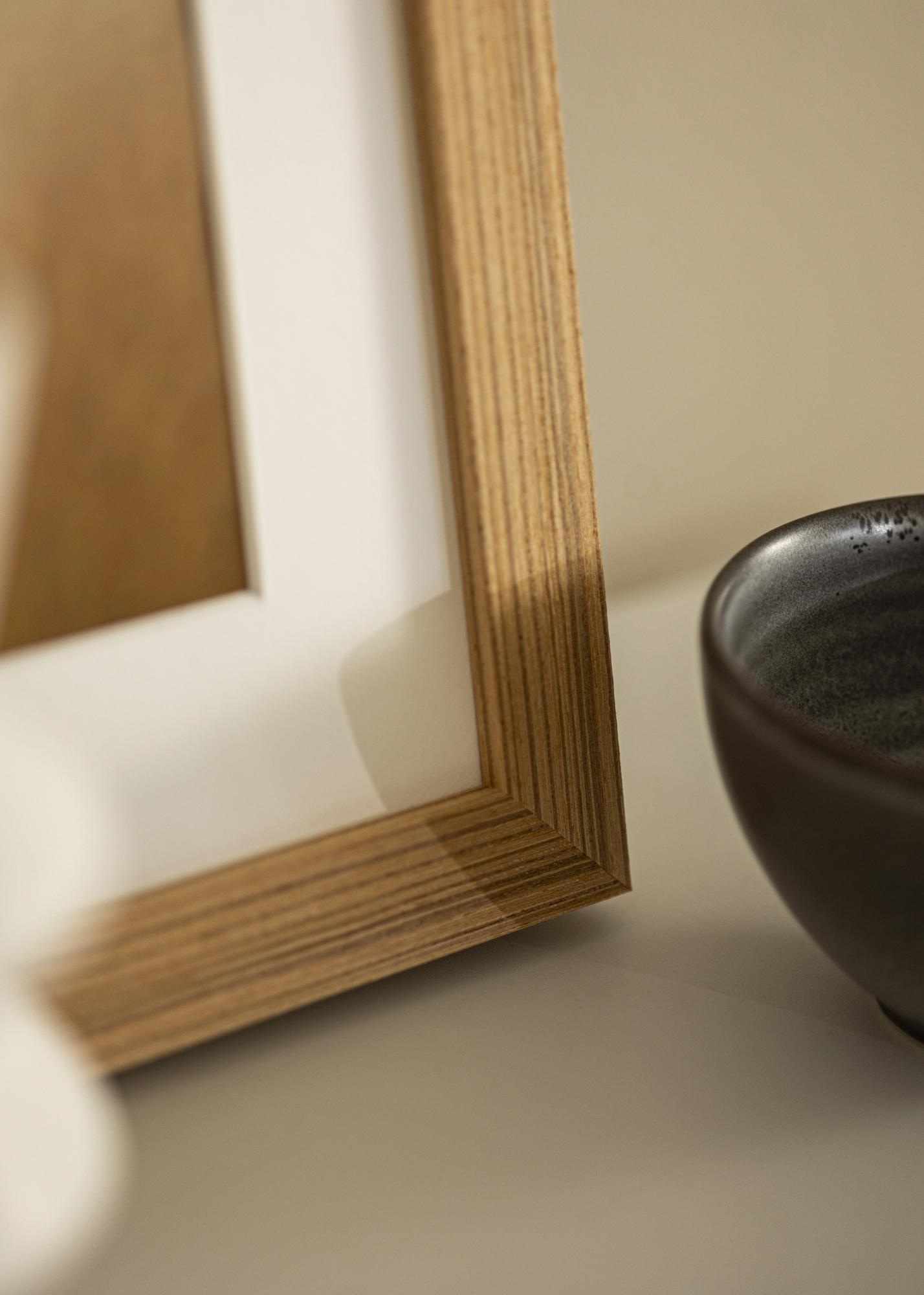 A 28 mm széles keretléc és a 33 mm mélység robusztus és stabil érzést ad a keretnek. A tiszta függőleges erezet erősíti a fa érzését és élénk struktúrát hoz létre. A matt felület kiemeli a tölgy természetes váltakozásait anélkül, hogy tükröződő hatásokat keltene, így ideális a kedvenc képek zavarmentes bemutatására.