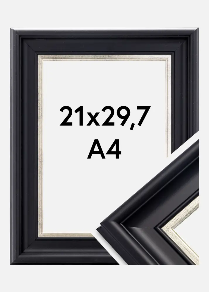 Dalarna Fekete-Ezüst egy igazán exkluzív képkeret, melynek széles, fekete profilja egészen 58 mm, és egy elegáns ezüstszínű szegély kapcsolódik közvetlenül a motívumhoz. Tökéletes választás, ha egy díszes keretet keresel, amit szívesen felakasztanál a nappali falára, és amely remekül kiemeli a legszebb képeidet. A keret a Galleri1 svéd gyártású terméke, ami garantálja a szép svéd dizájnt és a magas minőséget.