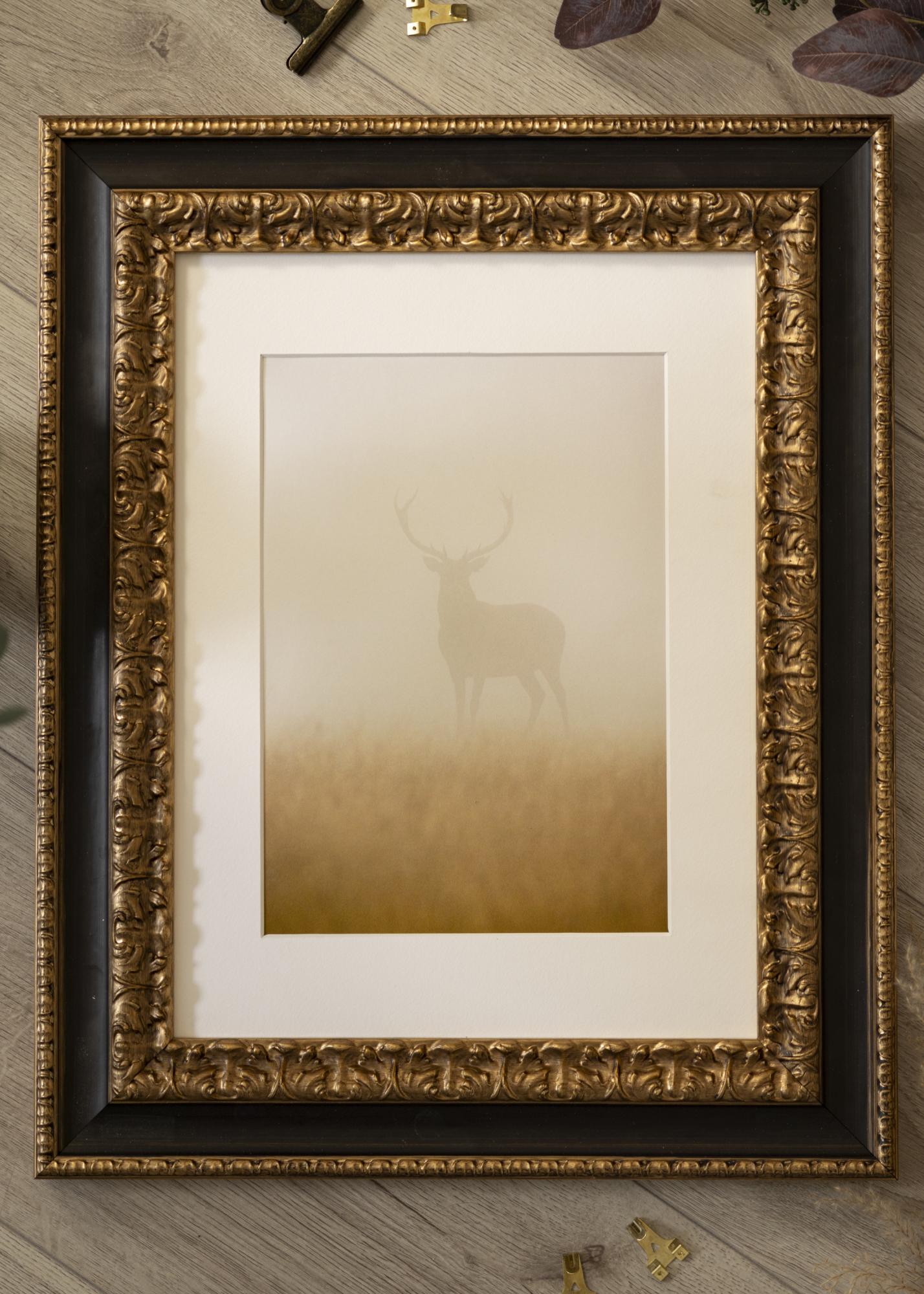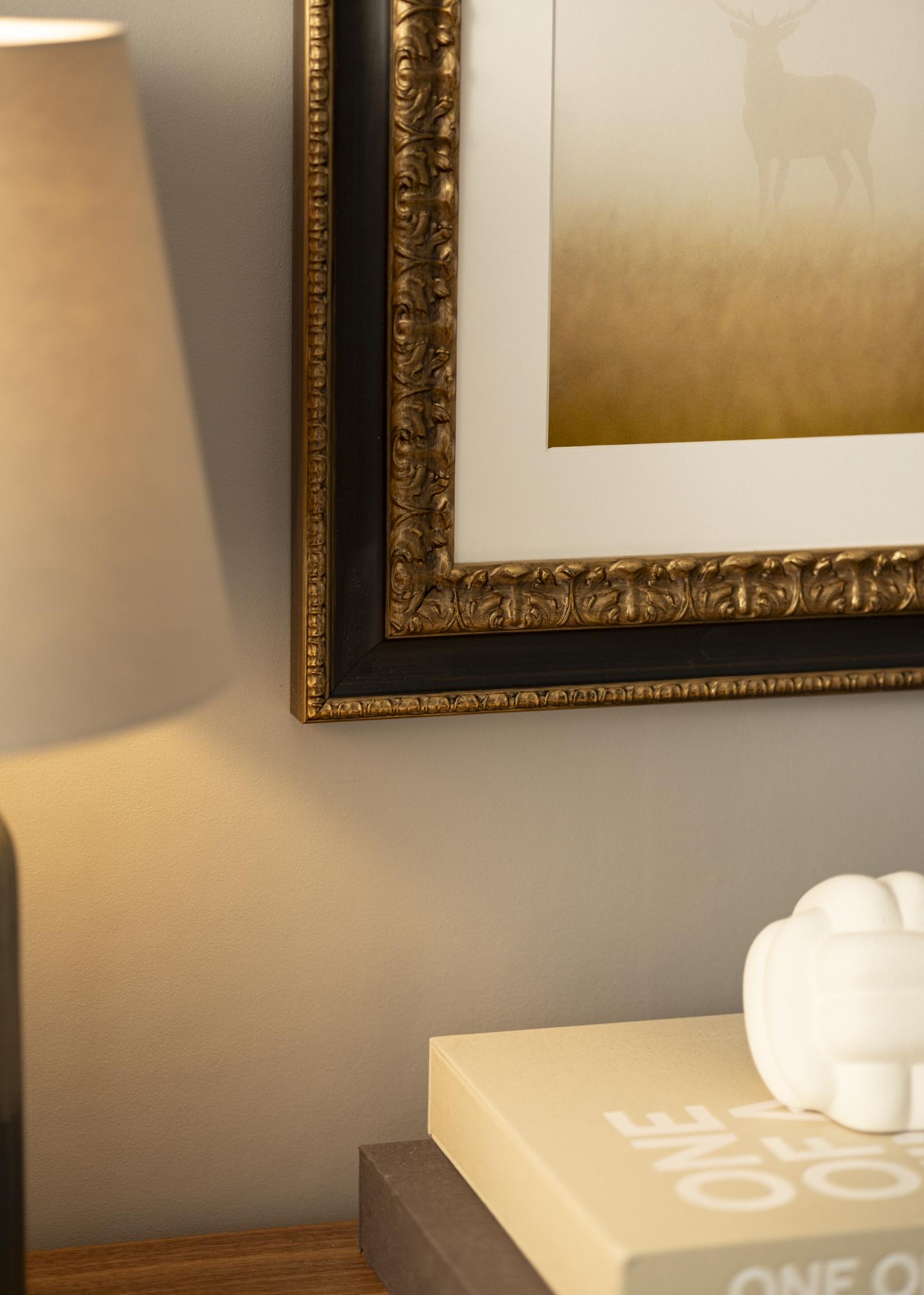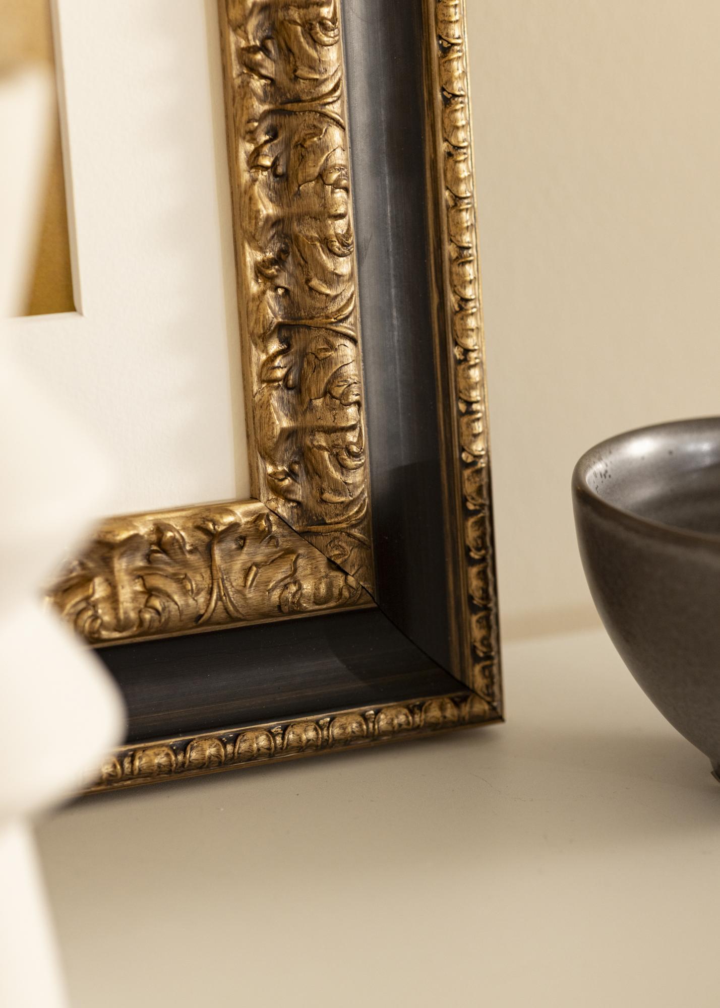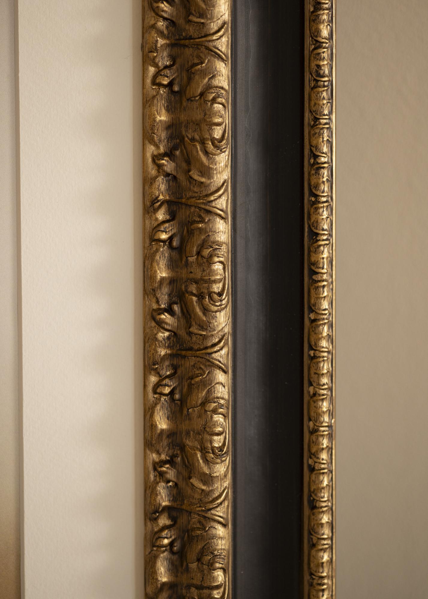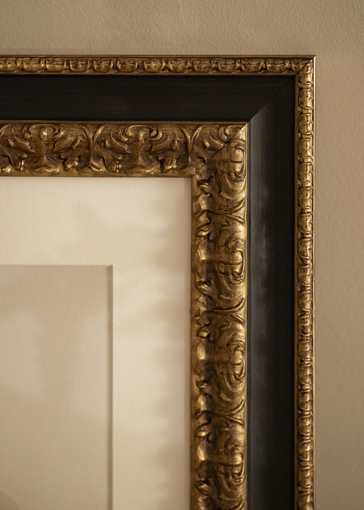 "Drottningholm Guld" egy szép, olaszországi retro képkeret ujjakkal illesztett fenyőfából, amely kézzel festett. A keret gazdagon díszített aranyprofilú, széles fekete széllel, amely elegáns érzést kölcsönöz neki. Tökéletes mindenféle retro stílusú keretezéshez.