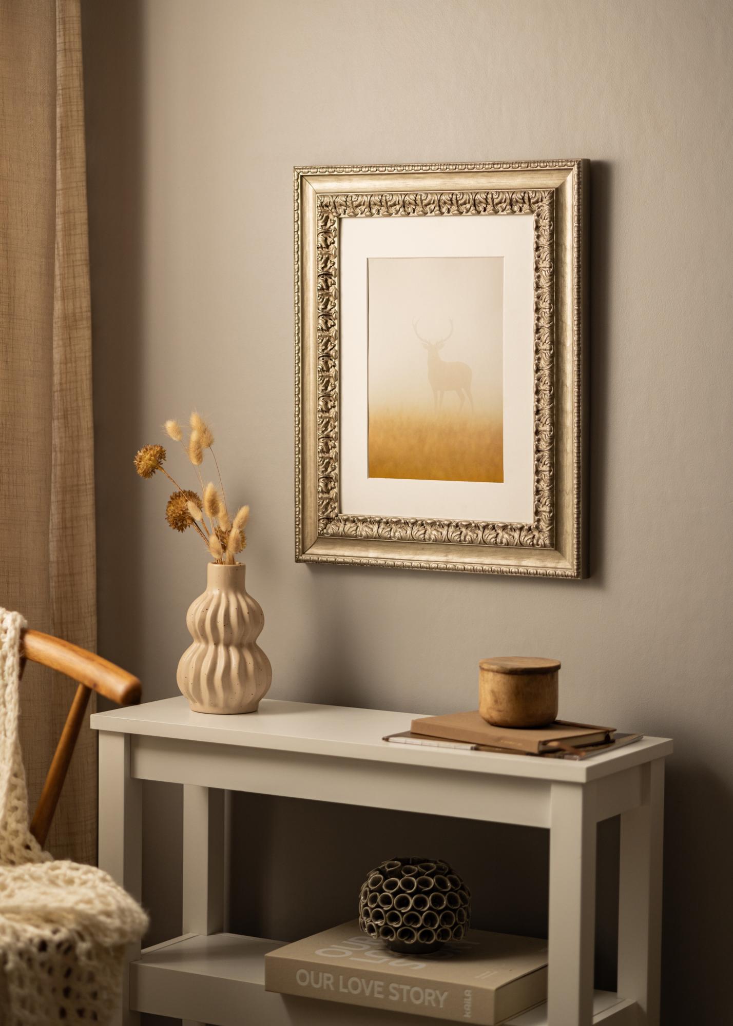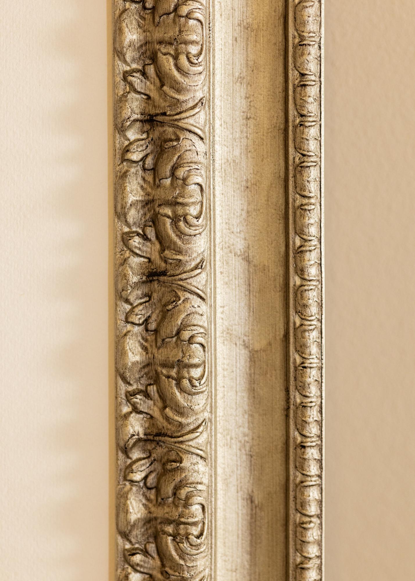 Fa anyagból készült ez a képkeret antik arany árnyalattal rendelkezik, enyhén patinázott felülettel, amely fokozza a klasszikus megjelenését. A részletes domborított ornamentumok a belső szél mentén elegáns kifejezést adnak, és időtlen érzést keltenek. A kefélt felület kiemeli a dekorációt, és enyhén öregített hatást kelt, amely karaktert és bájt kölcsönöz minden bekeretezett tárgynak.