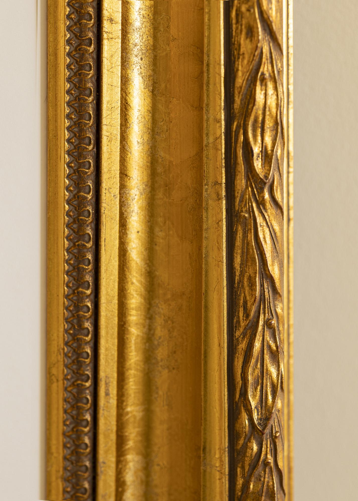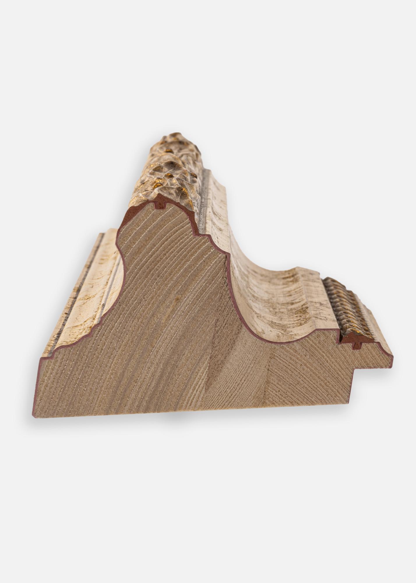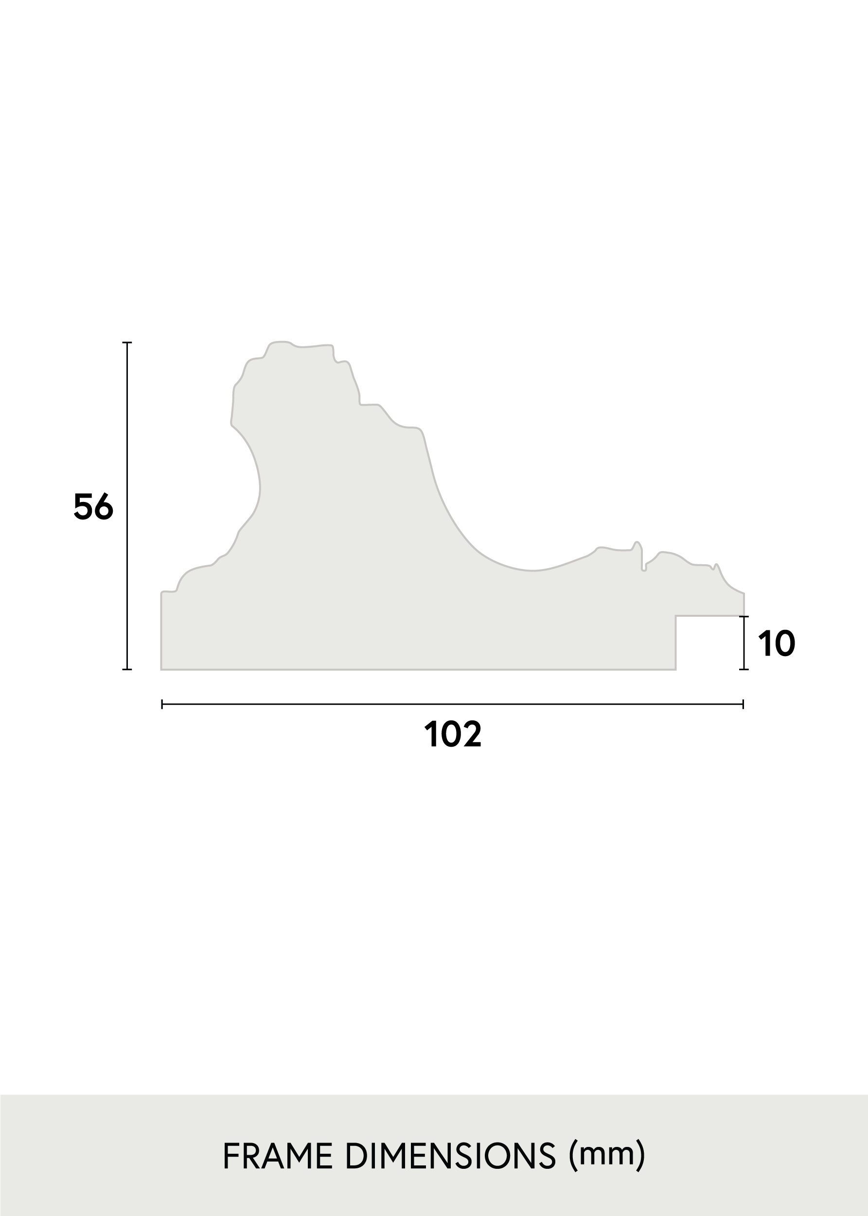 A 102 mm széles profil lenyűgöző jelenlétet kölcsönöz a keretnek, míg a 56 mm mélység robusztus és stabil keretezést biztosít. A belső szél mentén végigfutó apró gyöngyszerű díszek finom, klasszikus érintést adnak, ami fokozza az összhatást. A külső szél hullámos levélmintával díszített, amely kifinomult és időtlen karaktert kölcsönöz a keretnek.