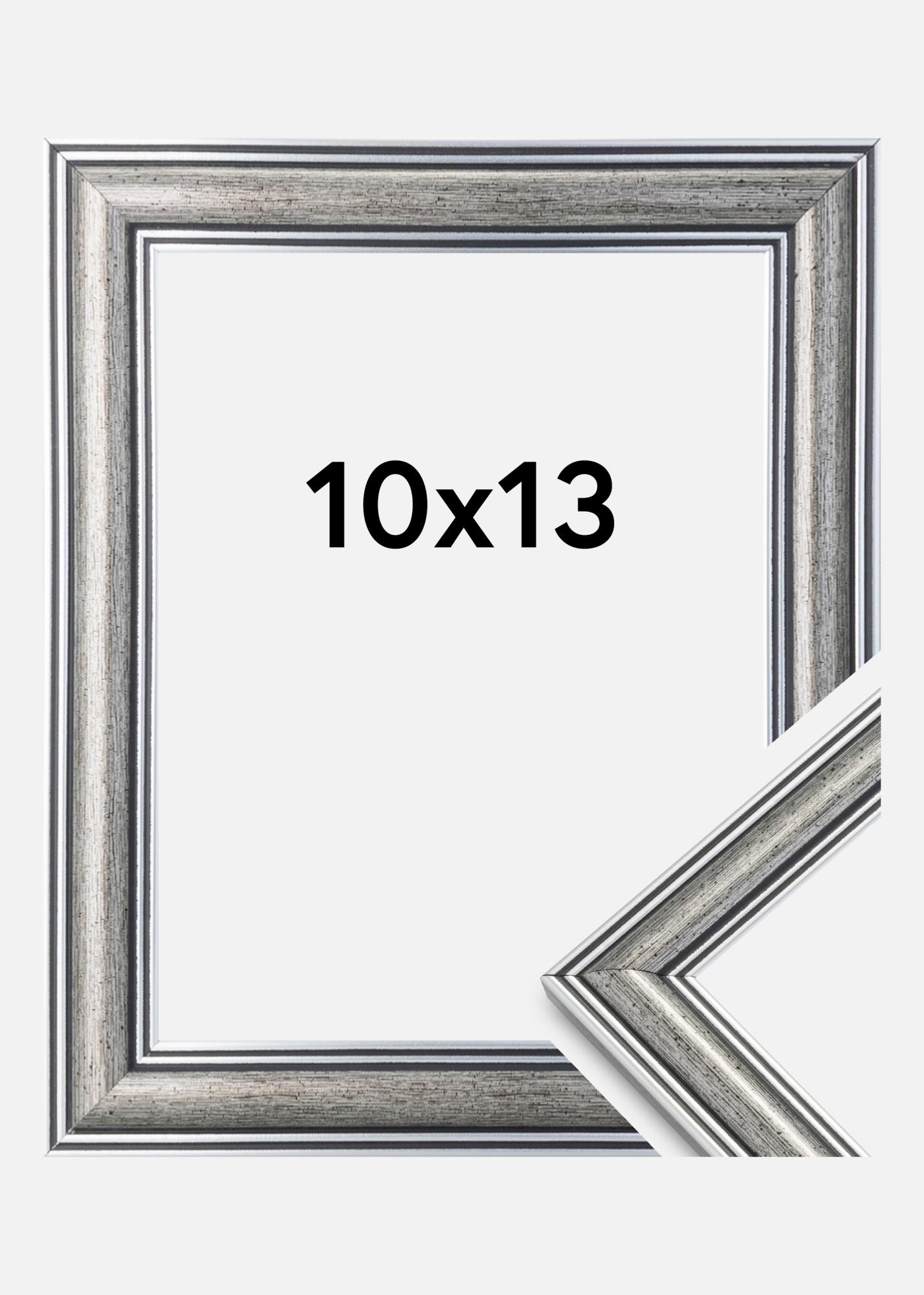 A Frigg egy ezüst keret fekete vonalakkal és fekete pöttyökkel. Kiválóan alkalmas, ha széles, hagyományos ezüst keretet keresel, amely sokféle képhez és környezethez illik.