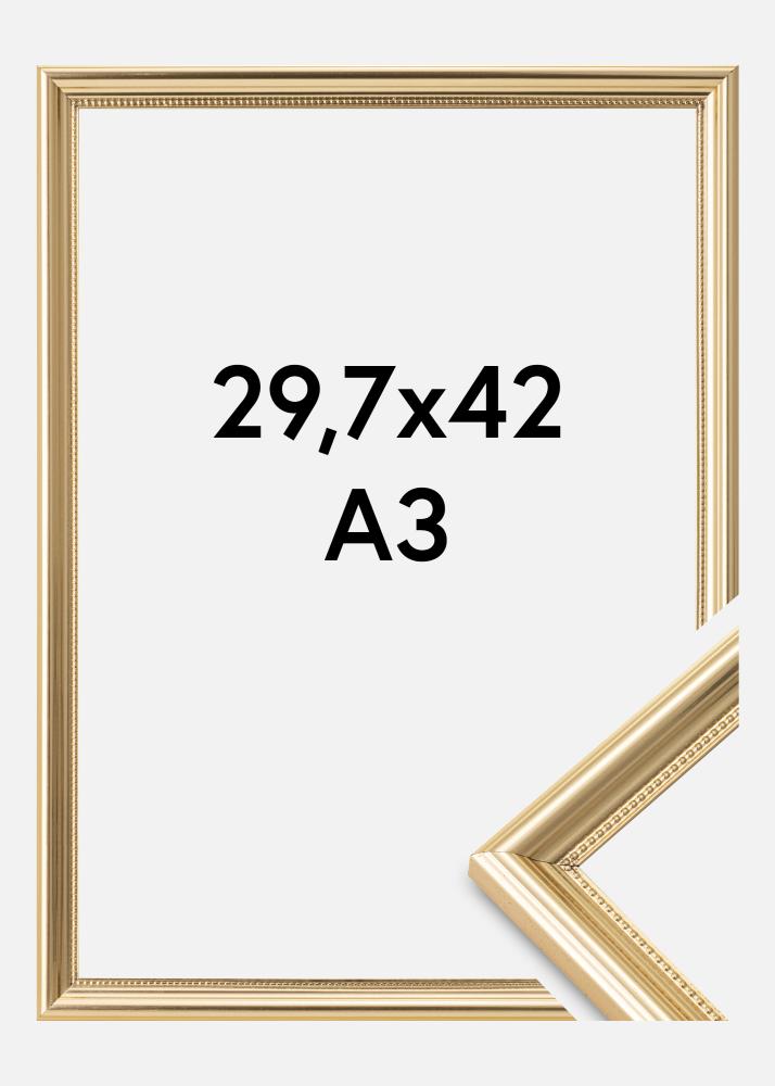 Adj egy kis eleganciát a falaknak ezzel a 29,7x42 cm-es (A3) aranyszínű fényképkerettel. A retró stílusú, profilozott keretével klasszikus bájt kölcsönöz otthonodnak. A keret szélessége 20 mm, mélysége pedig 17 mm, ami különleges és kifinomult szegélyt biztosít kedvenc képeidnek vagy műalkotásaidnak.